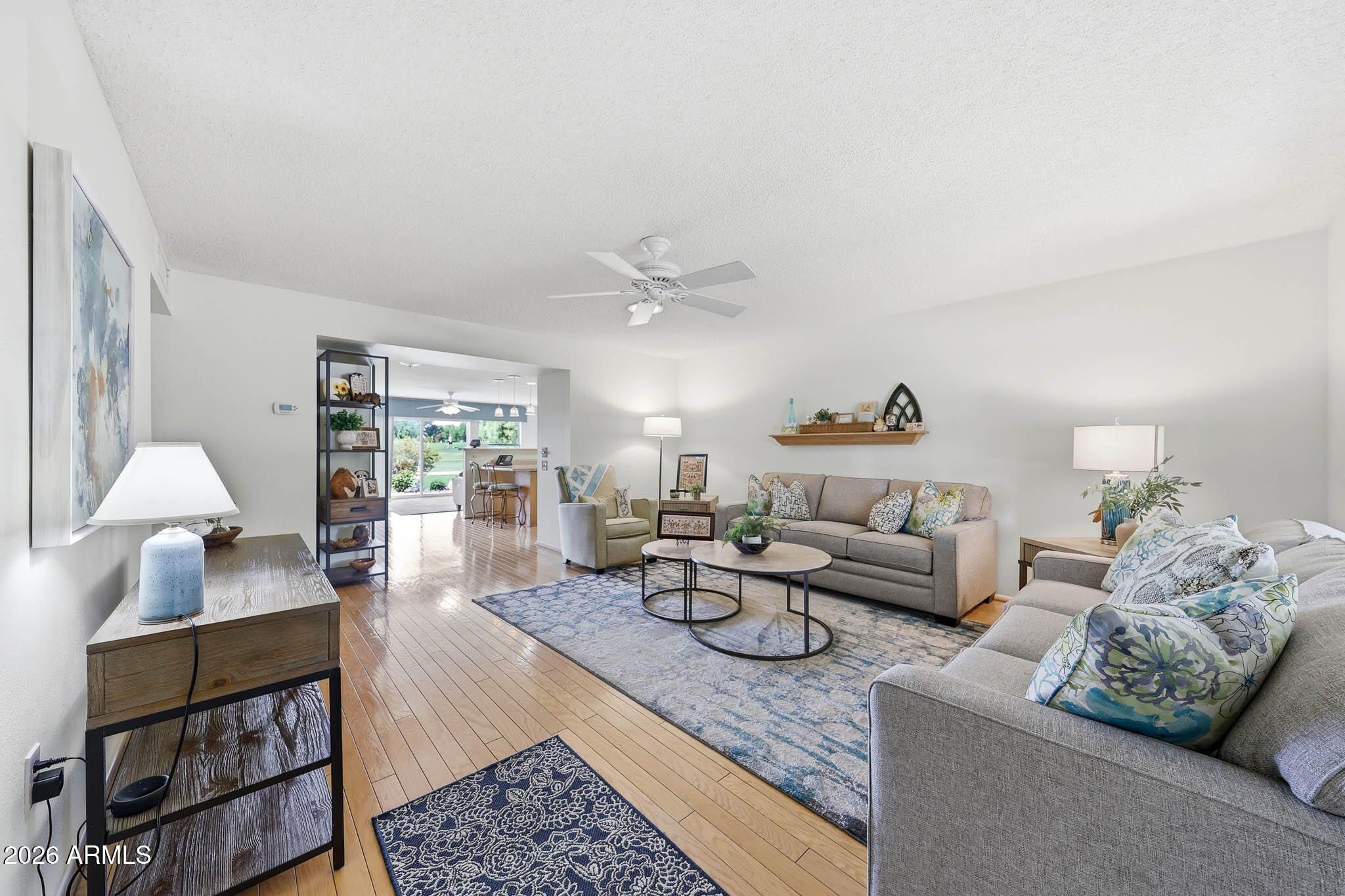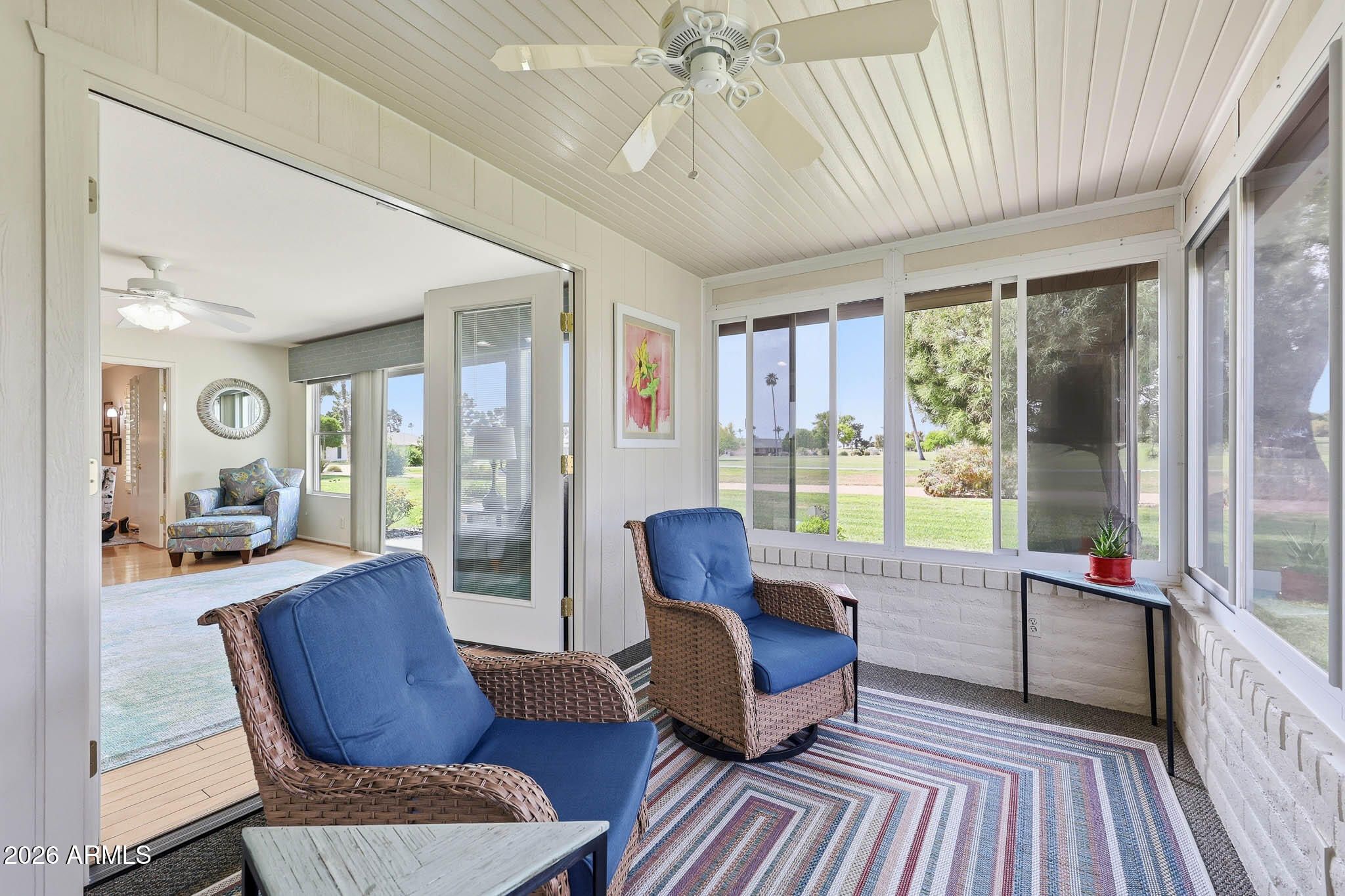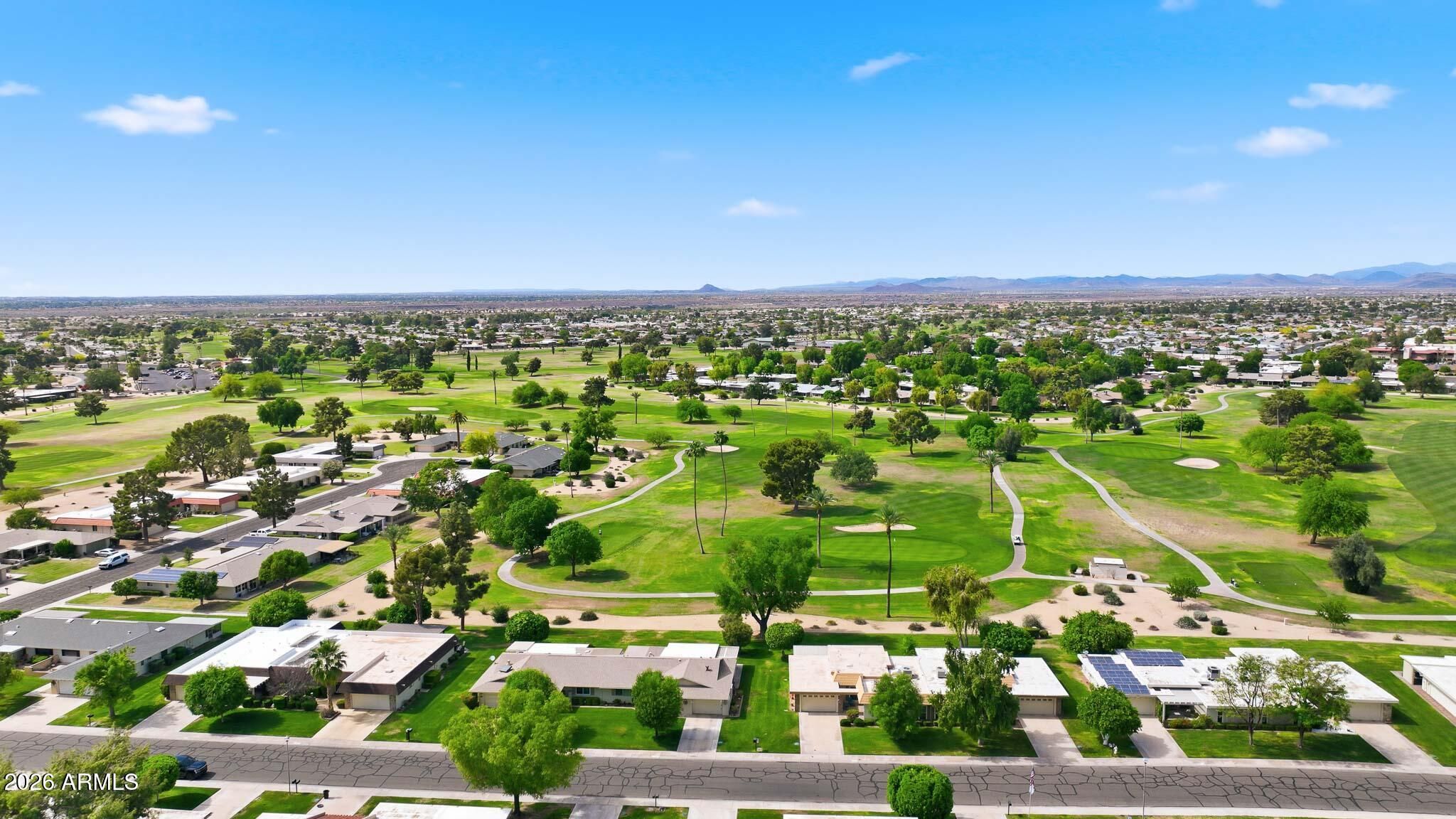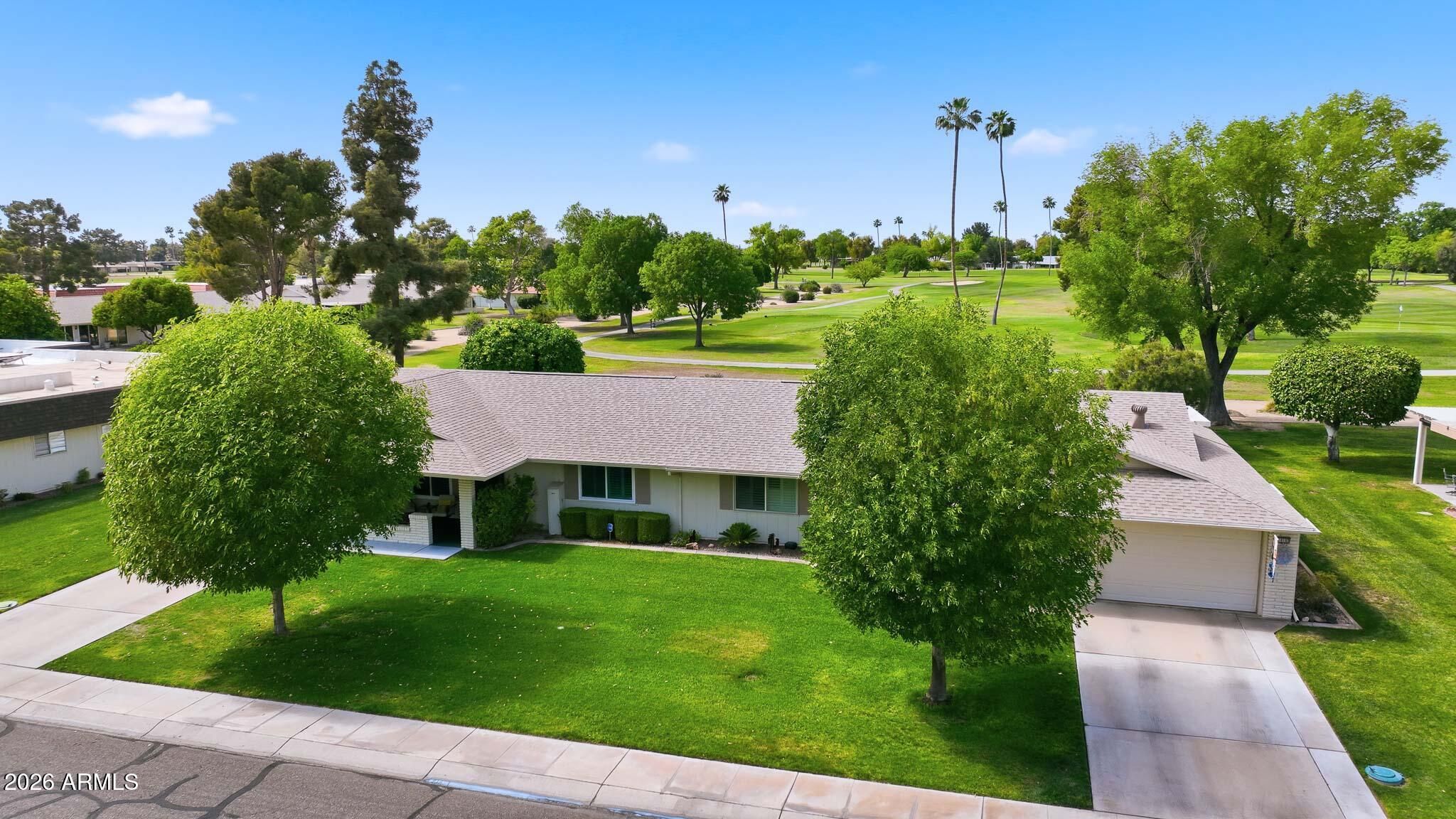 Don't Miss This Expanded Gemini Twin Home On A Golf Course Lot In Sun City, Arizona, Phase 3. From The Moment You Walk In, You Can See Straight Through The Home To One Of The Best Golf Course Views Around. Several Solar Tubes And Skylights Bring In Wonderful Natural Light, Making The Home Feel Bright, Cheerful, And Inviting. The Added Arizona Room Features A Wall Of Windows With Expansive Golf Course Views, Creating A Beautiful Space To Relax, Entertain, Or Enjoy The Sun City Lifestyle. There Is Also An Added Sun Room, Giving This Home Even More Flexible Living Space. Hardwood Flooring Runs Through Most Of The Home, With Tile In The Bathrooms. The Primary Bedroom Has Been Expanded, Offering Extra Space That Could Be Used As A Guest Area, Office, Craft Room, Or Hobby Space. The Kitchen Has Been Remodeled With An Open-Concept Feel With Updated Cabinets, Updated Countertops, And A Coffee Bar. Updated Windows And Roller Shield Shutters Add Comfort And Function. This Golf Course Gemini Twin Home Has A Lot To Offer And Even More To See In Person. Please Stop By And See It Soon!