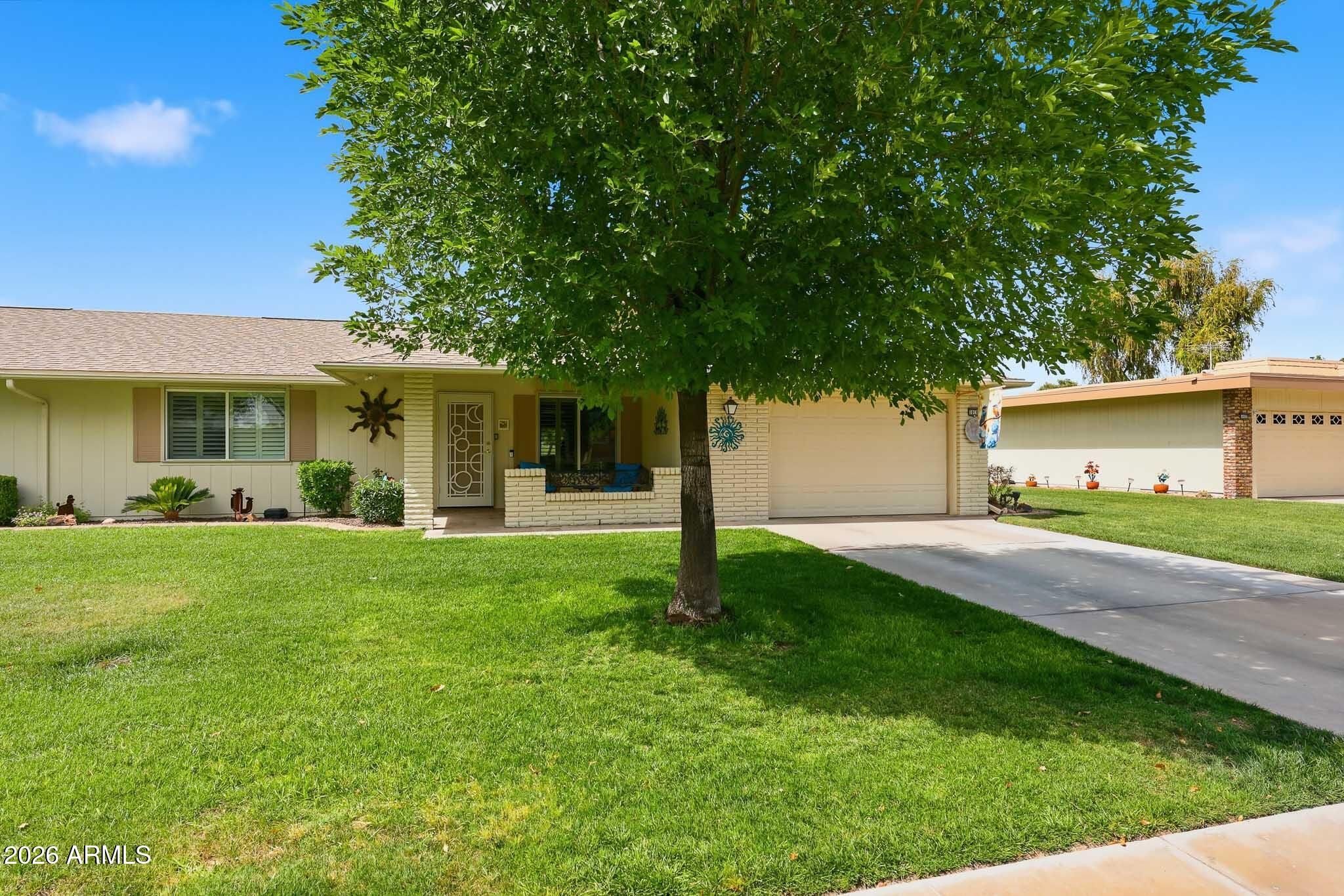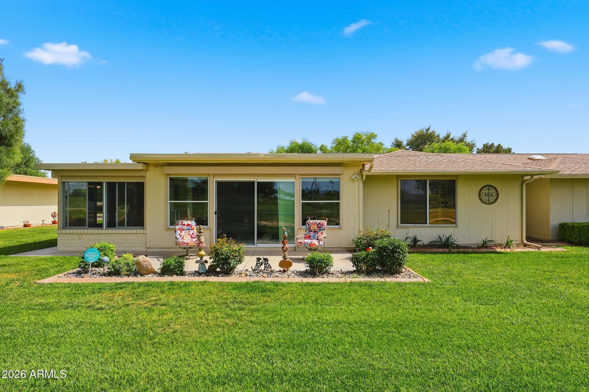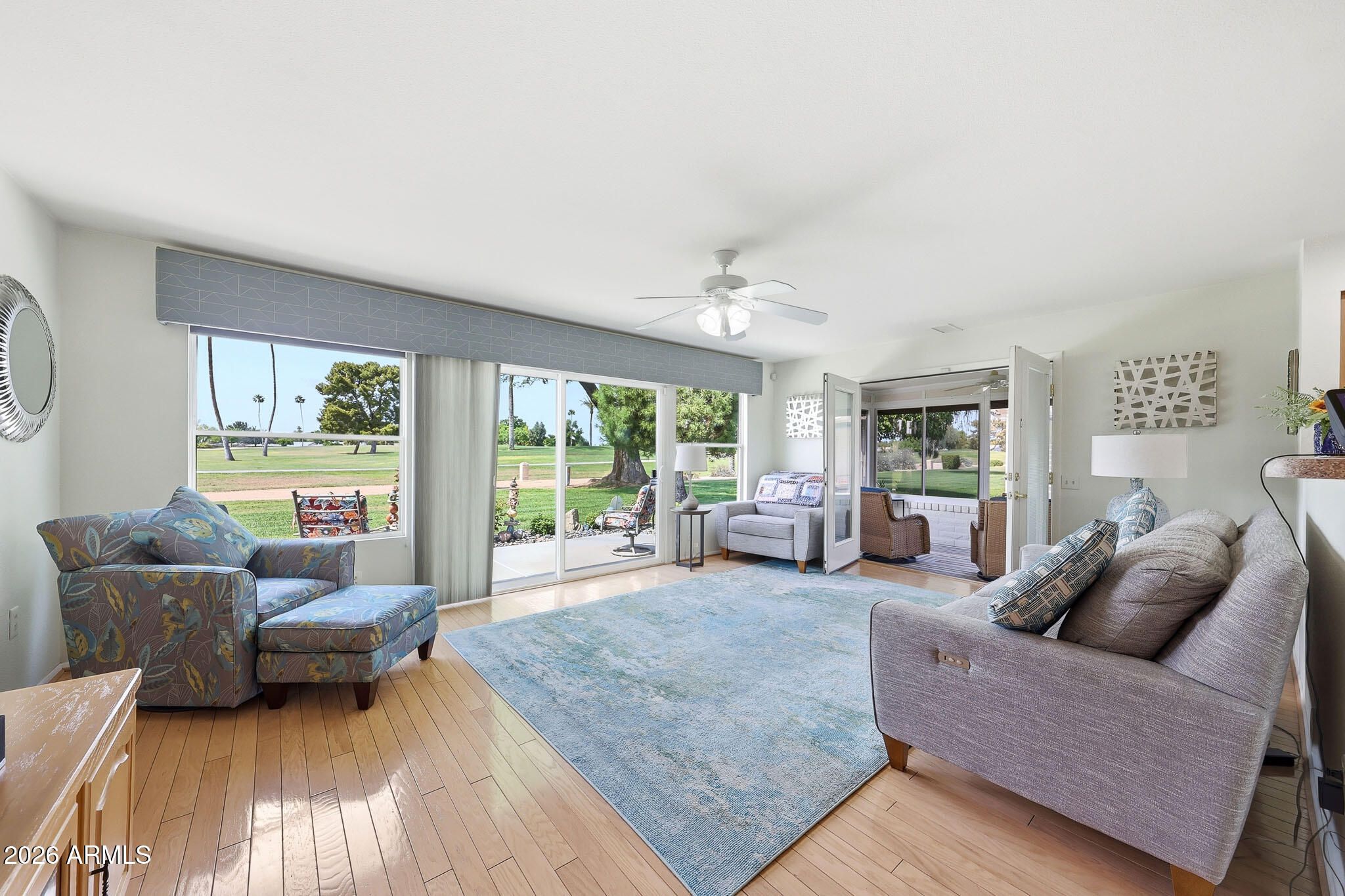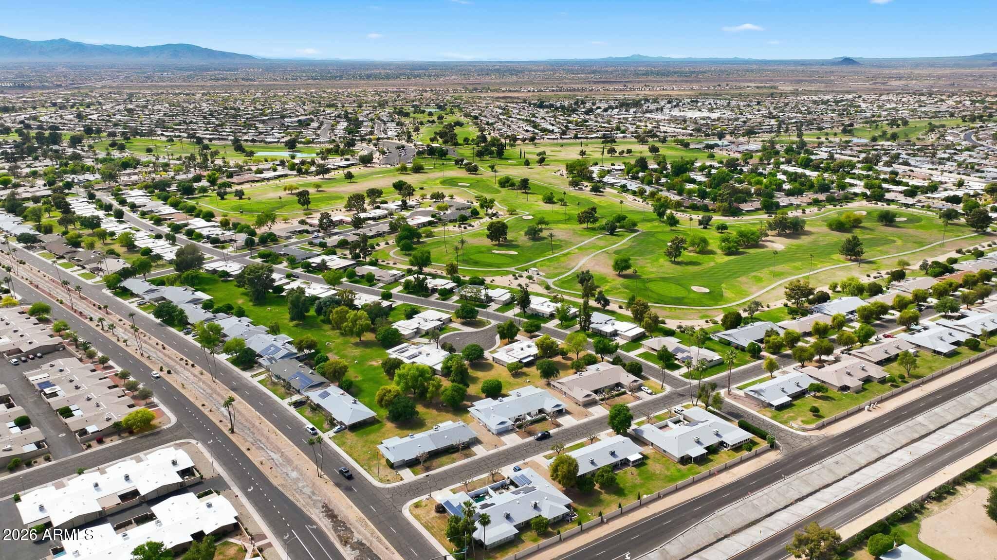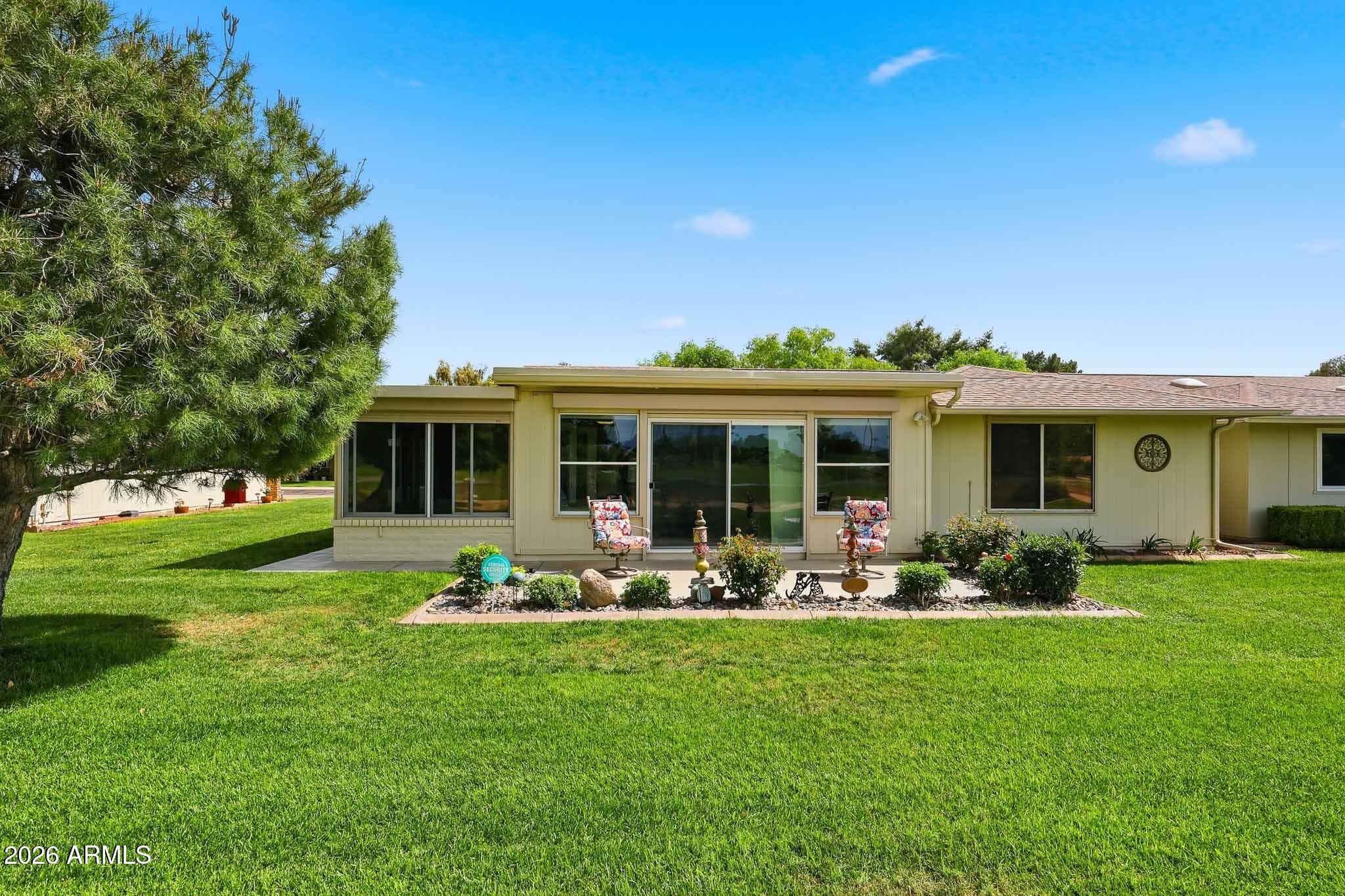 Don't Miss This Expanded Gemini Twin Home On A Golf Course Lot In Sun City, Arizona, Phase 3. From The Moment You Walk In, You Can See Straight Through The Home To One Of The Best Golf Course Views Around. Several Solar Tubes And Skylights Bring In Wonderful Natural Light, Making The Home Feel Bright, Cheerful, And Inviting. The Added Arizona Room Features A Wall Of Windows With Expansive Golf Course Views, Creating A Beautiful Space To Relax, Entertain, Or Enjoy The Sun City Lifestyle. There Is Also An Added Sun Room, Giving This Home Even More Flexible Living Space. Hardwood Flooring Runs Through Most Of The Home, With Tile In The Bathrooms. The Primary Bedroom Has Been Expanded, Offering Extra Space That Could Be Used As A Guest Area, Office, Craft Room, Or Hobby Space. The Kitchen Has Been Remodeled With An Open-Concept Feel With Updated Cabinets, Updated Countertops, And A Coffee Bar. Updated Windows And Roller Shield Shutters Add Comfort And Function. This Golf Course Gemini Twin Home Has A Lot To Offer And Even More To See In Person. Please Stop By And See It Soon!