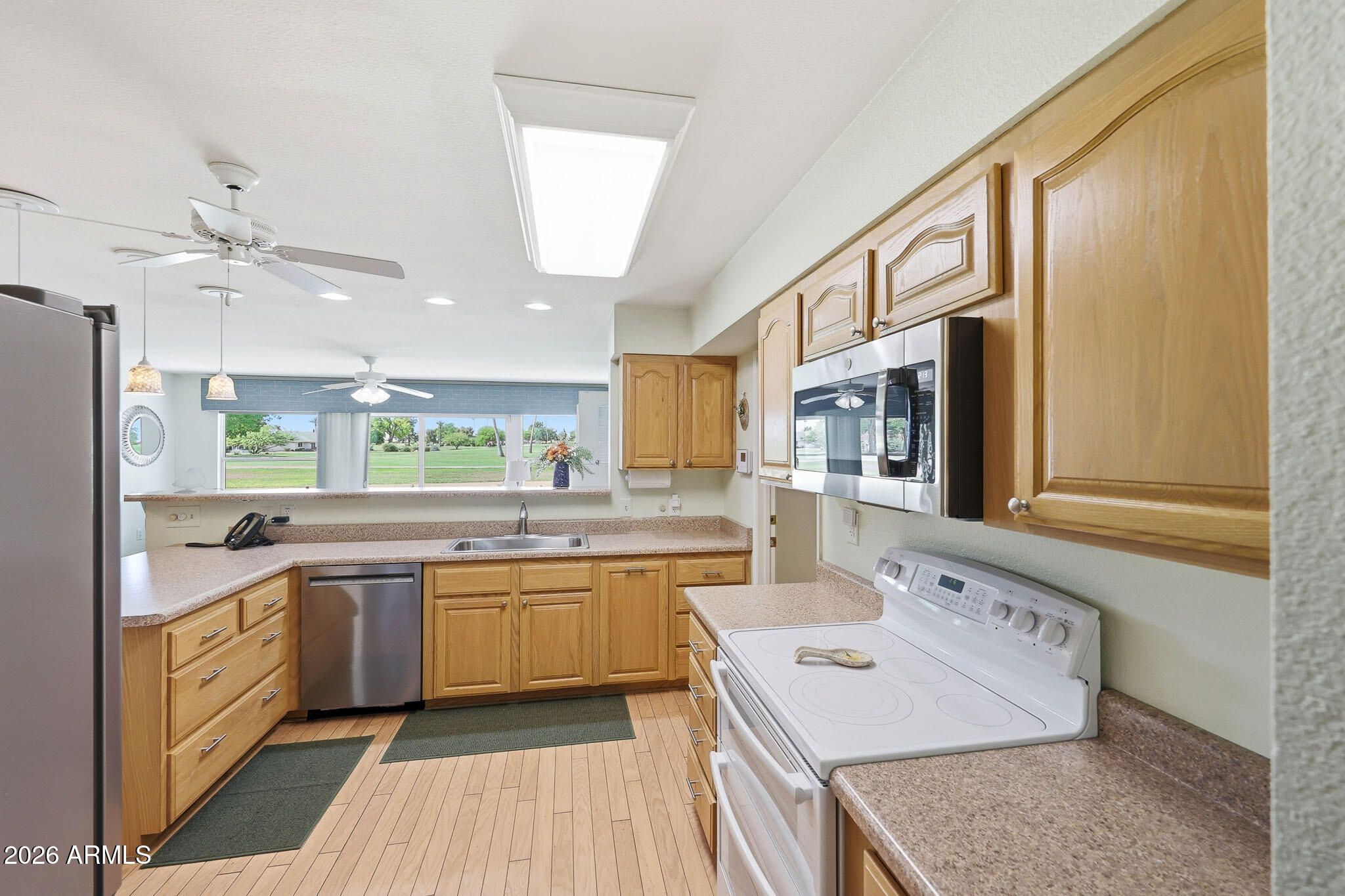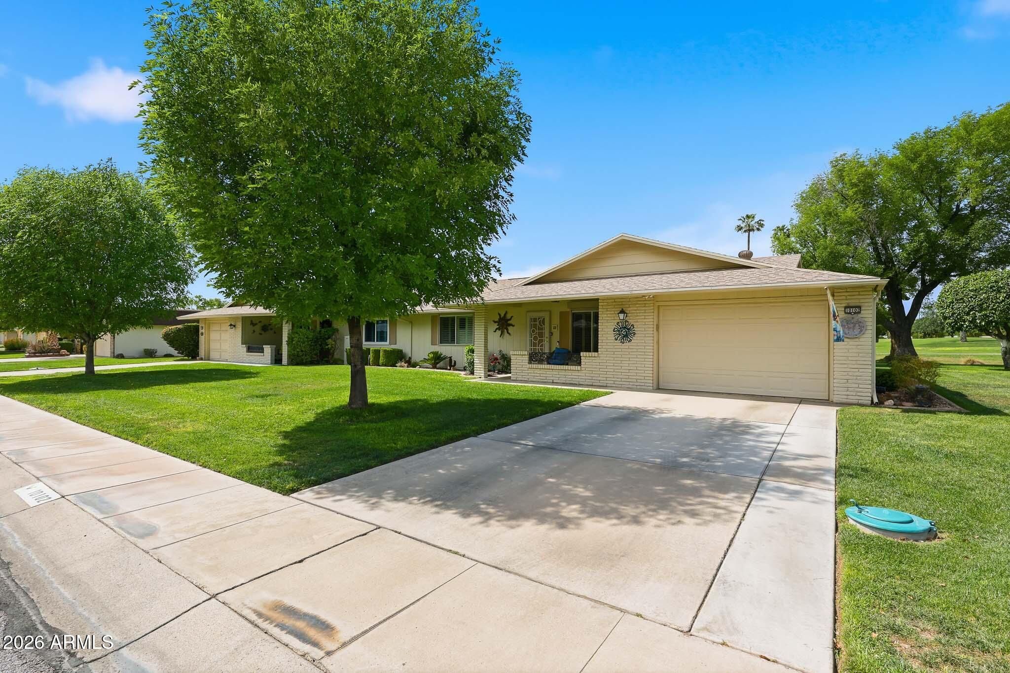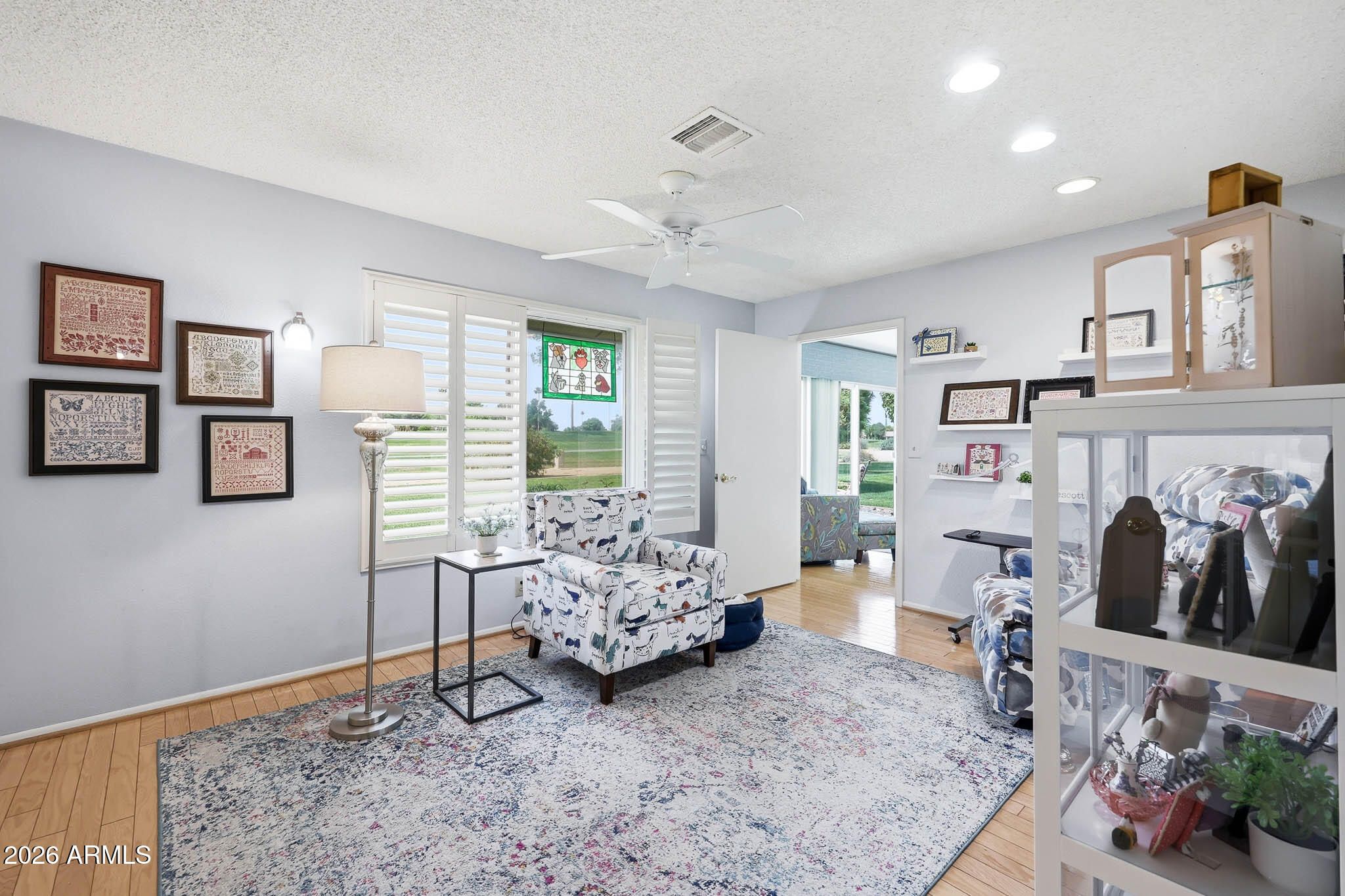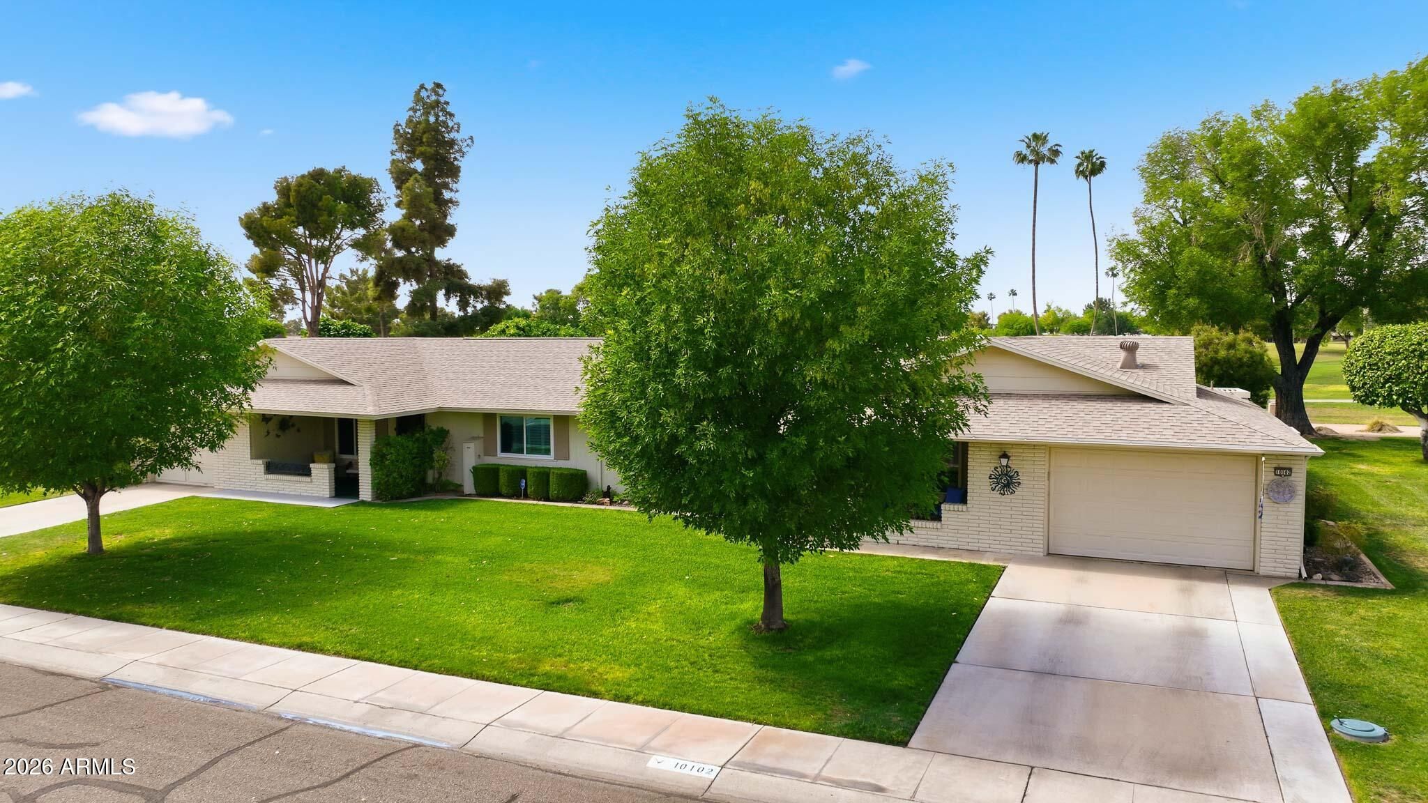 Don't Miss This Expanded Gemini Twin Home On A Golf Course Lot In Sun City, Arizona, Phase 3. From The Moment You Walk In, You Can See Straight Through The Home To One Of The Best Golf Course Views Around. Several Solar Tubes And Skylights Bring In Wonderful Natural Light, Making The Home Feel Bright, Cheerful, And Inviting. The Added Arizona Room Features A Wall Of Windows With Expansive Golf Course Views, Creating A Beautiful Space To Relax, Entertain, Or Enjoy The Sun City Lifestyle. There Is Also An Added Sun Room, Giving This Home Even More Flexible Living Space. Hardwood Flooring Runs Through Most Of The Home, With Tile In The Bathrooms. The Primary Bedroom Has Been Expanded, Offering Extra Space That Could Be Used As A Guest Area, Office, Craft Room, Or Hobby Space. The Kitchen Has Been Remodeled With An Open-Concept Feel With Updated Cabinets, Updated Countertops, And A Coffee Bar. Updated Windows And Roller Shield Shutters Add Comfort And Function. This Golf Course Gemini Twin Home Has A Lot To Offer And Even More To See In Person. Please Stop By And See It Soon!