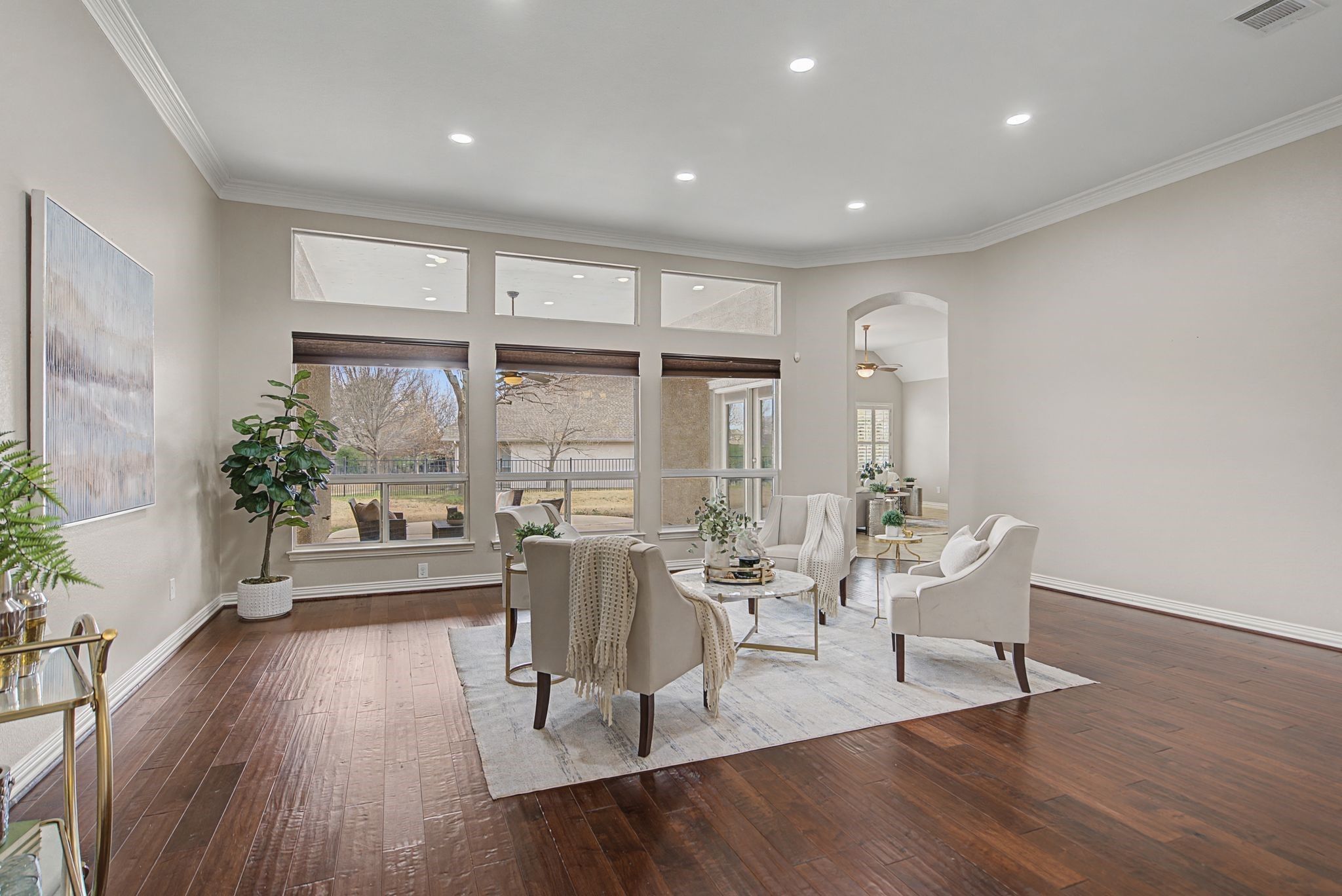 Welcome home! This spacious Sonoma floor plan is nestled along a peaceful circular greenbelt walking path, offering a relaxing view from the covered patio and fenced backyard—perfect for enjoying morning coffee or evening sunsets. This thoughtfully designed home features three bedrooms, two full baths, and a full three-car garage, complemented by wood floors, soaring ceilings, and elegant crown molding throughout. The oversized primary suite includes a comfortable sitting area, separate vanities, and a seated makeup station, creating a true private retreat. The second bedroom offers a walk-in closet, while the third bedroom provides flexibility—ideal as a home office, craft room, or guest bedroom. Every space is designed with comfort, functionality, and easy living in mind. This home offers the perfect blend of comfort and versatility, Enjoy golf course living in one of the community’s most desirable locations, which offers so many amenities. There is something for everyone: Pickleball, tennis, pool, golf, bocce, restaurant, numerous clubs and much more.