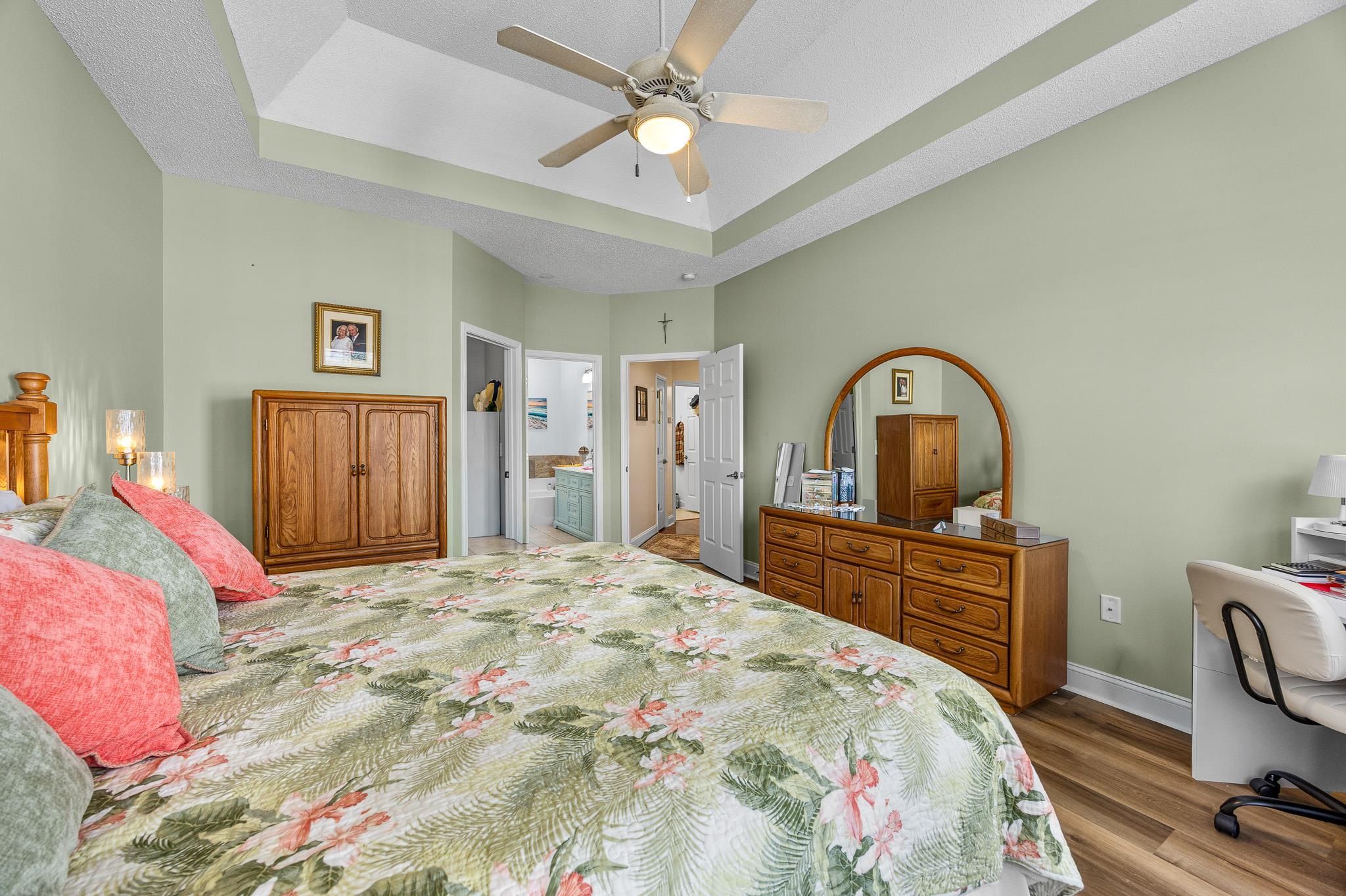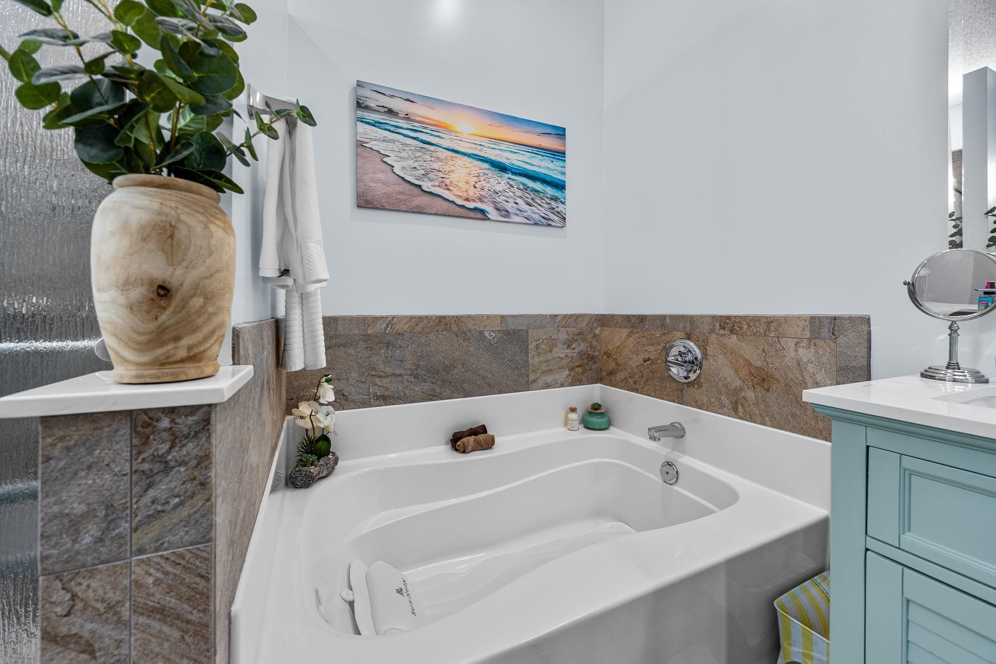 - Attic Access, Tray Ceiling(s), Ceiling Fan(s), Dual Sinks, Garden Tub/Roman Tub, Main Level Primary, Pull Down Attic Stairs, Permanent Attic Stairs, Split Bedrooms, Separate Shower, Vanity, Walk-In Closet(s), Window Treatments, Breakfast Bar, Bedroom on Main Level, Breakfast Area, Entrance Foyer, Solid Surface Counters