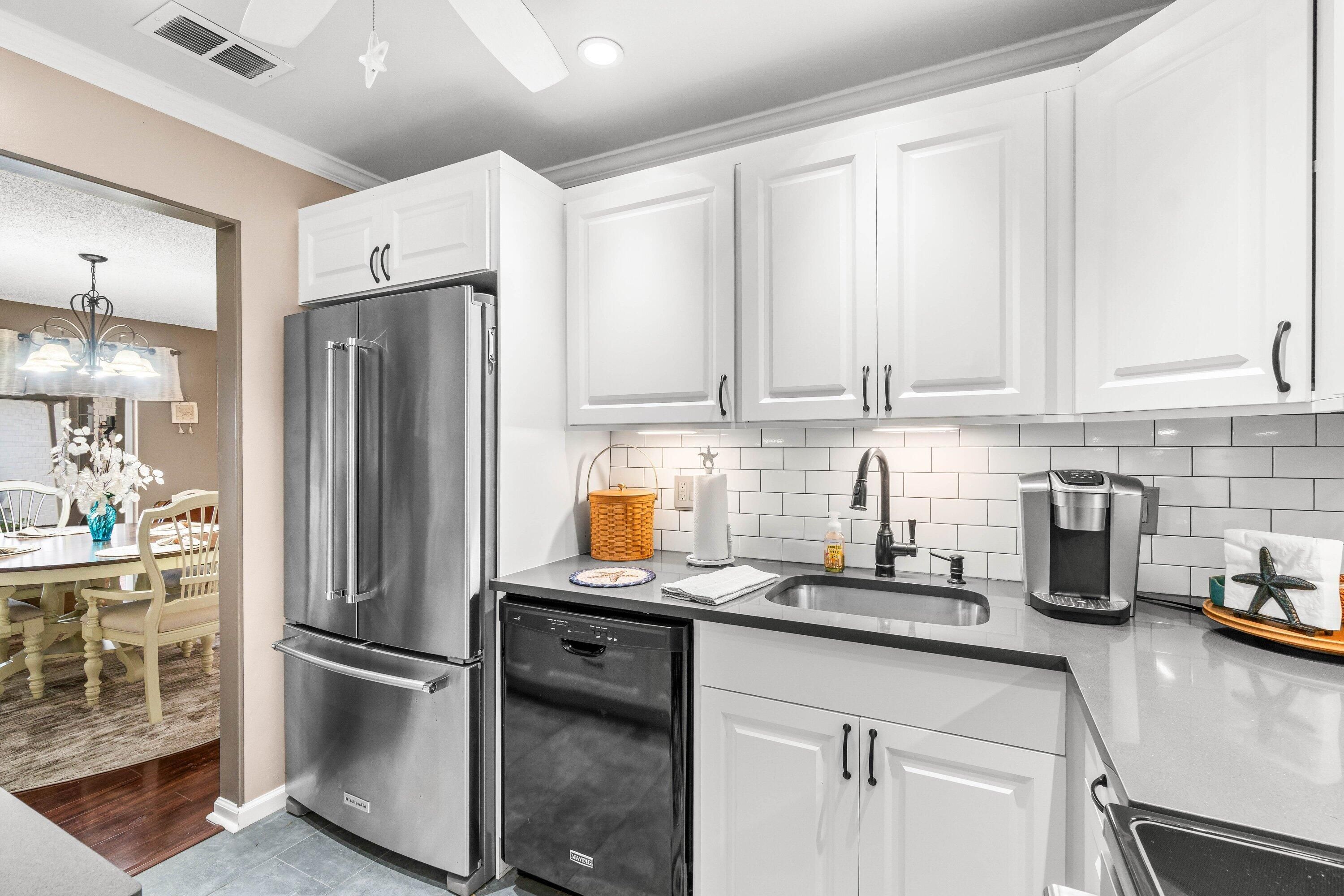 Rarely available 2-bedroom, 2-bath villa with a 1-car garage, perfectly situated in one of the best locations in the community -- directly across from the clubhouse, pool, and tennis courts. Enjoy added privacy with no homes directly across the street. Relax, unwind and grill in your own private screened-in patio. Home is fully protected by accordion shutters. Step inside to find elegant wood flooring and an open layout. The upgraded kitchen features white cabinetry, subway tile backsplash, and tile flooring. Both bedrooms are generously sized with ample closet space. The bathrooms have been tastefully renovated with designer tile showers, new vanities, lighting, and fixtures.