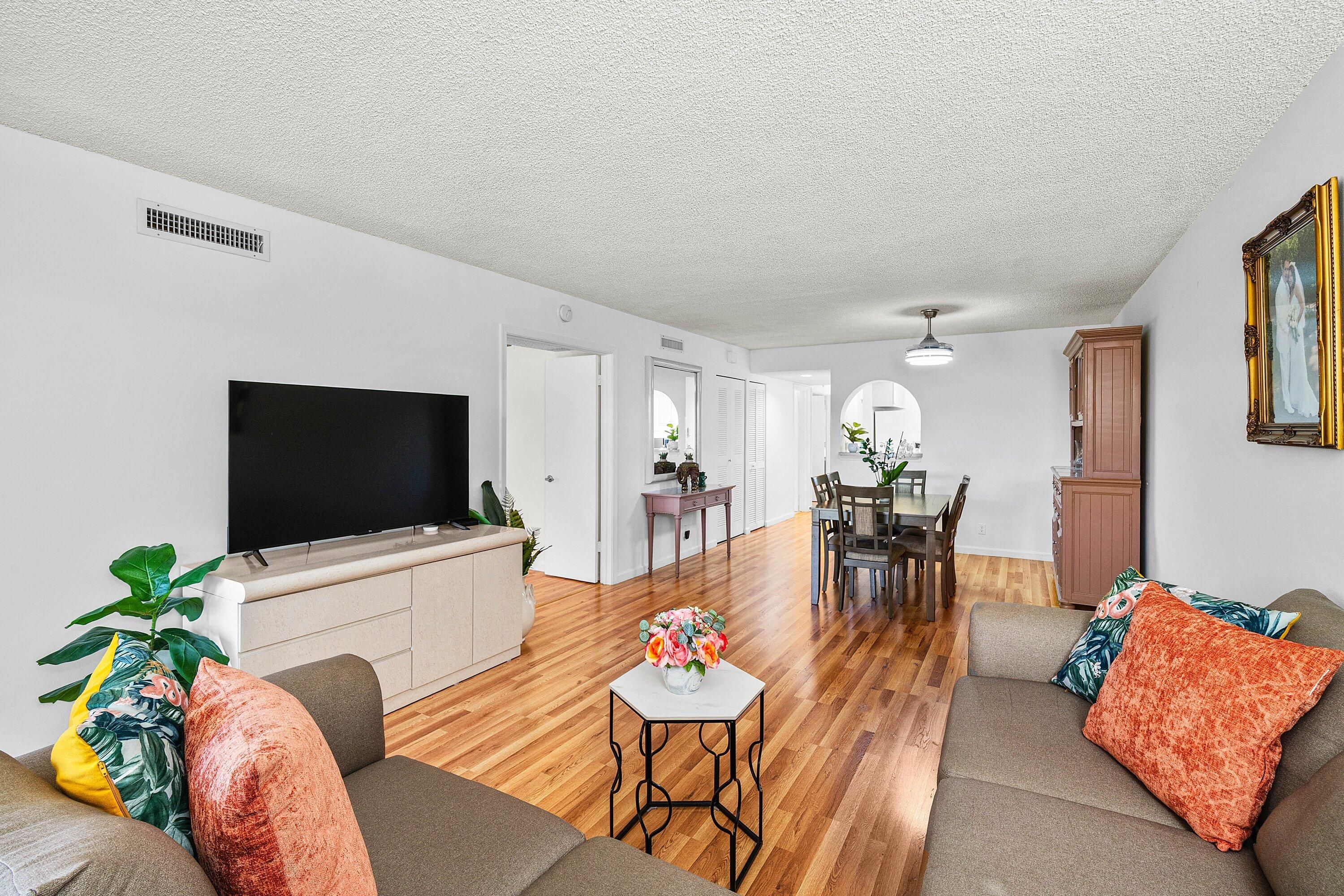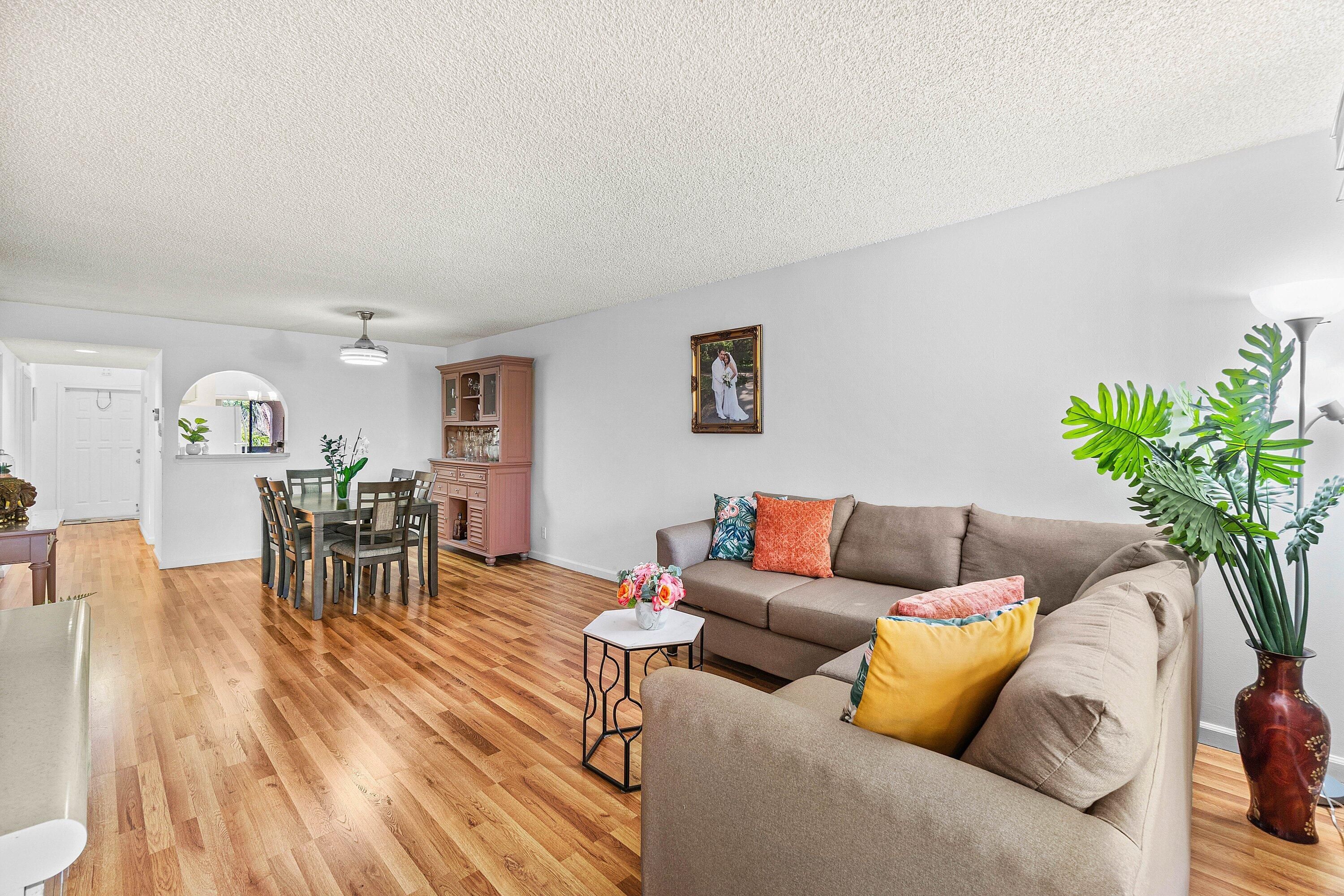 COME SEE THIS PRISTINE & IMMACULATE 2 BED 2 BATH CONDO IN THE VERY ACTIVE GATED COMMUNITY OF BANYAN SPRINGS. NEW ENGINEERED WOOD FLOORING THROUGHOUT THE CONDO GIVES THE FEELING OF CONTINUITY AND SPACIOUSNESS. THE PRIMARY BEDROOM HAS SLIDING GLASS DOORS THAT ALLOW NATURAL LIGHT & LEAD OUT TO THE SCREENED LANAI AND THE PRIMARY BATHROOM IS NICELY UPDATED. RELAX OR ENTERTAIN FRIENDS ON THE SCREENED LANAI. THIS AFFORDABLE CONDO IS MOVE IN READY AND NEEDS NO WORK! ACCORDION HURRICANE SHUTTERS (just in case)... BANYAN SPRINGS HAS AN AMAZING CLUBHOUSE w/ CAFE/RESTAURANT, 2 RESORT STYLE POOLS & 2 SPAS, FITNESS CENTER, SHOW HALL FOR PARTIES, SHOWS & DANCES, ART STUDIO, TENNIS & PICKLEBALL, BEAUTY SALON, BOCCE, MANY CARD GAMES & CLUBS TO JOIN! CLOSE TO SHOPPING, RESTAURANTS AND BEACHES!