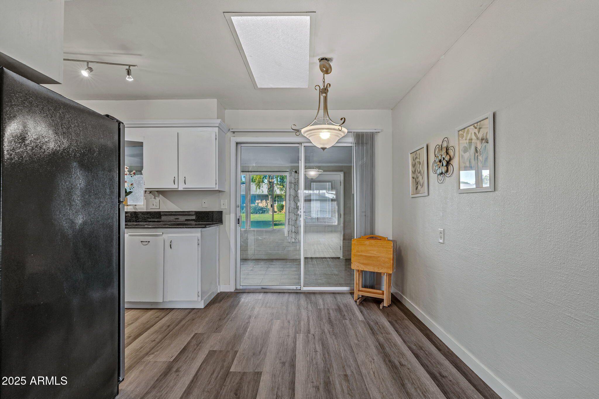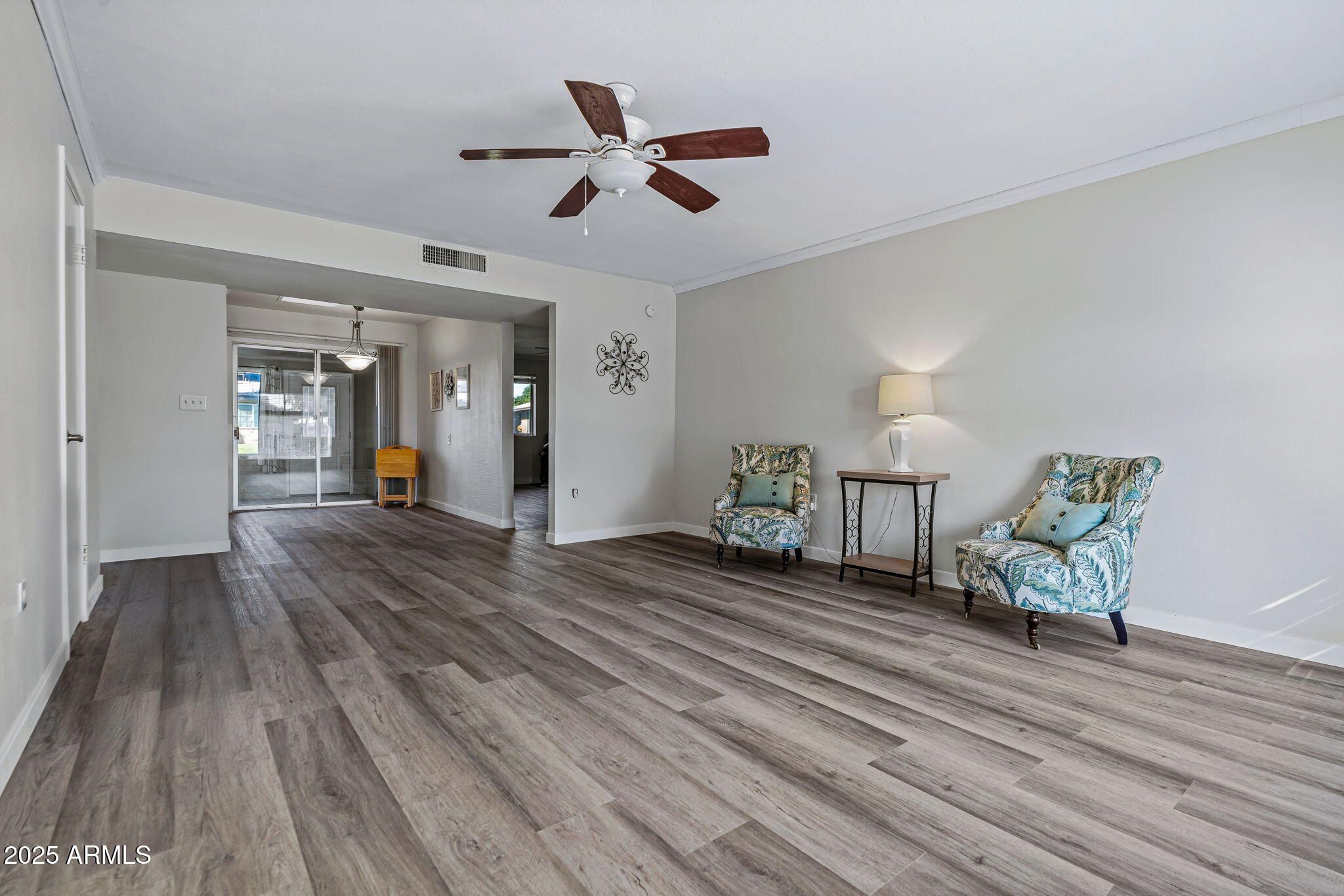 Come take a look! Recent landscape and cleaning refresh! Well-maintained, charming 1,660 sq ft 2-bedroom, 2-bathroom home with recent updates throughout. Features include fresh interior paint, new flooring, updated countertops, and energy-efficient front windows. A spacious bonus family room leads to a glassed-in Arizona room at the back of the home, ideal for year-round enjoyment. All appliances are included, along with an indoor washer & dryer for added convenience. The custom-built front and back patio offer a welcoming outdoor space, while the greenbelt behind the home provides mature trees and a quiet retreat. Located close to shopping, medical facilities, transportation, and the many amenities of Sun City's 55+ community. Move-in ready and waiting for its next owner.