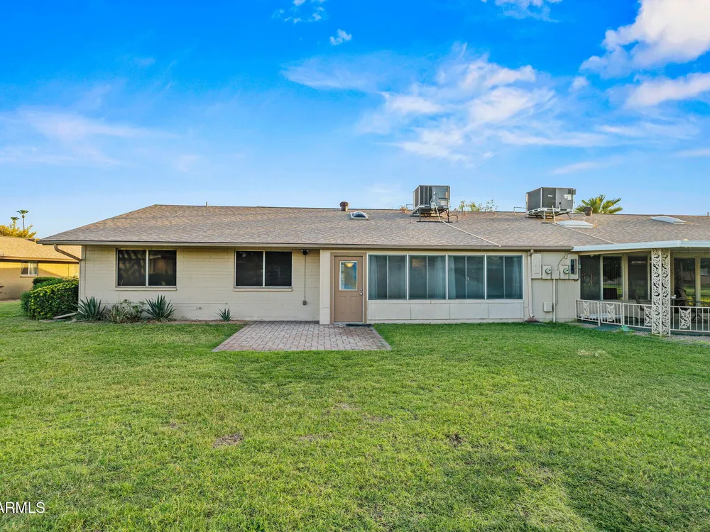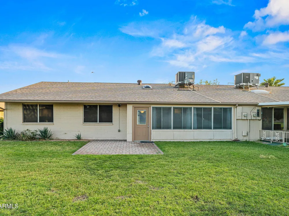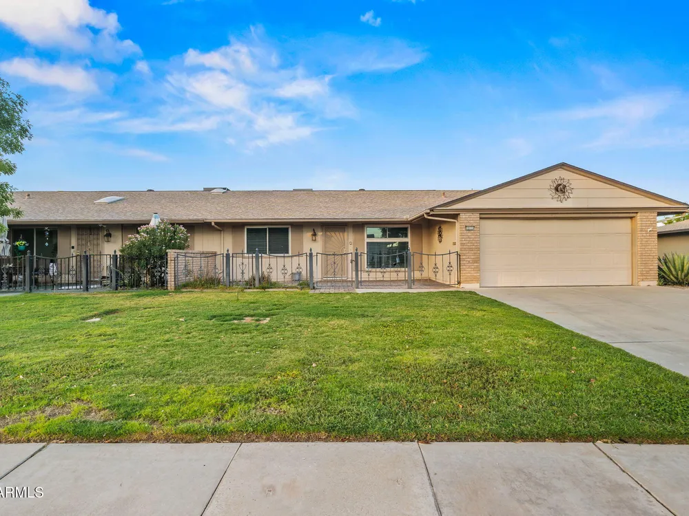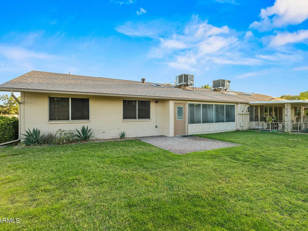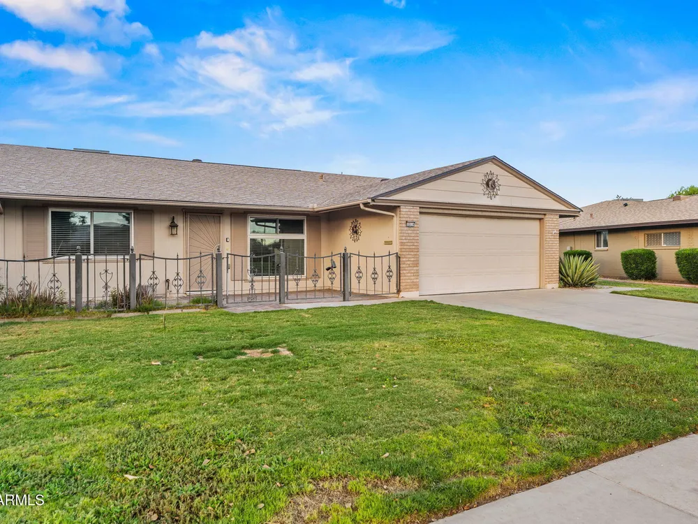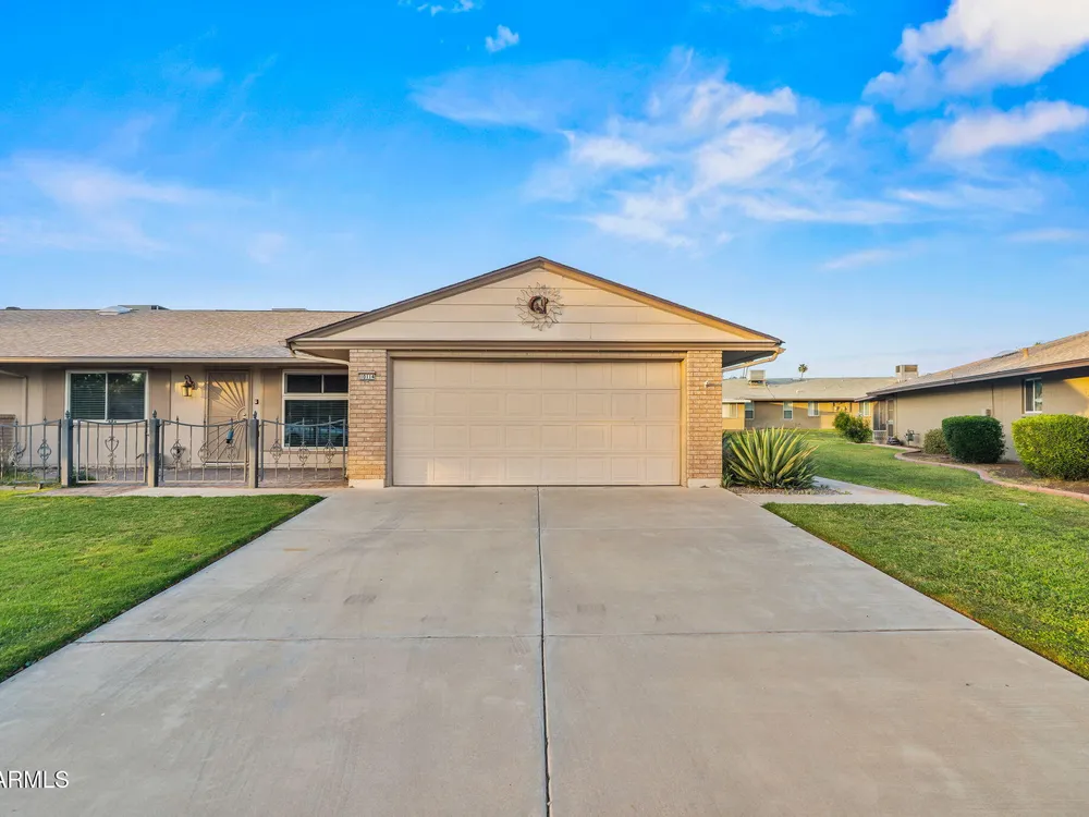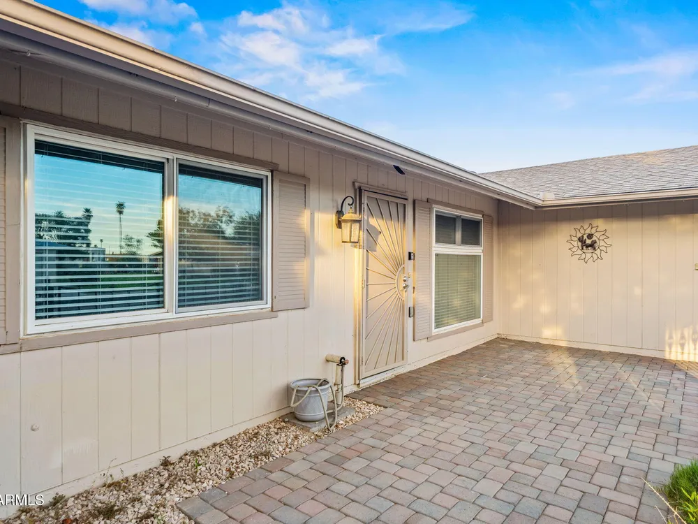 Well-maintained, charming 1,660 sq ft 2-bedroom, 2-bathroom home with recent updates throughout. Features include fresh interior paint, new flooring, updated countertops, and energy-efficient front windows. A spacious bonus family room leads to a glassed-in Arizona room at the back of the home, ideal for year-round enjoyment. All appliances are included, along with an indoor washer & dryer for added convenience. The custom-built front and back patio offer a welcoming outdoor space, while the greenbelt behind the home provides mature trees and a quiet retreat. Located close to shopping, medical facilities, transportation, and the many amenities of Sun City's 55+ community. Move-in ready and waiting for its next owner.