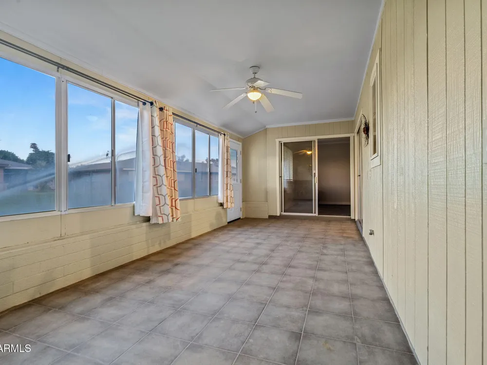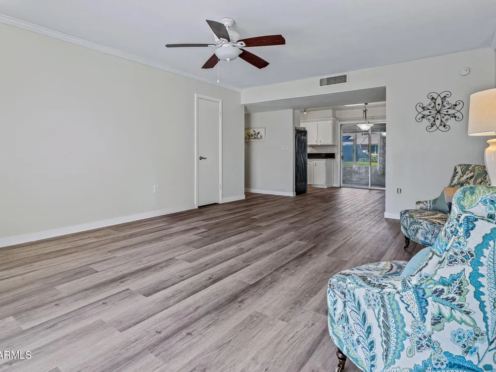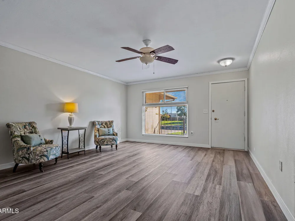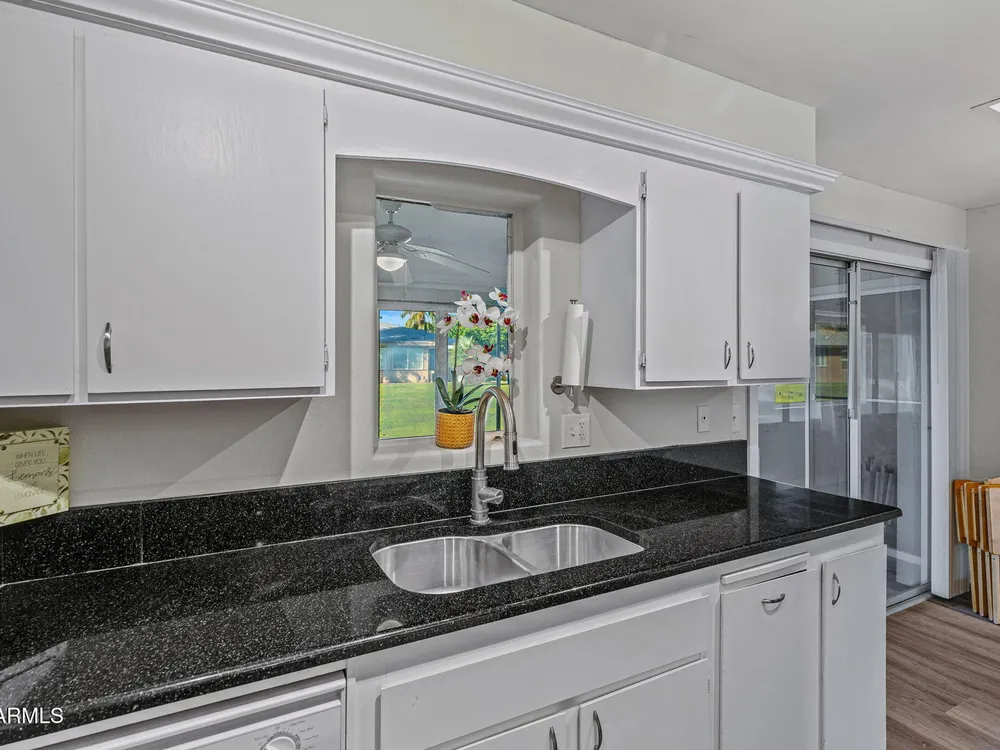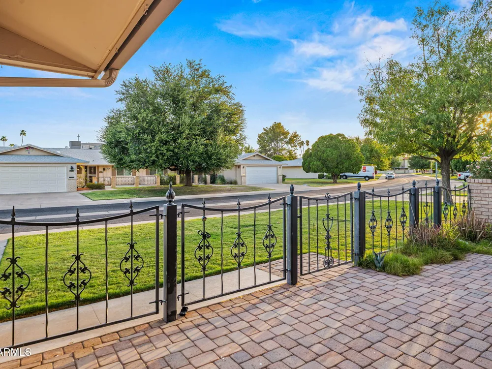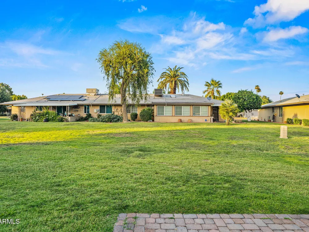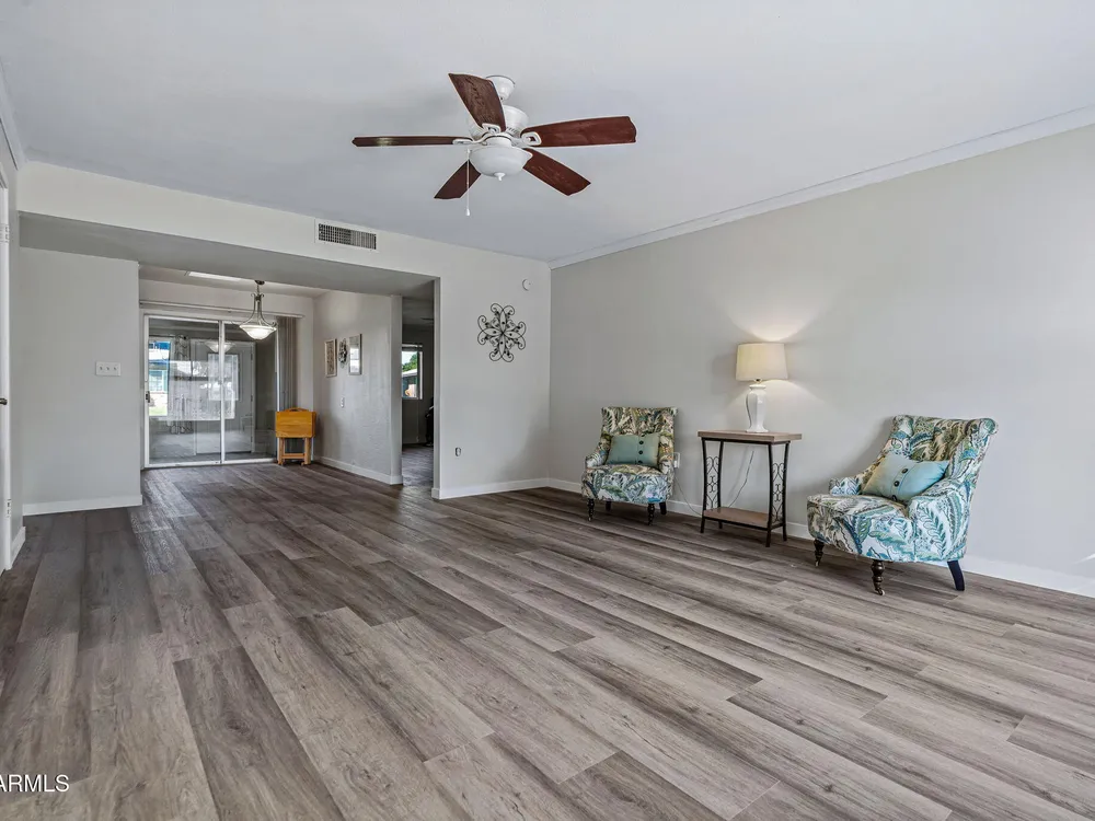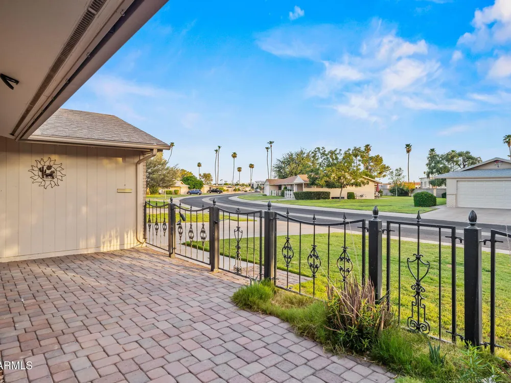 Well-maintained, charming 1,660 sq ft 2-bedroom, 2-bathroom home with recent updates throughout. Features include fresh interior paint, new flooring, updated countertops, and energy-efficient front windows. A spacious bonus family room leads to a glassed-in Arizona room at the back of the home, ideal for year-round enjoyment. All appliances are included, along with an indoor washer & dryer for added convenience. The custom-built front and back patio offer a welcoming outdoor space, while the greenbelt behind the home provides mature trees and a quiet retreat. Located close to shopping, medical facilities, transportation, and the many amenities of Sun City's 55+ community. Move-in ready and waiting for its next owner.