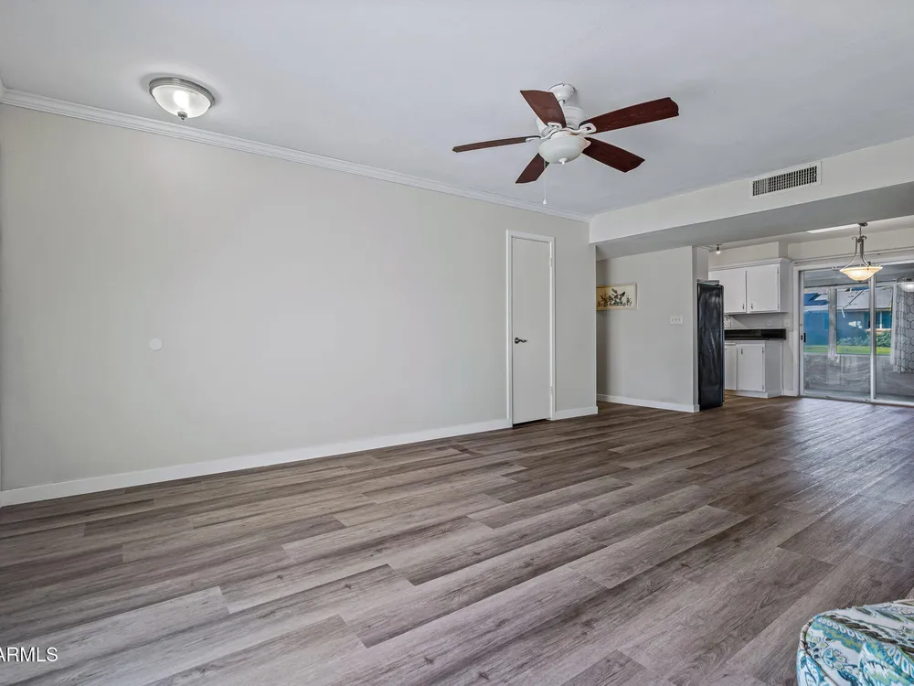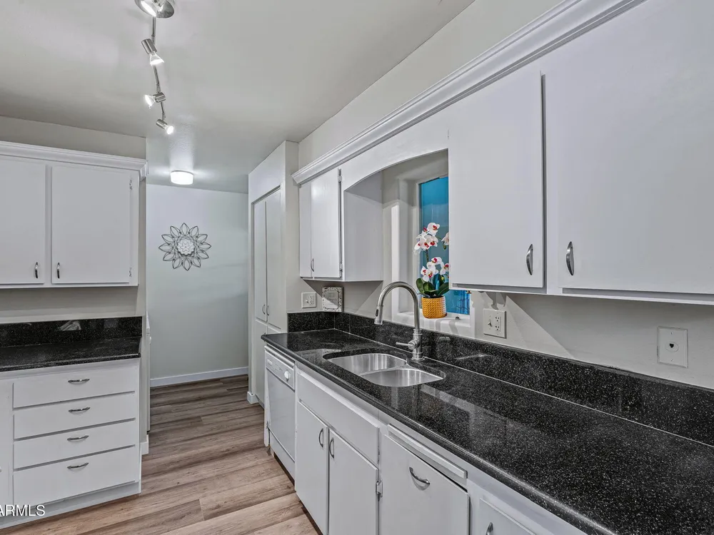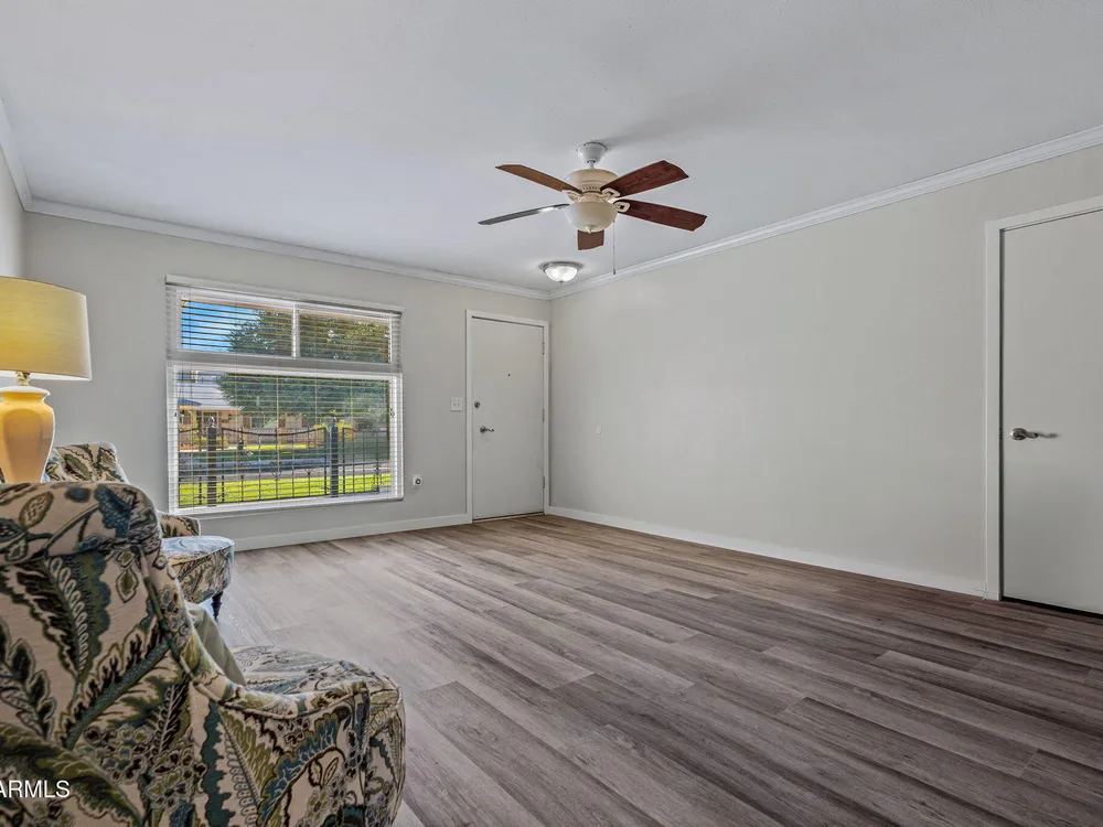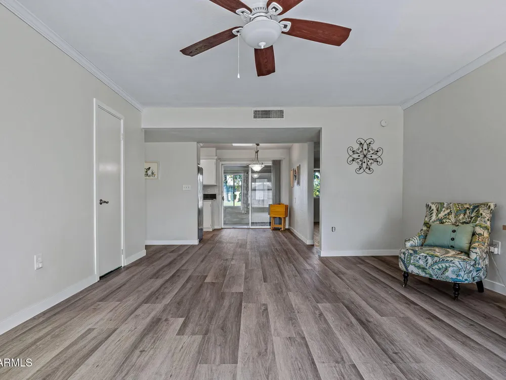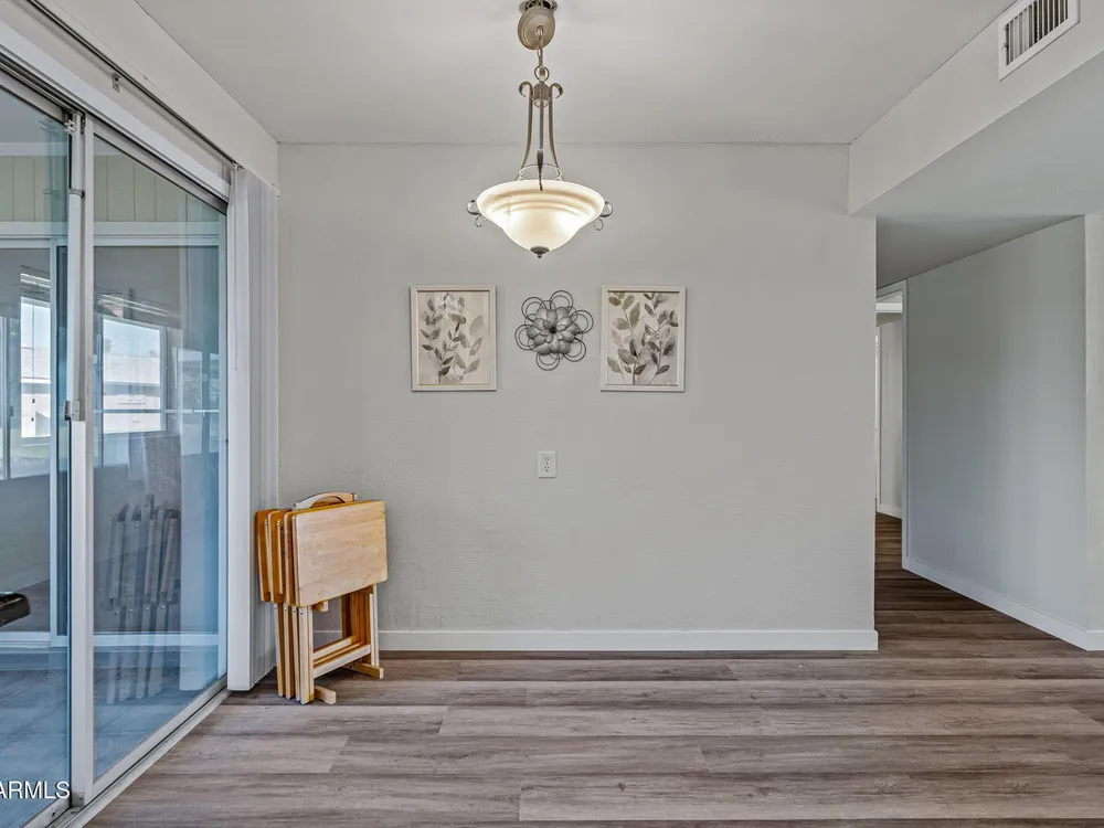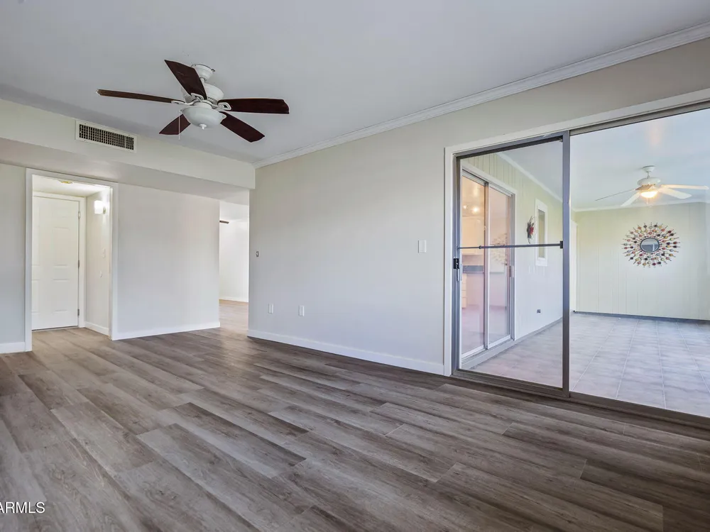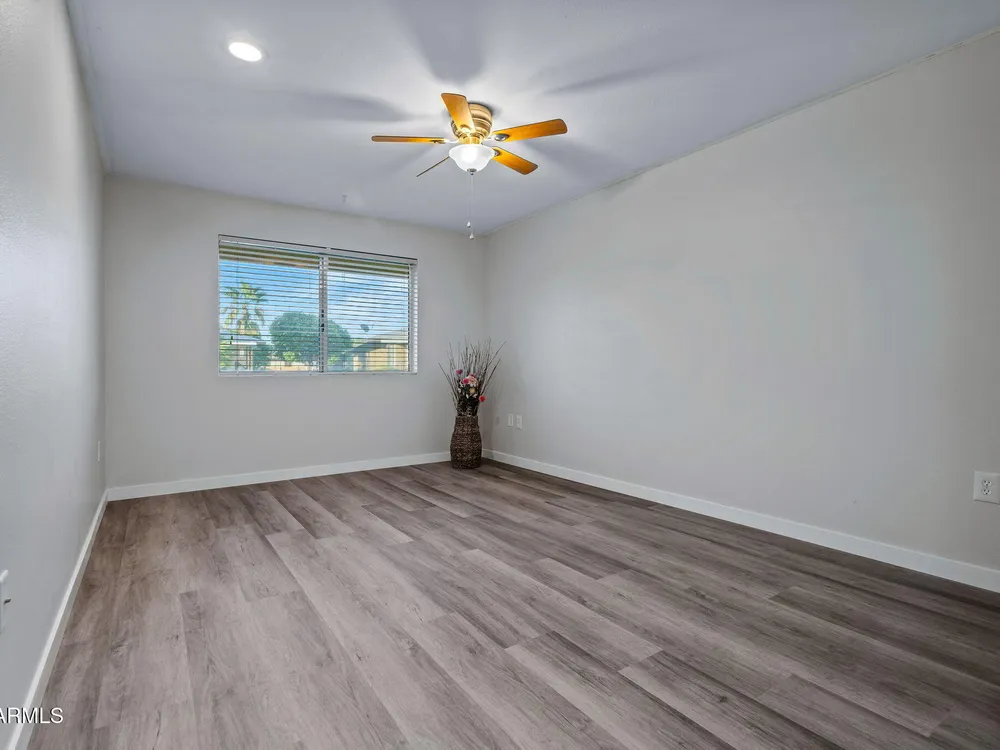 Well-maintained, charming 1,660 sq ft 2-bedroom, 2-bathroom home with recent updates throughout. Features include fresh interior paint, new flooring, updated countertops, and energy-efficient front windows. A spacious bonus family room leads to a glassed-in Arizona room at the back of the home, ideal for year-round enjoyment. All appliances are included, along with an indoor washer & dryer for added convenience. The custom-built front and back patio offer a welcoming outdoor space, while the greenbelt behind the home provides mature trees and a quiet retreat. Located close to shopping, medical facilities, transportation, and the many amenities of Sun City's 55+ community. Move-in ready and waiting for its next owner.