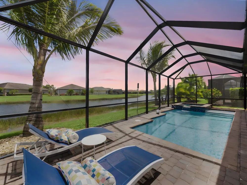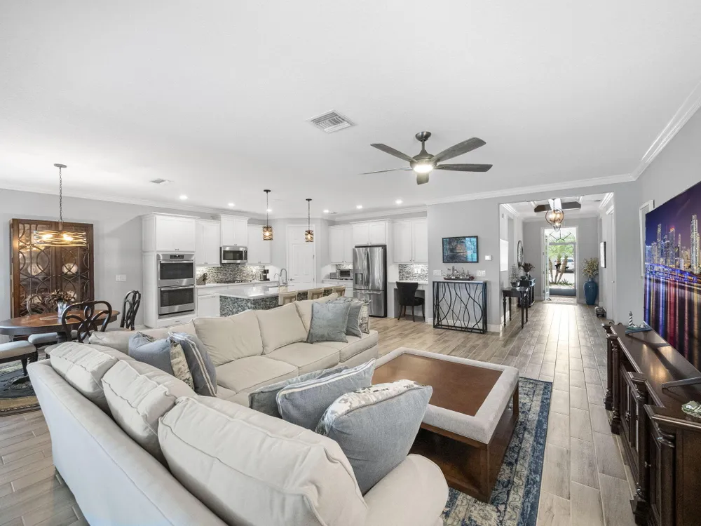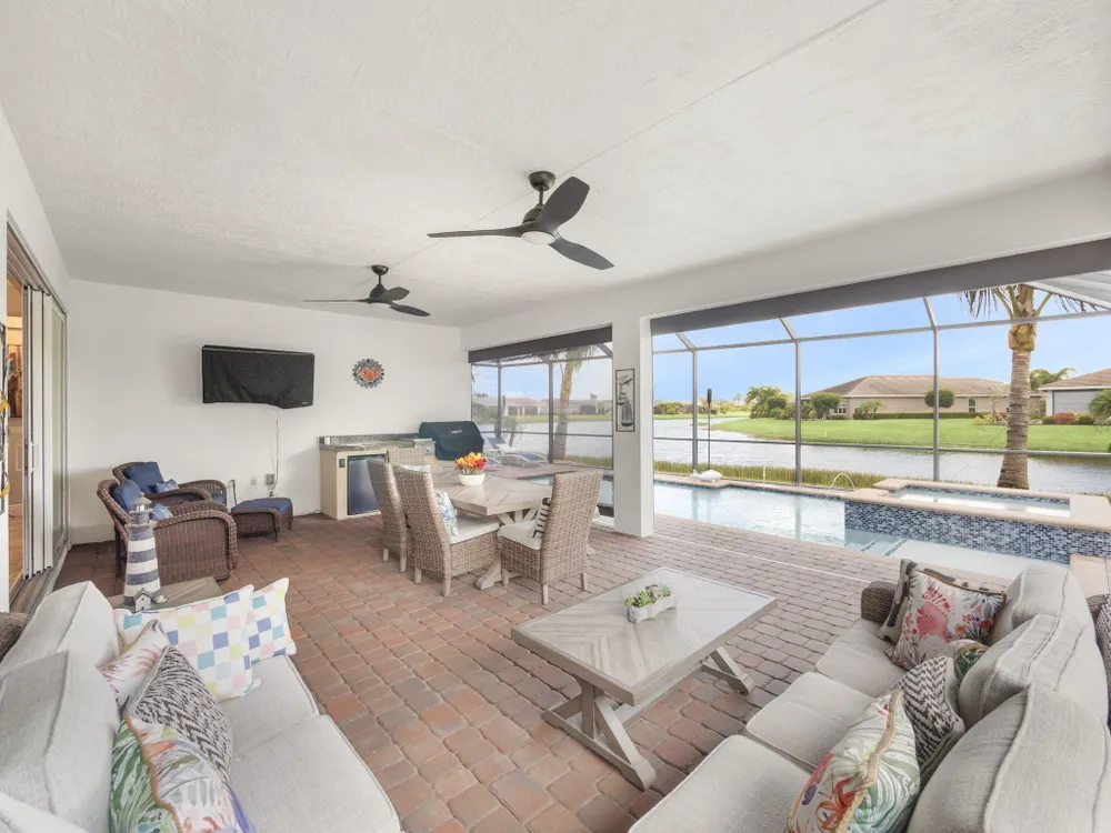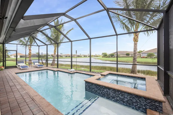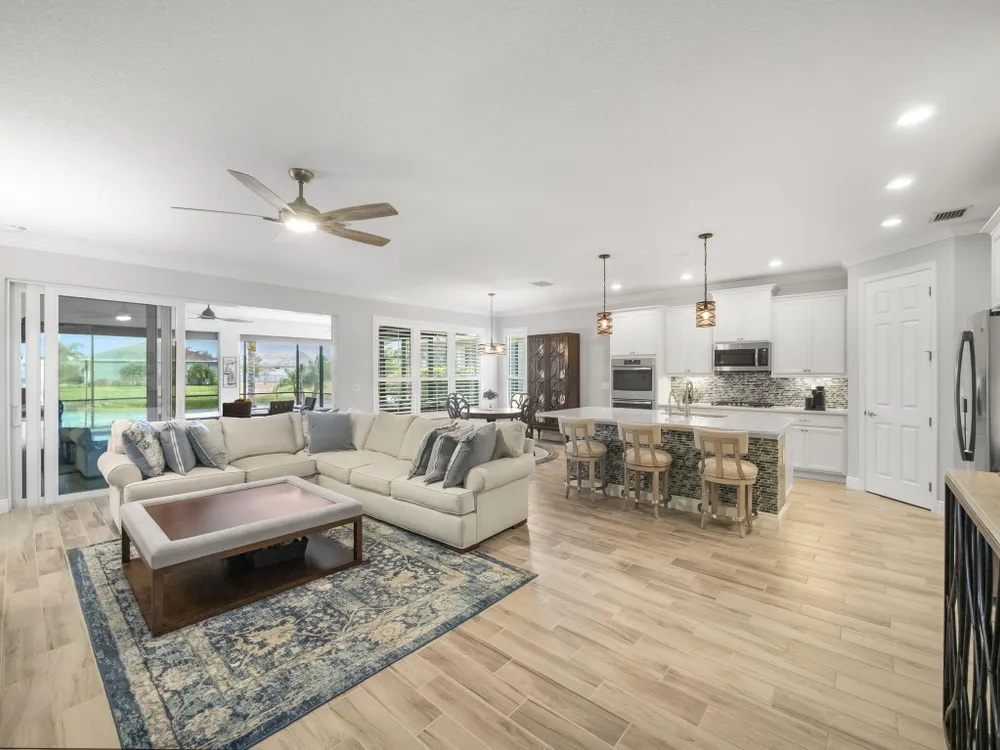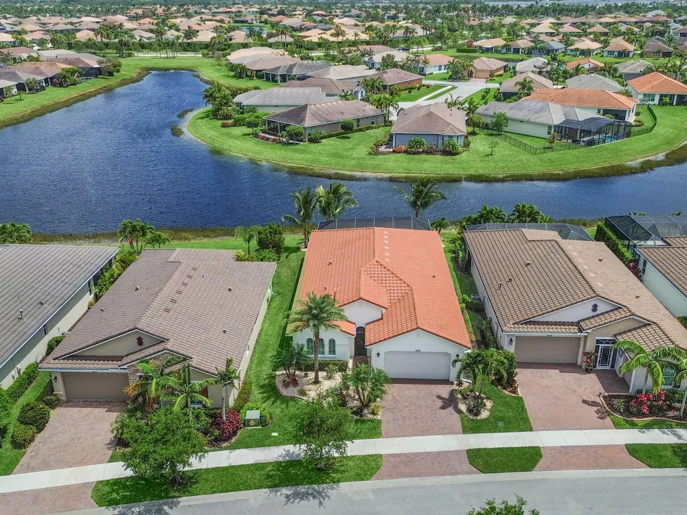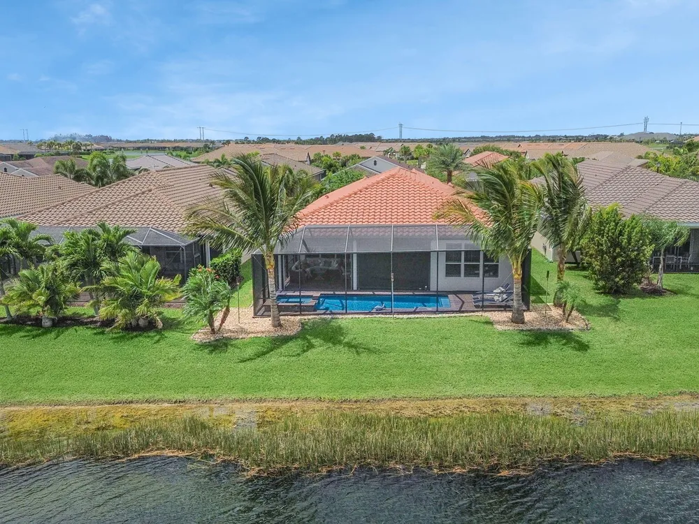Live the resort lifestyle every day in this beautifully upgraded 2-bedroom + Flex Room, 2-bathroom lakefront pool and spa home with 20' x 24' garage, nestled in the sought-after 55+ community of Vitalia at Tradition. This home offers peace of mind and year-round comfort with complete impact glass, hurricane screens, a whole house generator, surge protection system, termite protection, and an AC/air purification system with UV light. A smart thermostat and whole home water filtration system add even more value and convenience. Step into the gourmet kitchen, featuring stainless steel appliances, a gas range, double wall oven, and spacious countertops--perfect for cooking and entertaining. The open-concept layout flows into the living and dining areas, all showcasing stunning views.