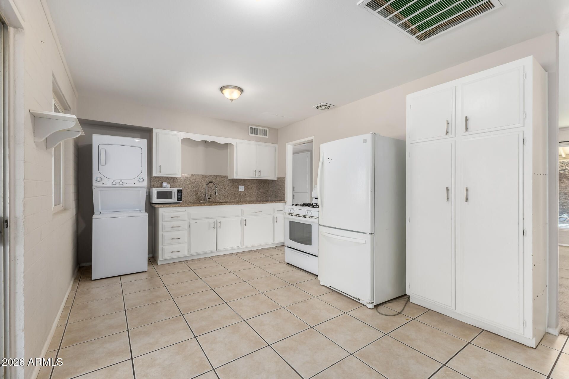- Stacked Washer/Dryer, Dryer, Washer, Refrigerator, Gas Range