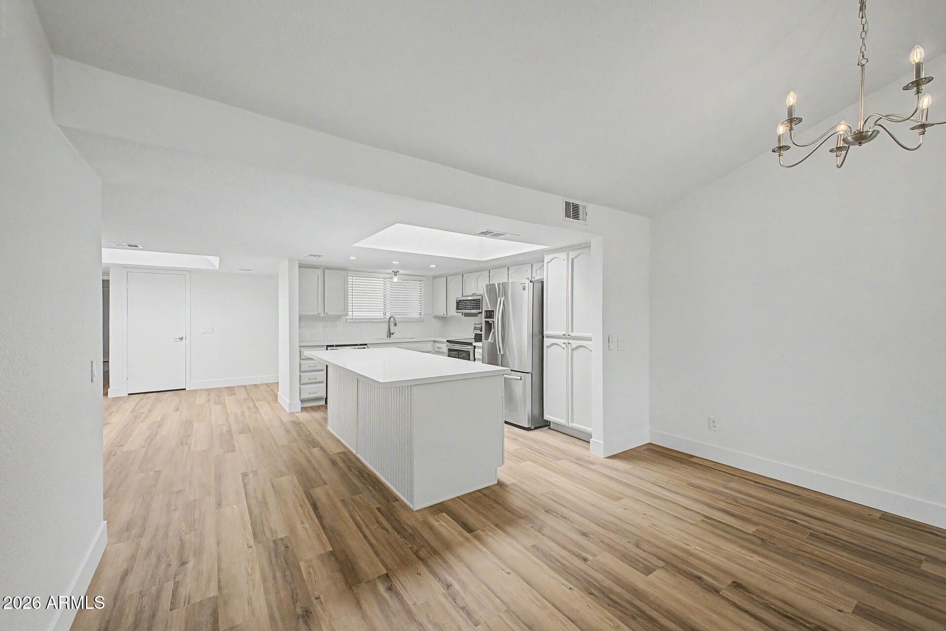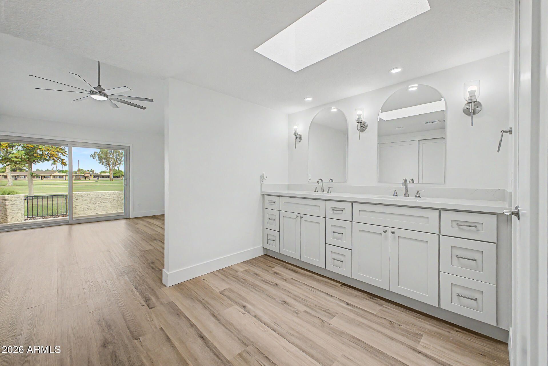 COMPLETELY REMODELED townhouse on a GOLF COURSE LOT with a new open-concept floorplan. Walls have been removed to create a true great room with vaulted ceilings, a fireplace and golf course views! The kitchen now opens to the main living area and will feature new countertops, a center island & stainless steel appliances. Fresh paint and new luxury vinyl plank floors, carpet, and baseboards throughout. The primary suite offers vaulted ceilings, back patio access and more VIEWS! 3rd bedroom has a separate courtyard entrance - ideal for a guest room, office or flex space! 2 car garage complete with an included golf cart! Located around the corner from the clubhouse, community pool, spa, sports courts and more in active Sun Lakes community!