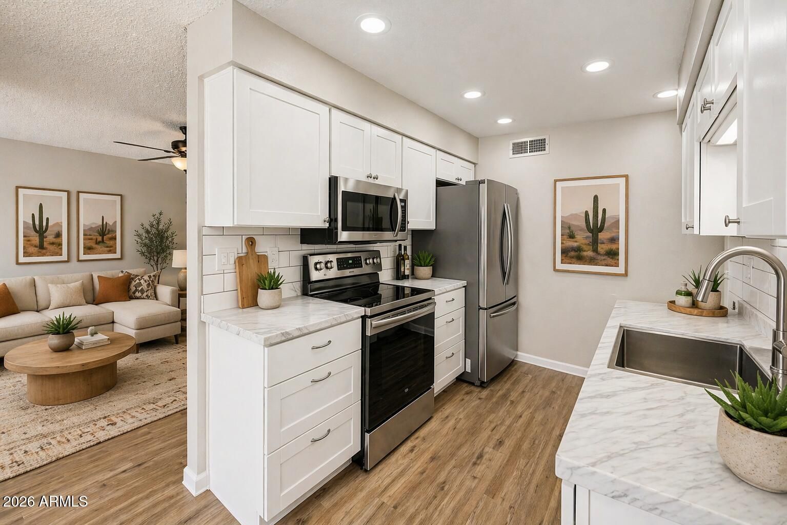 Tastefully updated Gemini home in the 55+ Sun Air Estates! This move-in ready residence offers 2 beds, 1 bath plus a powder room, and an attached 1-car garage. The bright interior features abundant natural light, all new paint, new flooring and baseboards, plus updated ceiling fans, light fixtures, and all new electrical outlets. The spacious formal living room is perfect for entertaining. The eat-in kitchen showcases newer SS appliances, new cabinets, sink, and subway tile backsplash. The primary bedroom includes a walk-in closet and attached powder room. Enjoy a covered patio, plus community pool, spa, and rec center, all near dining, parks, and golf. Close to dining options, parks, golf courses, and freeways. Move-in ready!