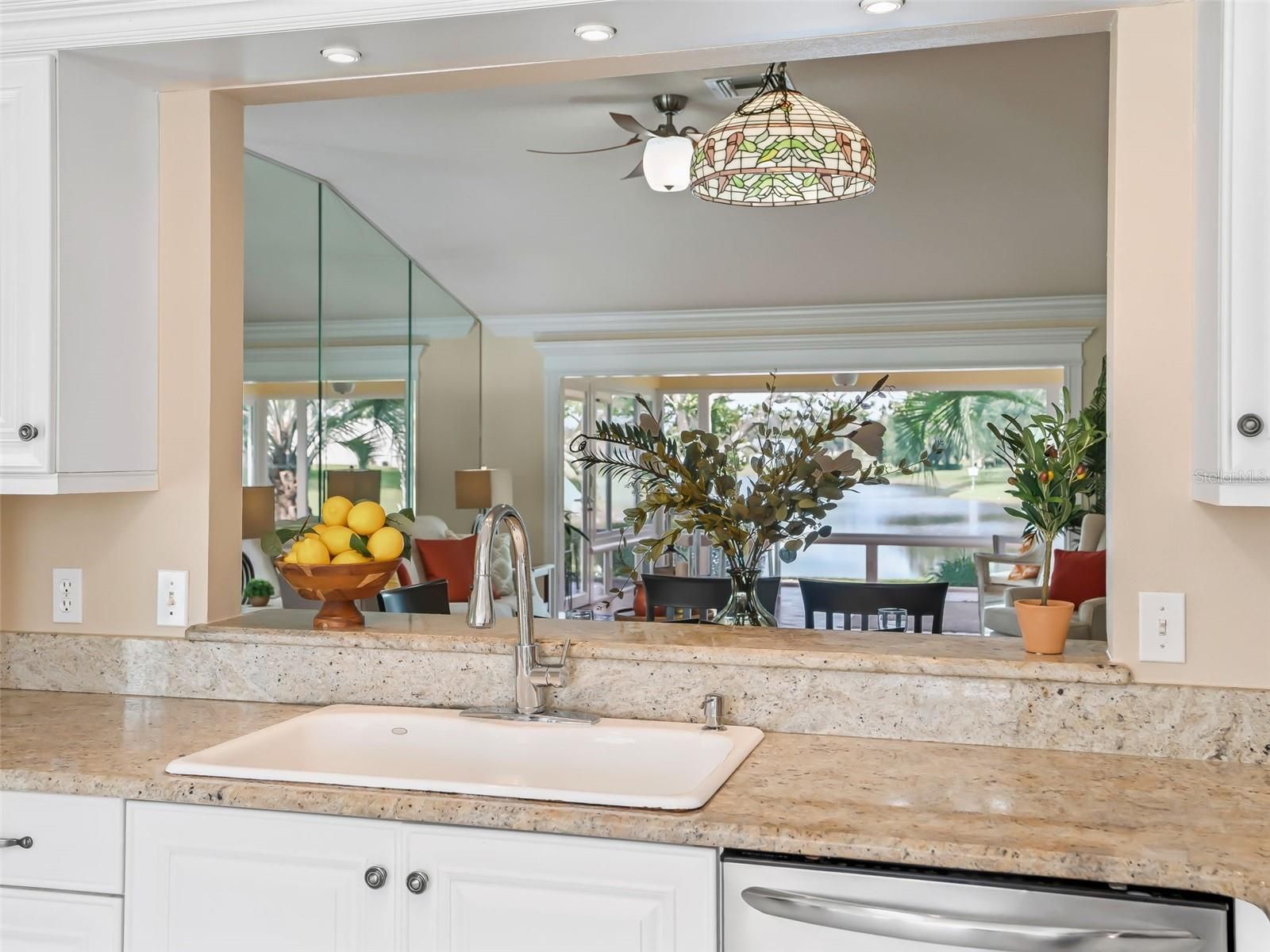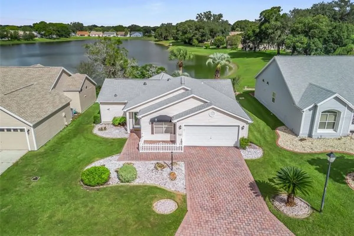 DESIGNER HOME, WATER FRONT!! NO BOND & FANTASTIC WATER VIEW!!—birds and wildlife from nearly every room! SPLIT FLOOR PLAN with an UPDATED eat-in kitchen: CROWNED WHITE CABINETS, STAINLESS STEEL appliances, & GRANITE counters, overseeing a Large combined dining/living area w/CROWN MOLDING, FLOOR TO CEILING MIRRORS that amplify light and the view, and BEAUTIFUL WOOD FLOORS... But the WOW-FACTOR of this home is the GORGEOUS FLORIDA ROOM fitted with HIGH-END WINDOWS, enhancing the VIEW. Other HIGHLIGHTS: ROOF 2021, HVAC 2019, UPGRADED FANS & LIGHTING throughout, INSIDE LAUNDRY, and Brand new carpeting in the bedrooms. The 2-CAR Garage has built-in CABINETS and an ATTIC pull-down LADDER leading to EXTENSIVE STORAGE!! Outside, a large lot showcases neat stone landscape beds with fresh mulch. PRIME LOCATION: Just a mile and a half to SPANISH SPRINGS TOWN SQUARE and 3 miles to LAKE SUMTER LANDING!!!— JUST A MILE from TONS OF SHOPPING, DINING, GOLF, RECREATION, and medical. Come ENJOY THE VILLAGES with peaceful water views, a functional layout, and quality updates in one of The Villages’ most convenient areas.