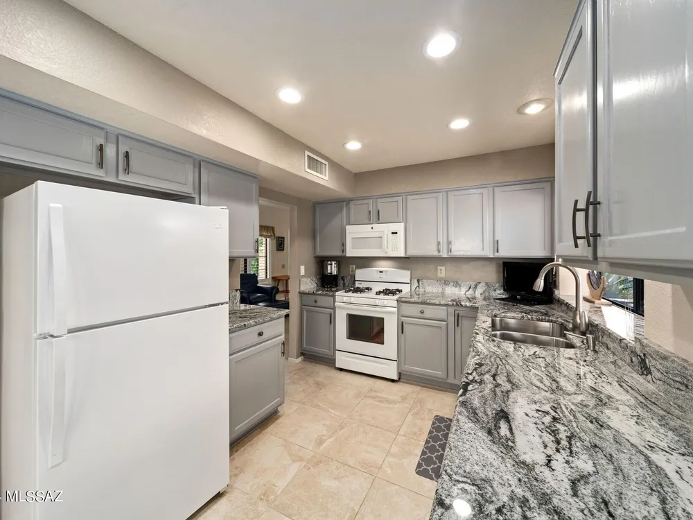 Fabulous, highly updated 2BD/2BA (1,304 sq ft) Cumberland Model. Step into this private light and bright home and find an expansive great room and beautiful tile in common areas. Updated chef's kitchen with granite counter tops, ample storage and a breakfast nook. Relax in the owner's suite with updated bathroom and walk in shower. Sizable guest bedroom with a Murphy bed and full hall bath. Private spacious backyard with Catalina Mountain Views, fruit trees, covered and uncovered patios plus a completely fenced yard. Sun City Oro Valley is a premier Active Adult community offering 18 hole golf course, pickleball, fitness center, tennis, wood shop, 2 pools, restaurant / bar, clubs and much more. Move-in-ready and perfect for the most discerning buyer!