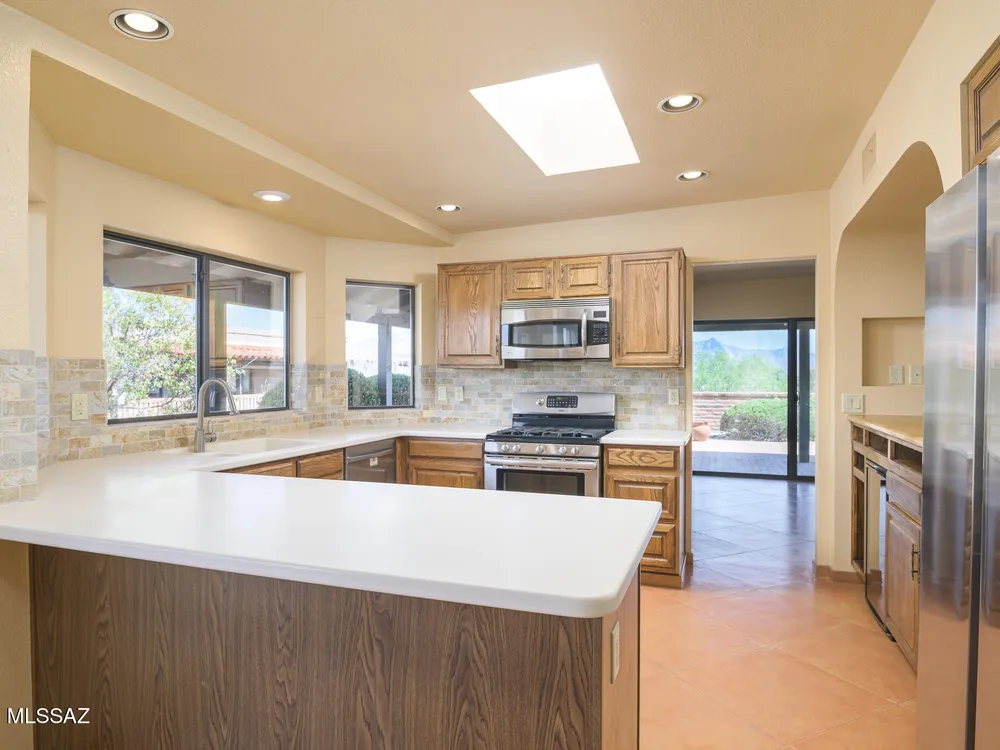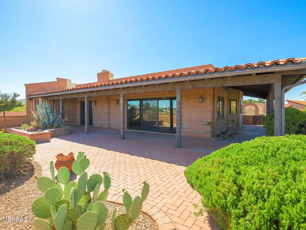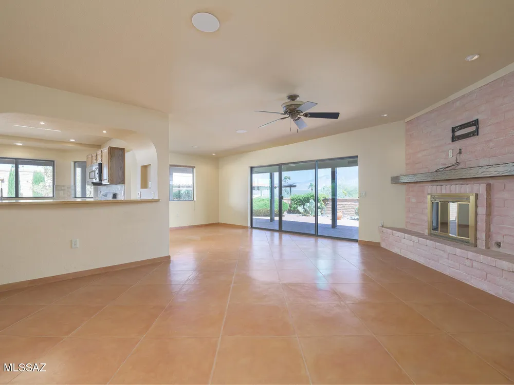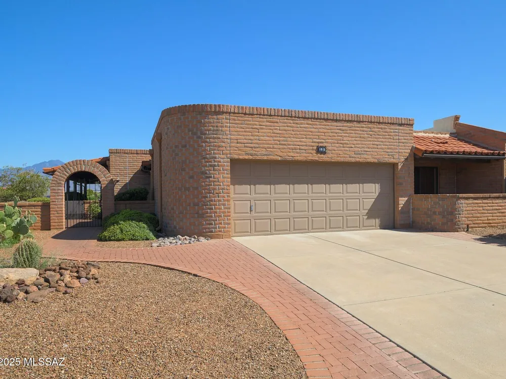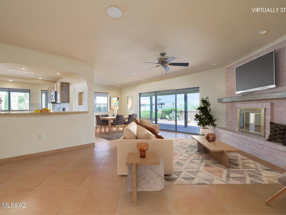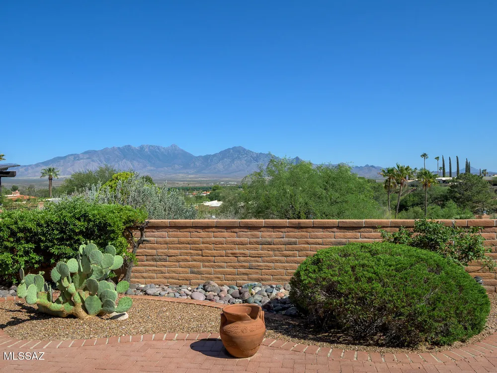Embrace the epitome of Southwest living with this exquisite retirement oasis, nestled in the serene ambiance of Green Valley. This elegantly customized residence boasts a harmonious blend of classic design and modern flair, tailored specifically for discerning retirees who desire an idyllic retreat with breathtaking mountain vistas. As you step through the arched entry into the front courtyard, you're welcomed into a space where the classic slump block construction hints at the timeless sophistication within. Inside, the home reveals its one-of-a-kind remodel, enhancing the popular Miramar floor plan with raised ceilings and graceful arched openings that create a seamless flow between living spaces. The heart of this abode features an angled brick-faced fireplace, a striking centerpiece