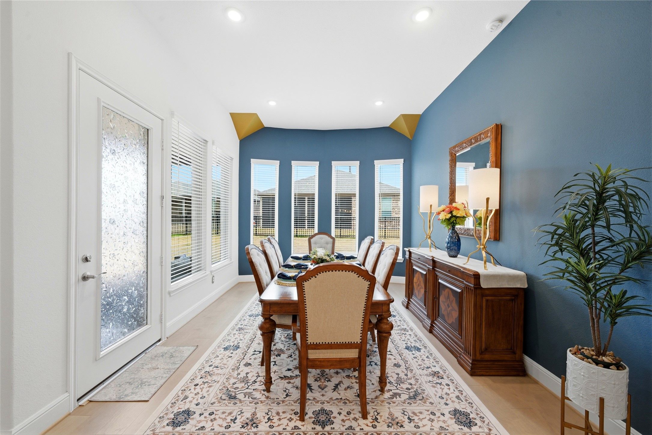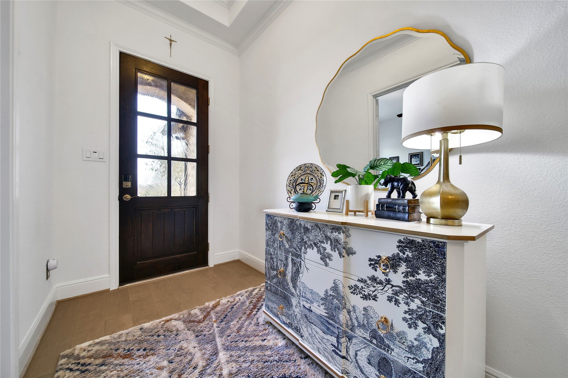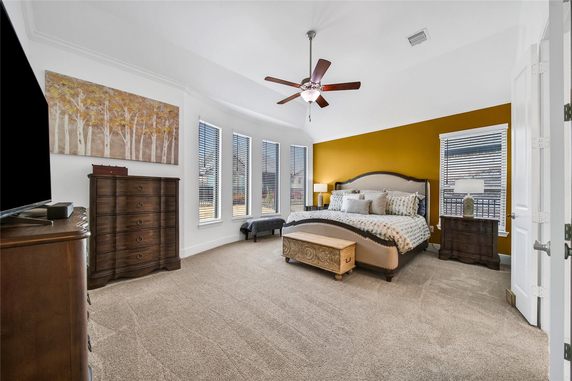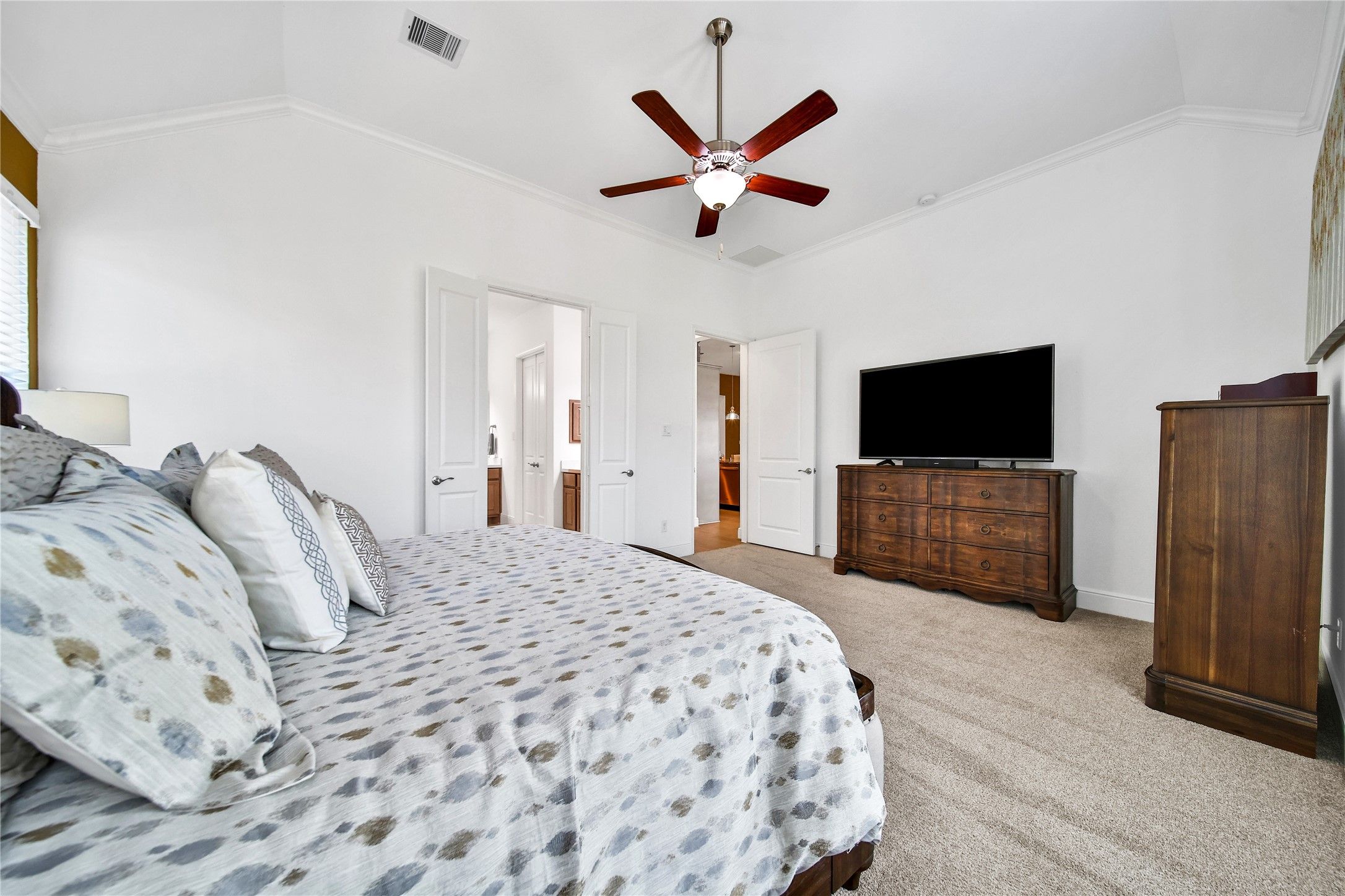 - Crown Molding, Double Vanity, Entrance Foyer, High Ceilings, Kitchen Island, Kitchen/Family Room Combo, Bath in Primary Bedroom, Pantry, Quartz Countertops, Tub Shower, Makeup/Vanity Space, Walk-In Pantry, Window Treatments, Ceiling Fan(s)