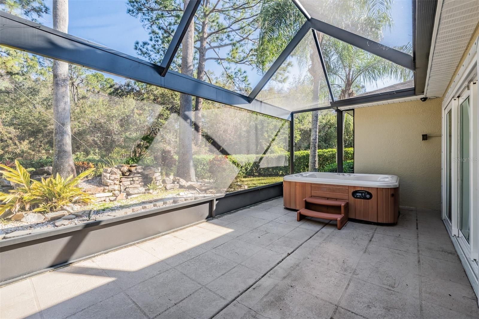 One or more photo(s) has been virtually staged. Location, Location, Location! Nestled among Conservation with a golf course view you can experience peaceful, resort-style living in this Man-guard gated community of Tampa Bay Golf and Tennis Club! This Beautifully maintained 2,500-square-foot home is tucked away on a highly desirable cul-de-sac lot with no neighbors to the right or rear! Great Curb appeal with landscaped lawn, brick walkway and screened front entry! From the moment you enter, you’ll appreciate the thoughtful upgrades, including ceramic tile in all wet areas and elegant wood floors throughout the main living spaces and third bedroom. This home offers hurricane-impact windows and sliders, an electric fireplace in the family room, fresh exterior paint, tray ceilings in the owners suite, kitchen and family room accented with crown molding with five-and-a-half-inch baseboards throughout. The well-appointed kitchen features gorgeous 42” maple cabinetry, gleaming granite countertops, tile backsplash, and a built-in double oven, with all appliances—including high energy efficient washer and dryer with pedestals conveying. Additional highlights include a built-in desk in the third bedroom, water softener, upgraded lighting and ceiling fans and all window treatments. Flex room off the main living areas boasts a wooden ceiling and hurricane sliders to extend the entertaining space onto the screened lanai complete with a therapeutic hot tub! Outside, enjoy a covered storage pad and a tranquil stone waterfall feature with a paver patio, perfect for relaxing around a firepit or entertaining on the outdoor back patio. The community’s impressive 15,000-square-foot clubhouse offers a full service restaurant and pub bar with outdoor eatery overlooking the golf course, library, ballroom with stage and dance floor, resident computer access, resort style pool, along with dog parks, tennis courts, pickleball, shuffleboard, plus an activities center with state of the art fitness center, billards room, poker tables, card and game rooms and access to the 18-hole championship golf course and a 9-hole executive course. With too many features to list, this exceptional home truly must be seen... CALL TODAY to see why this IS the place to BE!