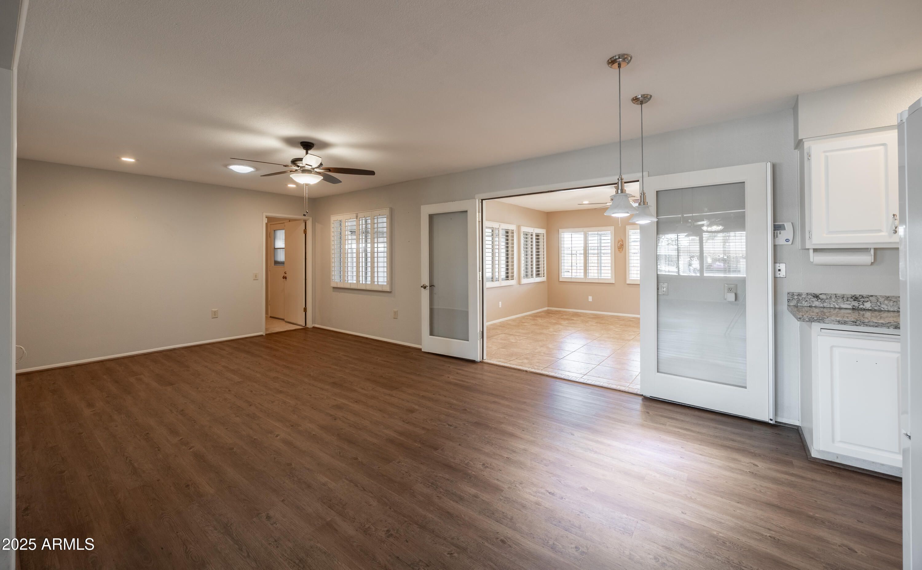 BEAUTIFUL 3BR/2BTH HOME W/ 2 CAR GARAGE! EXCELLENT SUN CITY LOCATION W/ NORTH/SOUTH EXPOSURE TOO! STUCCO EXTERIOR, DUAL PANE WINDOWS, & BRICK PAVER DRIVEWAY. KITCHEN FEATURES WHITE APPLIANCES & CABINETS, GRANITE COUNTERTOPS, RECESSED LIGHTING, & PANTRY. WHITE VANITIES. PLANTATION SHUTTERS & CEILING FANS. NO CARPETING. LARGE AZ ROOM & SCREENED PATIO TO ENJOY THE FENCED IN BACKYARD. INSIDE LAUNDRY W/ WASHER/DRYER, LAUNDRY TUB & CABINETS. WATER HEATER-'23.