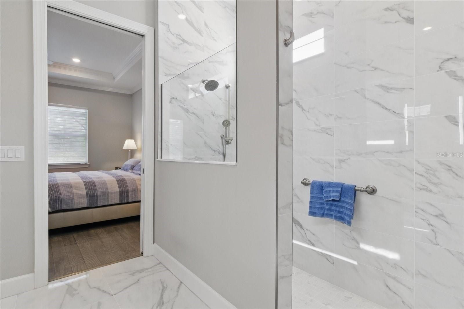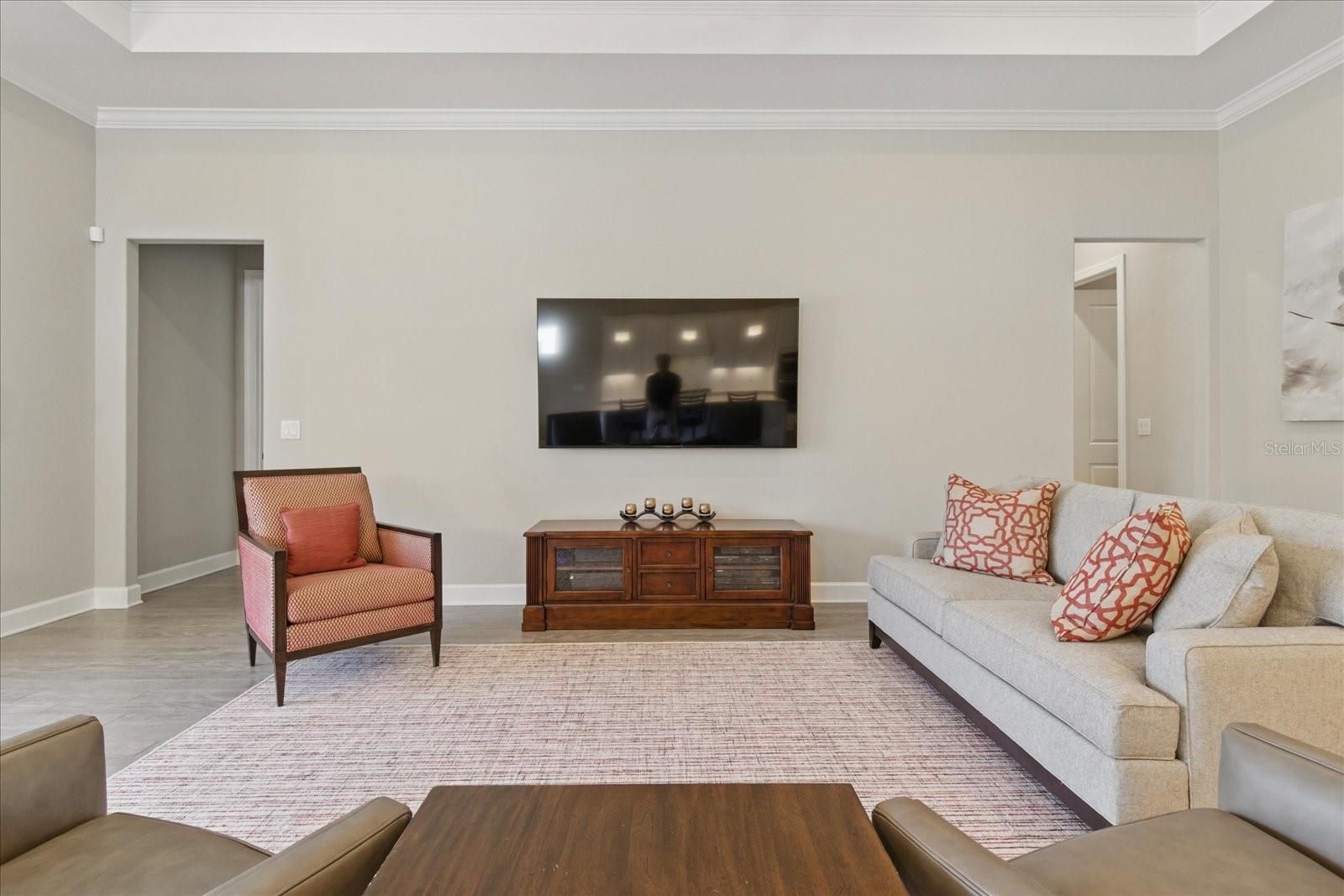 - Built-in Features, Crown Molding, Eat-in Kitchen, High Ceilings, Living/Dining Room, Open Floorplan, Main Level Primary, Solid Surface Counters, Solid-Wood Cabinets, Tray Ceiling(s), Walk-In Closet(s), Window Treatments