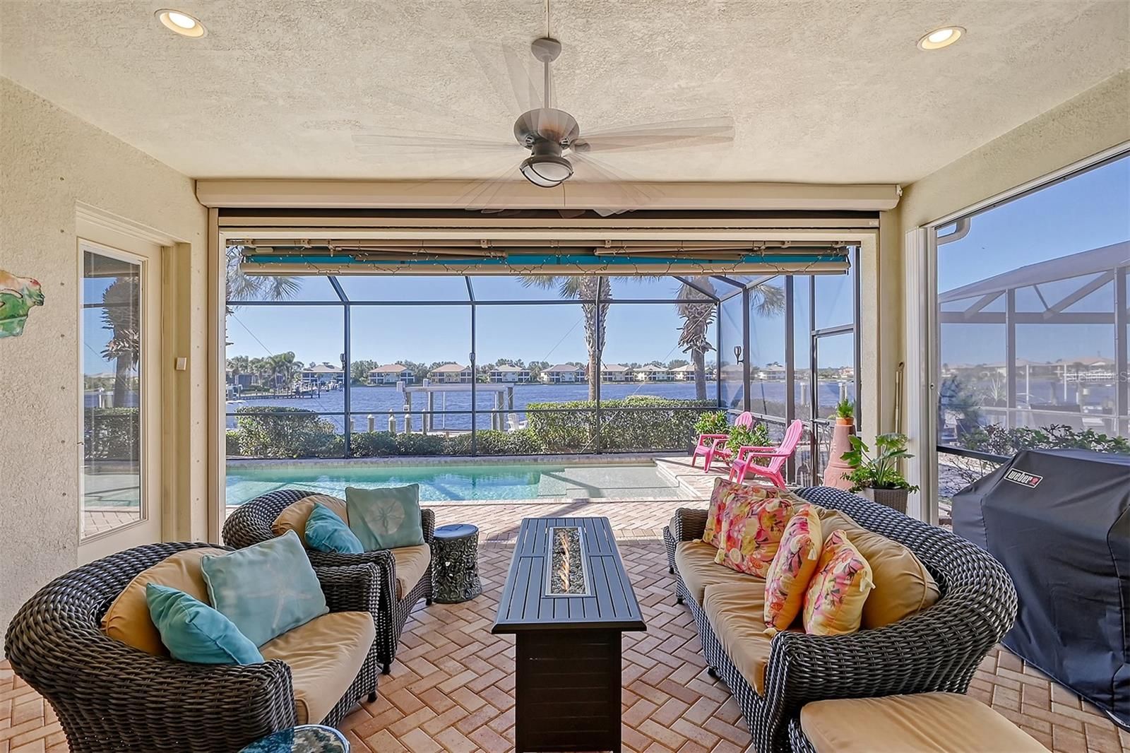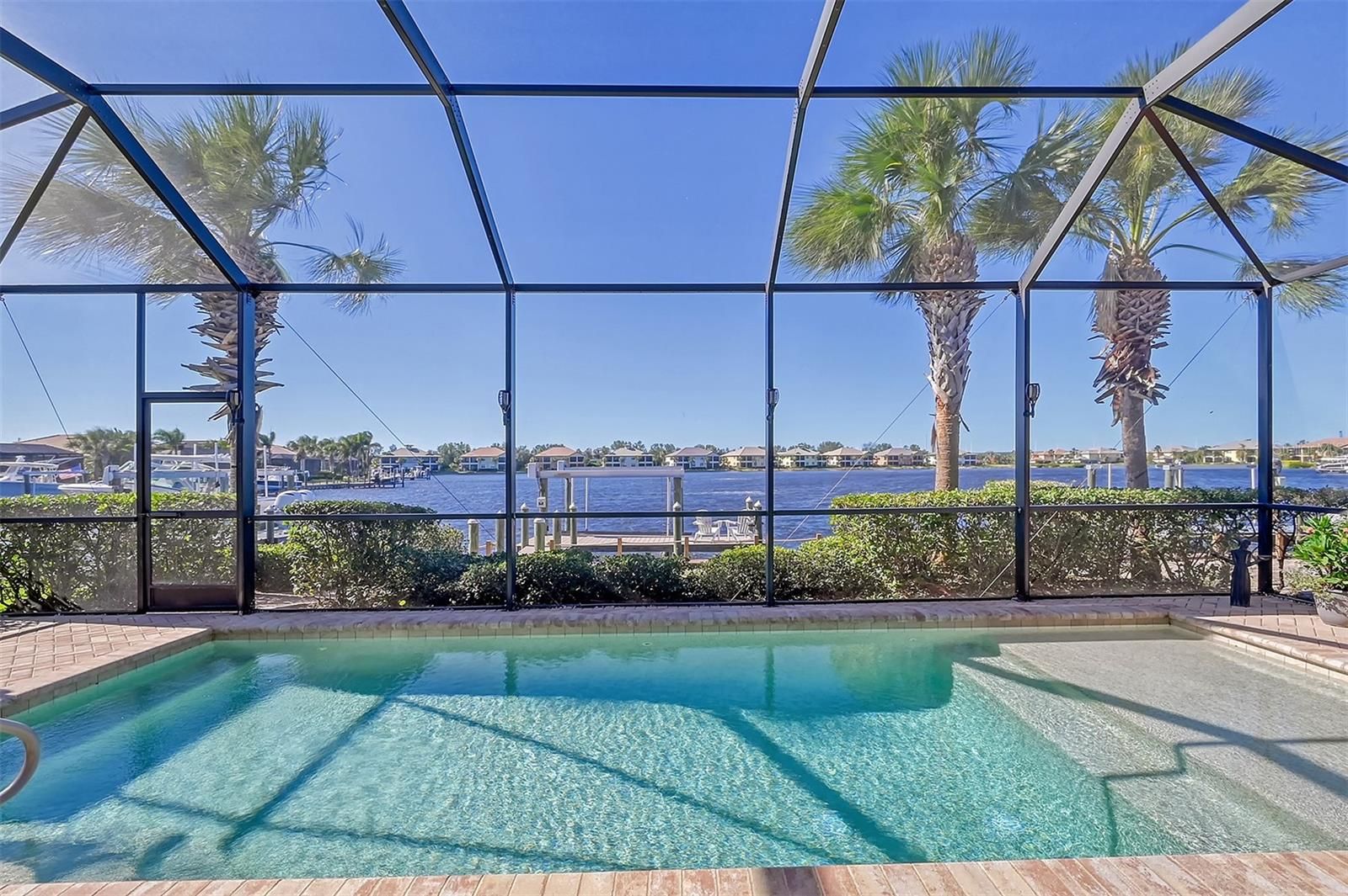 Welcome to Your Secure Boater’s Paradise! Nestled along a serene private lagoon in the gated community of Tidewater Preserve, this stunning Florencia Model home delivers breathtaking waterfront views and an effortless, upscale lifestyle for those seeking the ultimate in coastal luxury. At 3 bedrooms, 2 full baths, a versatile den, and 2,039 sq ft of thoughtfully designed space, it blends elegance with practical sophistication, including a heated saltwater pool that's perfect for year-round relaxation or entertaining. Step outside to your private Trex dock, custom-built to accommodate up to a 30’ power cruiser, complete with one of the lagoon's highest-capacity 16,000-lb lifts for hassle-free boating. Cruise to the Manatee River and Gulf of Mexico via the community's efficient 2-lock lift system. This setup is a seamless blend of convenience with immediate waterfront access. Engineered for ultimate peace of mind, this home features top-tier storm protection: easy-to-deploy RollShield hurricane shutters, a motorized Kevlar screen safeguarding the lanai, bedroom doors, and sliders, plus impact-rated features throughout. Every inch has been meticulously maintained for effortless ownership—dual AC units professionally serviced, a recently pressure-washed and sealed roof (under warranty), pristine lanai, pool deck, and walkway to the dock—all backed by transferable warranties to ensure lasting reliability. Inside, the open-concept design floods every room with natural light and panoramic west-facing lagoon views, where jaw-dropping sunsets paint the sky. Embrace the coastal-inspired motif with beachy elegance: soaring 10’-12’ ceilings, granite countertops galore, and a chef's dream kitchen featuring stainless steel appliances, a grand center island, and upgraded cabinetry for effortless meal prep or gatherings. Unwind in the spacious primary suite, your private oasis with a relaxing garden tub and luxurious walk-in shower. Smart modern touches abound, like natural gas hookups, an efficient tankless water heater, convenient wood-laid attic storage, and an in-wall pest control system—details that deliver daily convenience and delight.Tidewater Preserve elevates everyday living with resort-level amenities designed for vibrant, active lifestyles. Boating fans rejoice: the private marina offers available slips and lifts for instant access to the Manatee River and beyond. Unwind at the recently remodeled Lodge clubhouse, boasting a resort-style pool with stunning river views, a state-of-the-art fitness center, spacious community kitchen, flat-screen TVs, and cozy gas fireplaces—both indoors and out—for ultimate comfort. Fire up the outdoor grill poolside for casual barbecues, or stay active on three pristine Har-Tru tennis courts. Water sports enthusiasts will love the canoeing and kayaking options, with reservable storage racks available for a nominal fee. Security is seamless with a 24/7 staffed gatehouse, while a full-time lifestyle activities director keeps the calendar buzzing. Furry family members get their own large, fenced dog park, and nature lovers can stroll the scenic preserve trail to a tranquil seating area—ideal for soaking in year-round sunrises and sunsets. Tidewater is truly maintenance-free: expert landscaping and lawn care are included in the HOA, so you can focus on what matters—making memories. Just minutes from the powdery white sands of Anna Maria Island for beach days, and the upscale shopping and dining at UTC Mall.