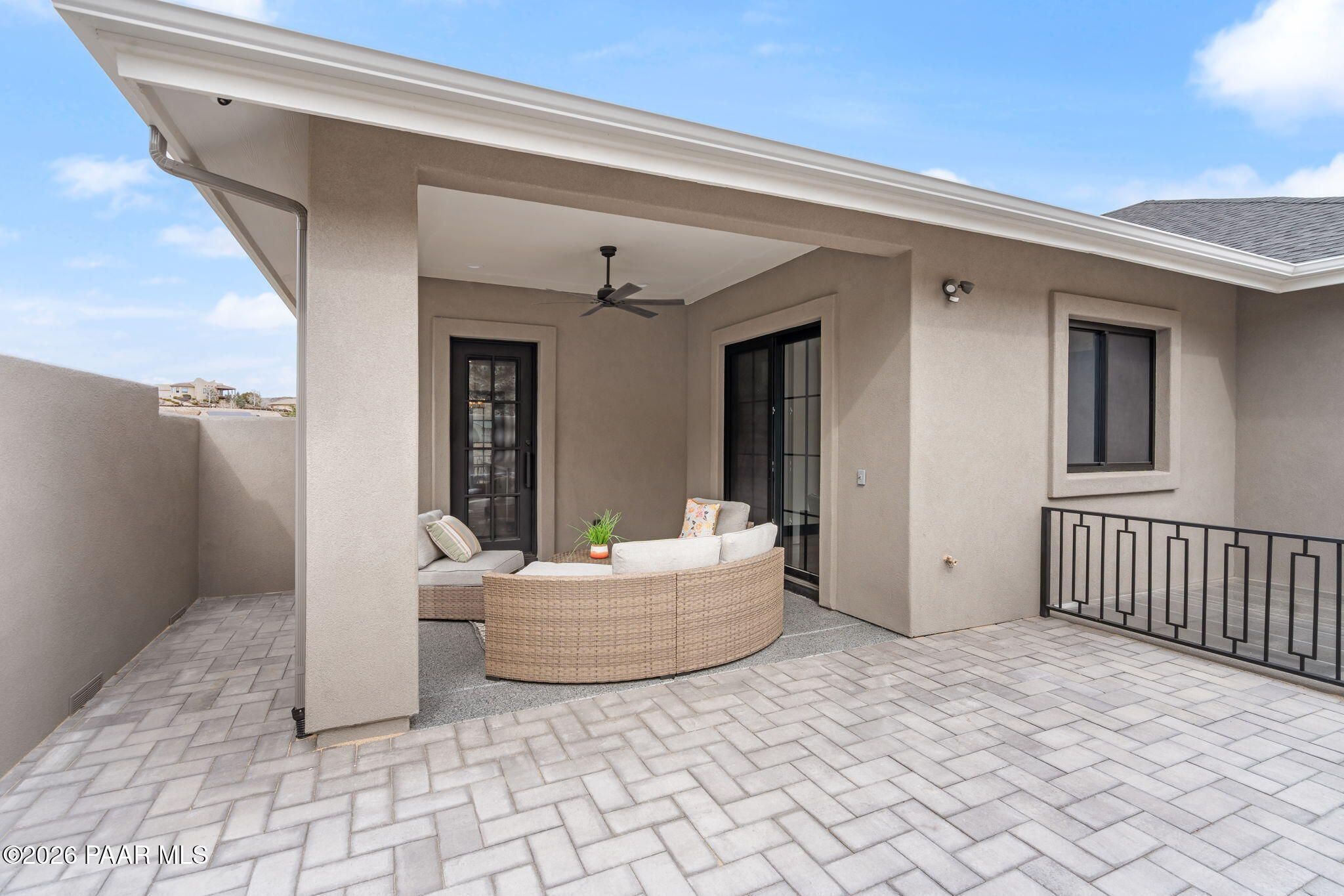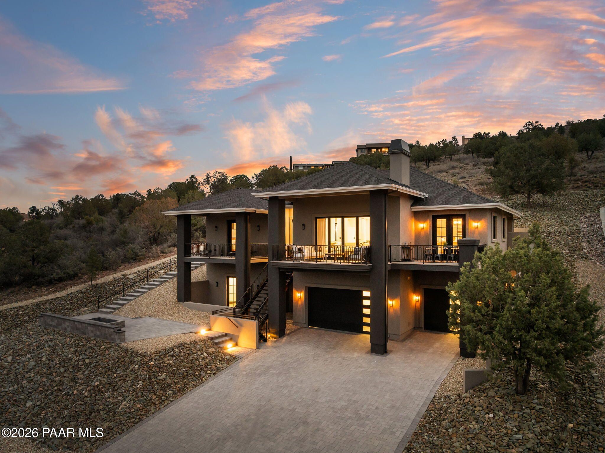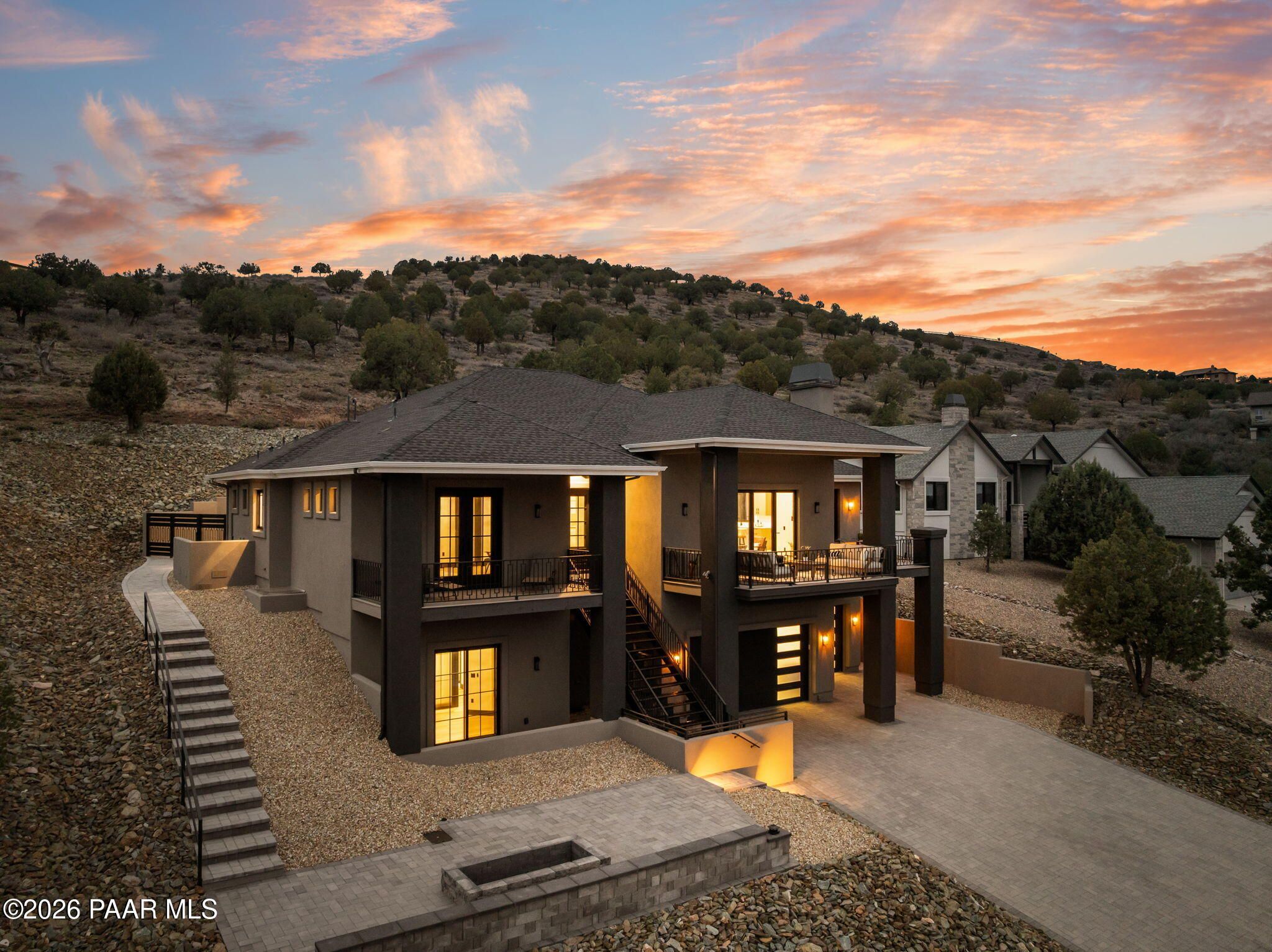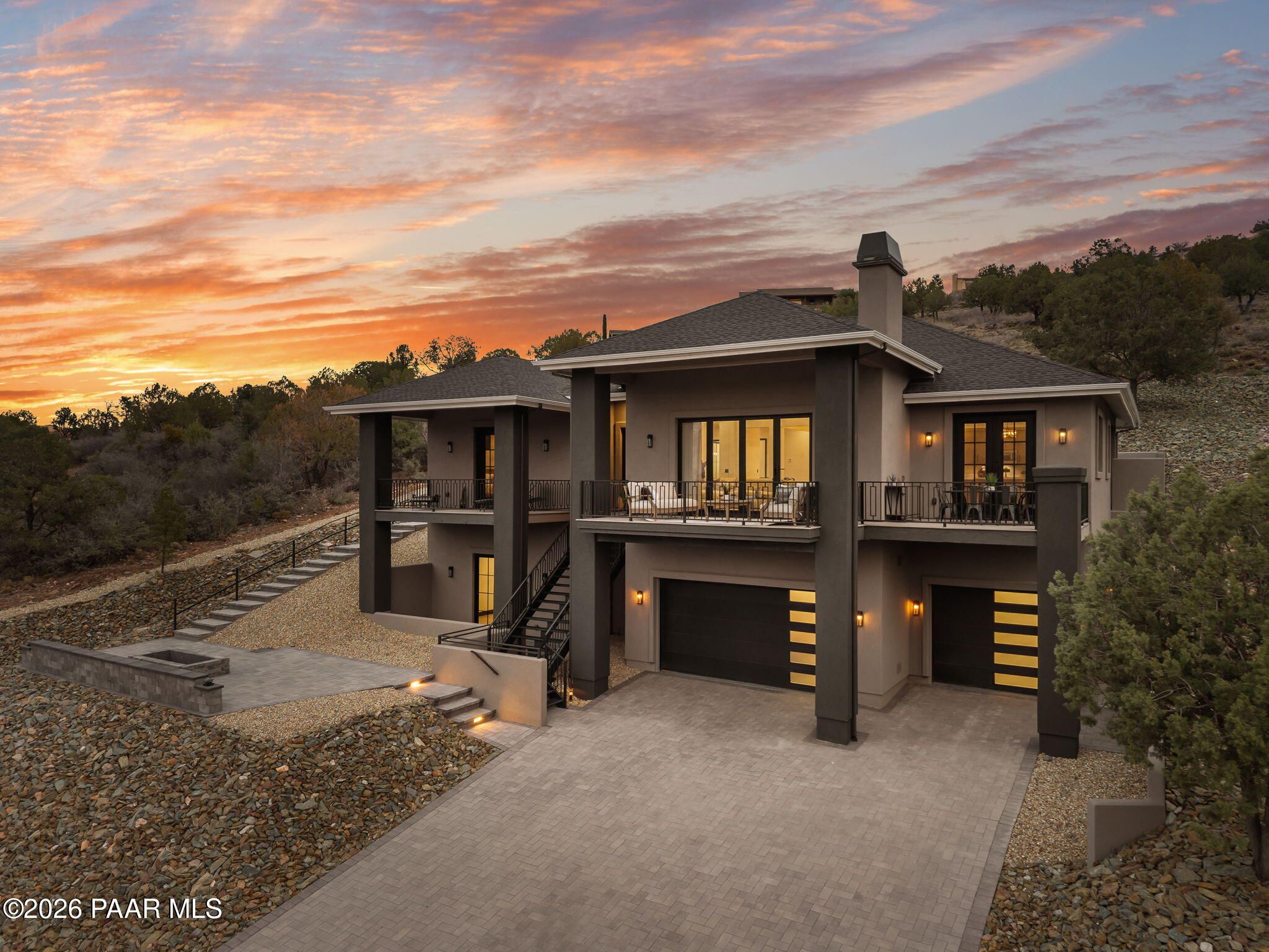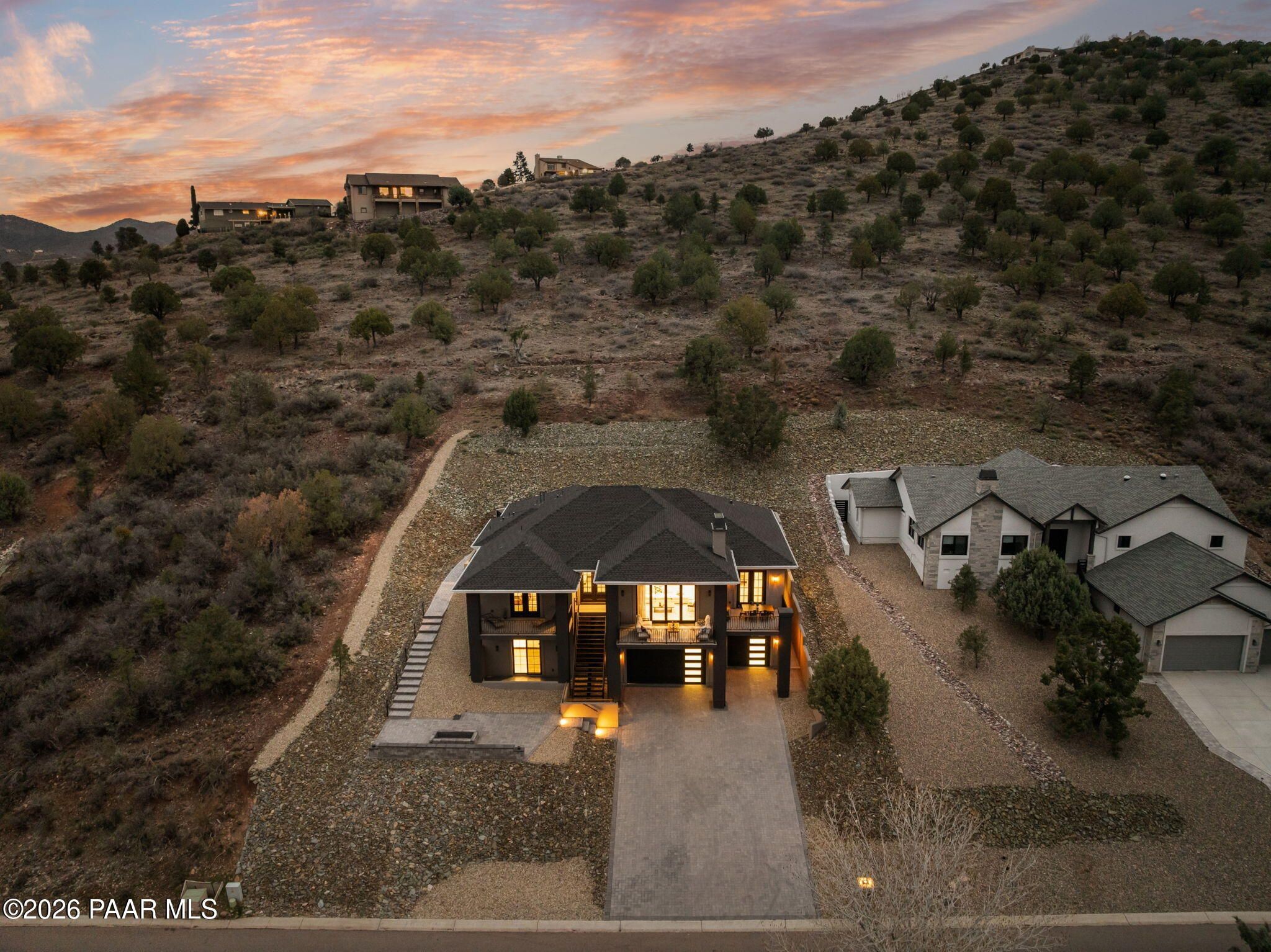 Welcome to this stunning brand new custom estate-built masterpiece nestled in the prestigious Yavapai Hills. Experience unparalleled craftsmanship in this architectural gem seamlessly blends high-end industrial elegance with the warmth of a modern sanctuary.Step through exquisite custom iron doors into a breathtaking main level featuring soaring ceilings and an abundance of natural light pouring through custom European-style windows, perfectly framing the breathtaking views visible from your expansive patio deck. Bi-fold doors seamlessly connect indoor and outdoor living, making this home ideal for savoring Arizona's crisp air, spectacular sunsets, and serene surroundings. No expense was spared in the finishes: Unique Custom Doors: Every bedroom, bathroom, and closet is fitted with sleek aluminum semi-glass doors- a signature touch rarely seen in residential builds. Designer Storage: All bedrooms feature custom closets with integrated high-end cabinetry. Spa-Like Baths: Beautifully curated bathrooms with designer fixtures and premium tile work.A rare and remarkable bonus: the impressive mother-in-law suite or secondary living quarters functions like a complete second home:featuring 10-foot ceilings, its own kitchen, dining and living areas, a dedicated laundry room, direct garage access, 3 bedrooms, and 2 bathrooms -- perfect for multi-generational living, guests, or potential rental income.Step outside to discover a thoughtfully designed exterior with extended privacy: Custom stair railing, a paver driveway leads to the home, and the backyard features large pavers creating inviting, low-maintenance spaces for peaceful outdoor living with exceptional privacy.