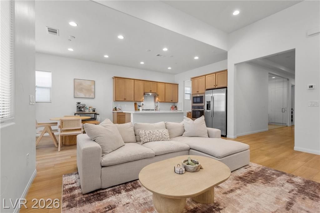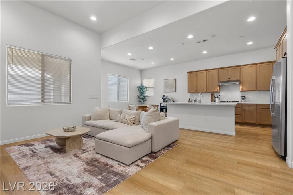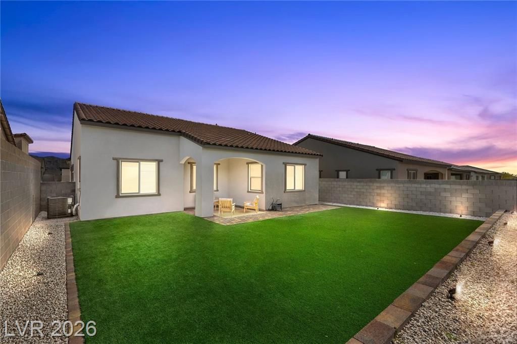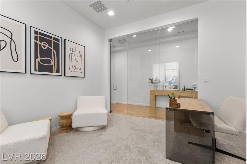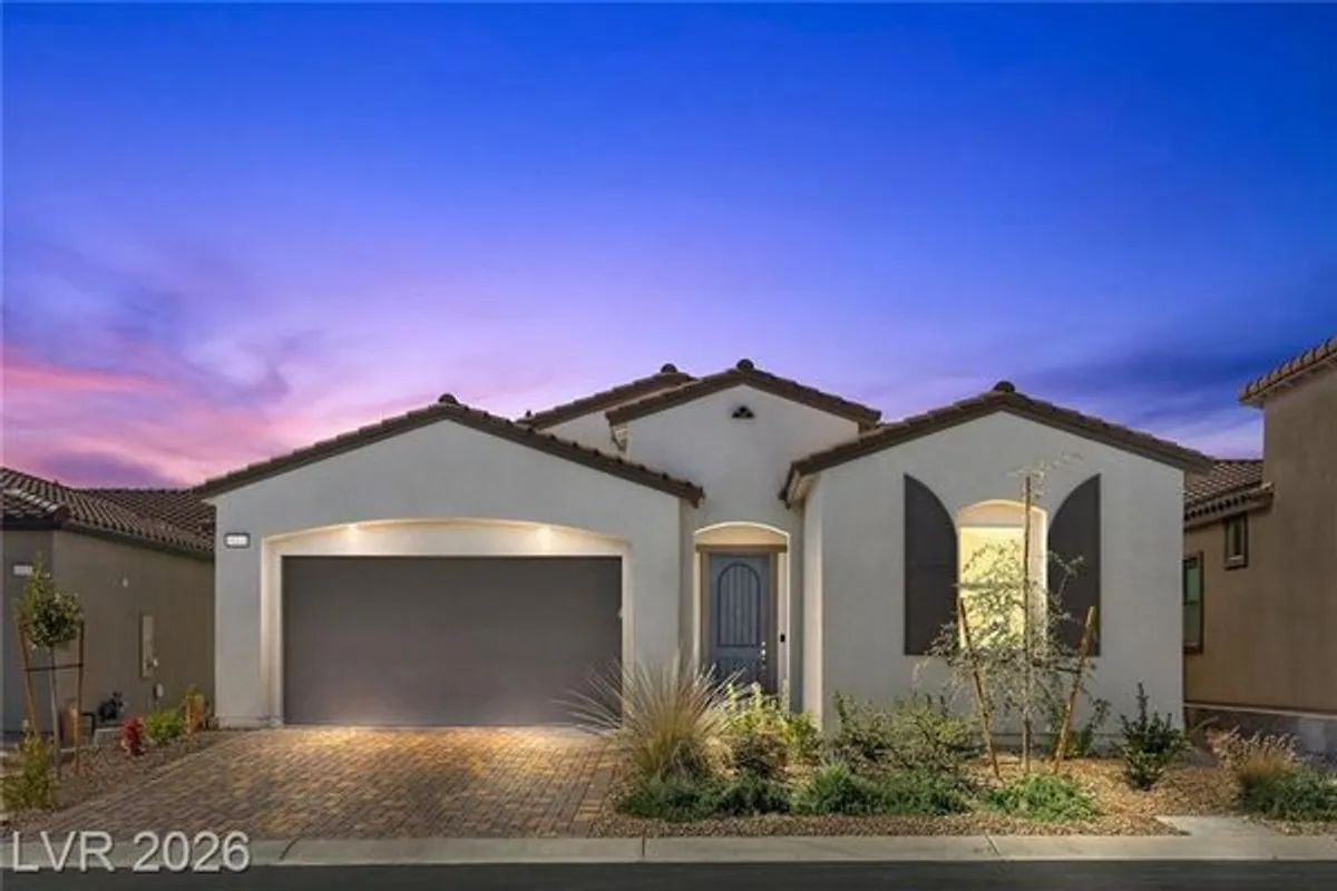 Discover refined desert living in this elegant newer single-story home, perfectly situated in a gated community in the highly desirable northwest Las Vegas area. Featuring 2 spacious bedrooms plus a stylish glass-enclosed office that can easily function as a guest bedroom, this thoughtfully designed residence offers both comfort and flexibility. The open-concept layout is enhanced by a modern kitchen showcasing sleek stainless steel appliances, beautiful quartz countertops, double ovens, and ample cabinetry, ideal for both everyday living and entertaining. Natural light fills the living spaces, creating a warm and inviting atmosphere throughout. Enjoy the convenience of being just minutes from scenic Mount Charleston, premier golf courses, and outdoor recreation, while still close to shopping, dining, and city amenities. This home blends contemporary style with low-maintenance living in a peaceful, secure setting, perfect for those seeking both tranquility and accessibility.