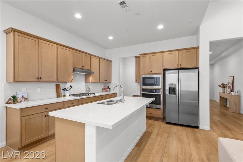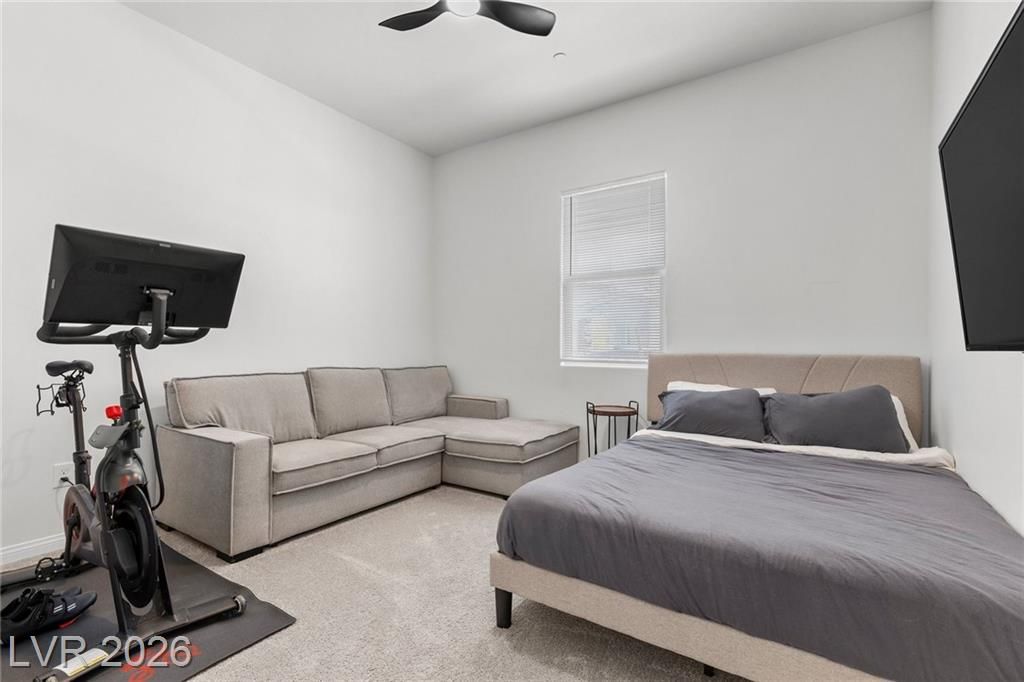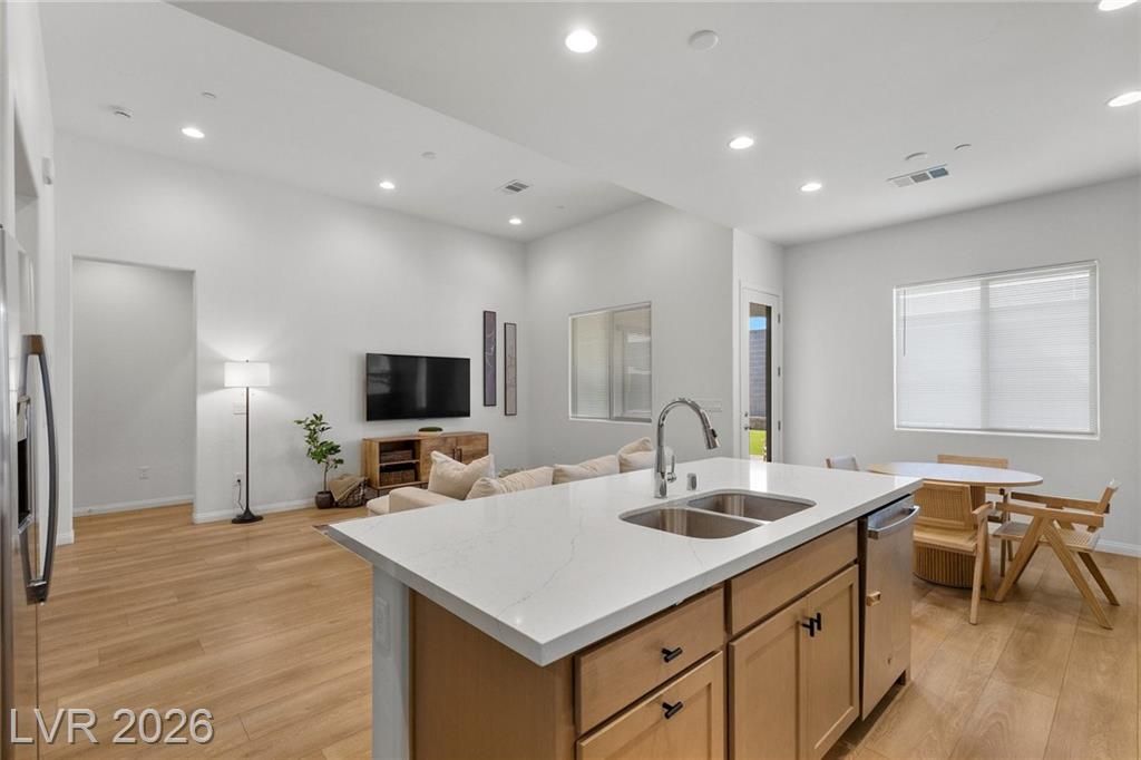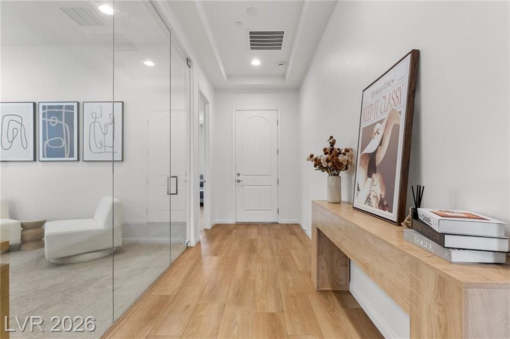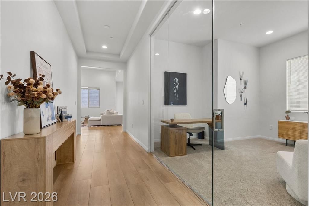 Discover refined desert living in this elegant newer single-story home, perfectly situated in a gated community in the highly desirable northwest Las Vegas area. Featuring 2 spacious bedrooms plus a stylish glass-enclosed office that can easily function as a guest bedroom, this thoughtfully designed residence offers both comfort and flexibility. The open-concept layout is enhanced by a modern kitchen showcasing sleek stainless steel appliances, beautiful quartz countertops, double ovens, and ample cabinetry, ideal for both everyday living and entertaining. Natural light fills the living spaces, creating a warm and inviting atmosphere throughout. Enjoy the convenience of being just minutes from scenic Mount Charleston, premier golf courses, and outdoor recreation, while still close to shopping, dining, and city amenities. This home blends contemporary style with low-maintenance living in a peaceful, secure setting, perfect for those seeking both tranquility and accessibility.