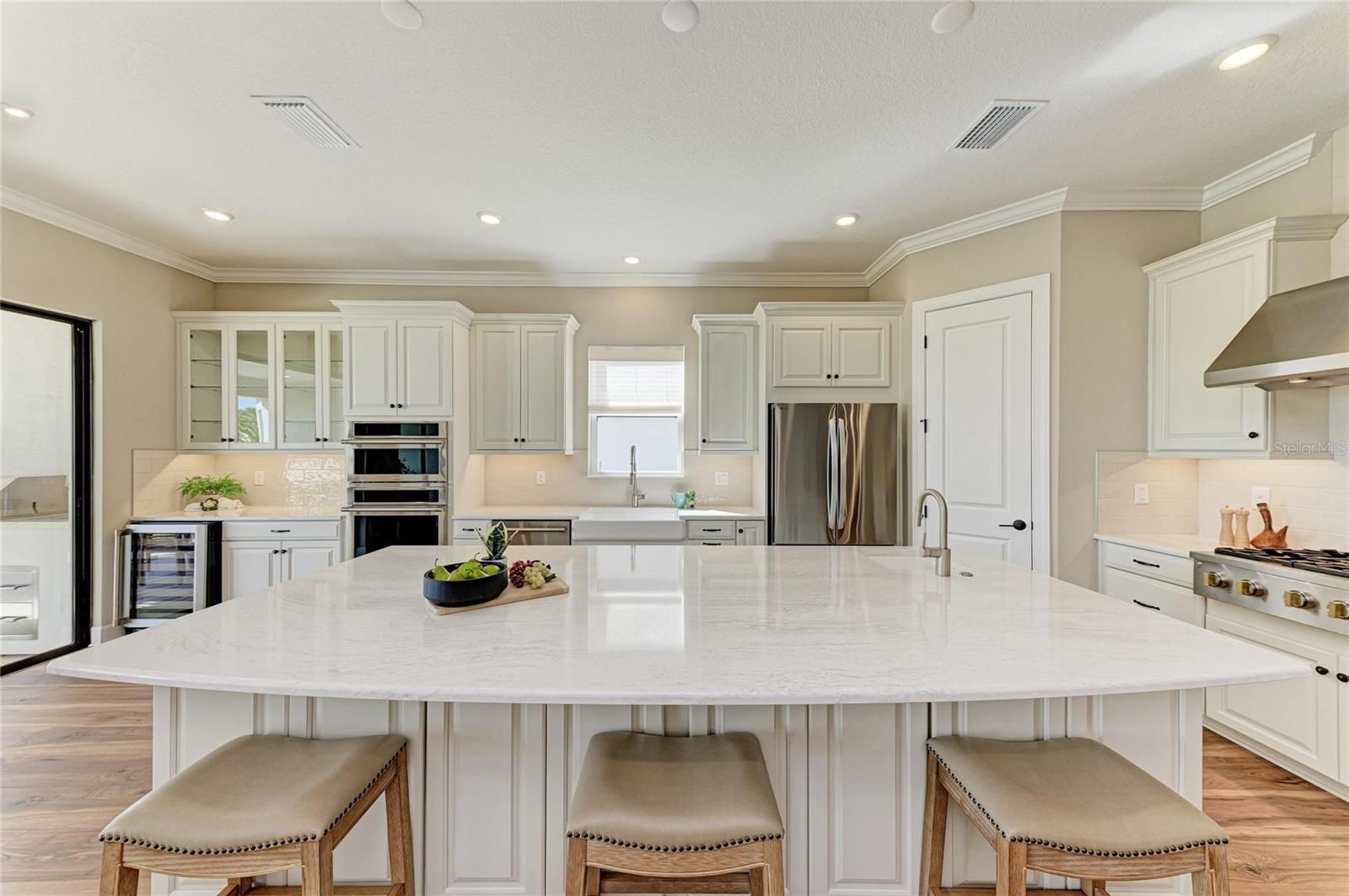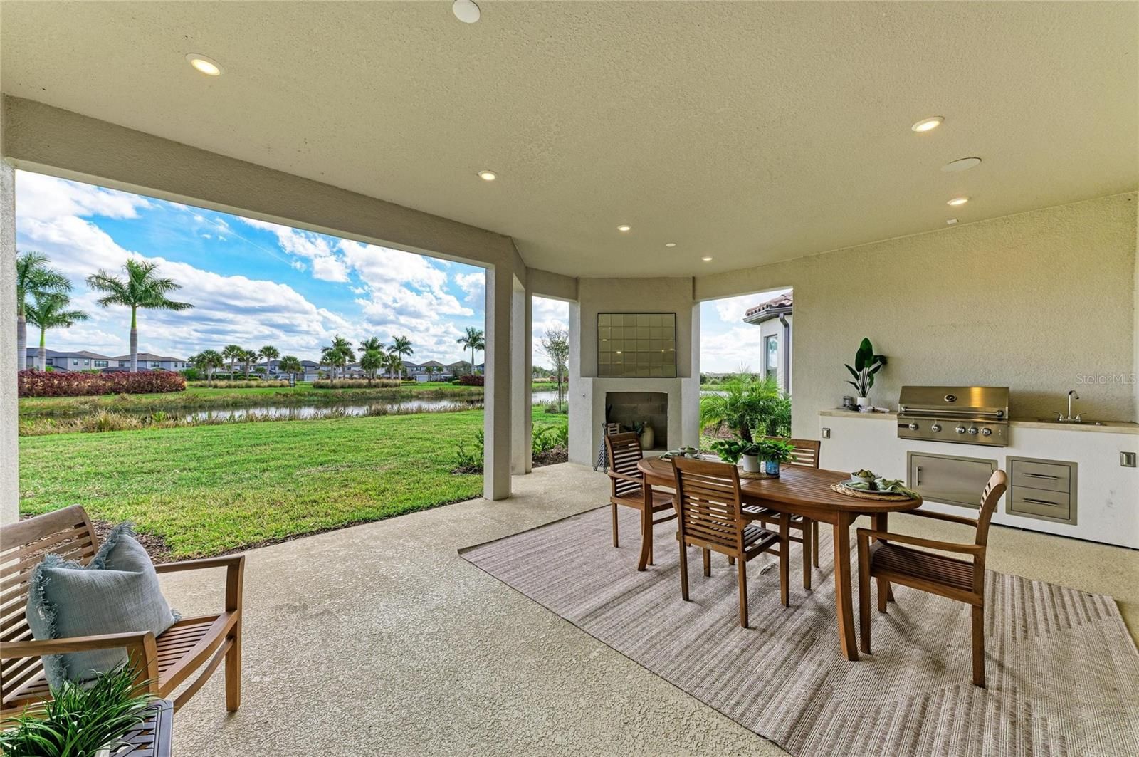 Welcome to the coveted Lazio floor plan in the gated Esplanade section at Skye Ranch, an exceptional residence offering over 2,400 sq. ft. of refined living space and is full of upgrades. This one-of-a-kind home showcases a 3-way split layout with 3 bedrooms, 3 full baths, a private den, and a TANDEM 3-car garage. Elegant details abound, including 10’ ceilings, 8’ interior doors, crown molding, custom tray ceilings, and beautiful level 5 flooring throughout (level 4 tile in baths, no carpet). The glass front glass door leads to a welcoming foyer with double tray ceilings that flows into a spacious great room and dining area, ideal for both daily living and entertaining. The gourmet kitchen impresses with GE Monogram stainless steel appliances, a generous island with knee-wall cabinetry, soft-close drawers, pull-outs, upgraded wood shelving in pantry closet and a farmhouse sink set beneath a sunlight-filled window. Two sets of sliding doors open to the expansive extended lanai featuring a fireplace wall and outdoor kitchen already installed, ideal for alfresco dining, serene water views, and ample space to add a future pool/spa that is already pre-wired. The luxurious primary suite offers a tray ceiling, bay window extension, customized walk-in closet, and the alternate primary bath design with dual sinks, drawers, and a large walk-in shower. Additional highlights include a customized laundry with cabinets, built-in sink and new washer and dryer, privacy pocket doors for the study, epoxy garage floors, and upgraded garage door opener for the 3-car tandem garage. Take advantage of the fully paid smart home package that is conveyed to buyer, allowing the new owner to easily activate and customize with a designer the professional installation of outdoor lighting, connection of built-in speaker system in the living room and extended lanai, plus additional smart integrations designed to enhance convenience and entertainment throughout the home. Enjoy miles of trails and full access to Skye Ranch amenities, resort-style pools, fitness center, dog parks, and more! The new Venue Day Spa, Bahama Bar, and the COVE lazy river and slide are coming soon. This rare opportunity is available now, don’t wait to make this exceptional home yours!