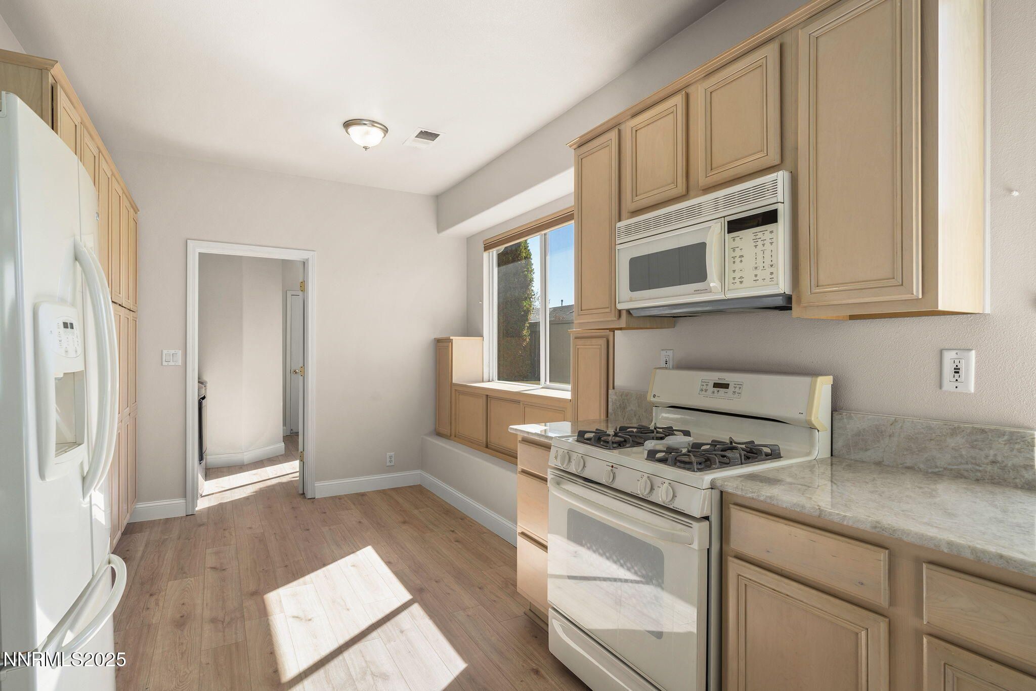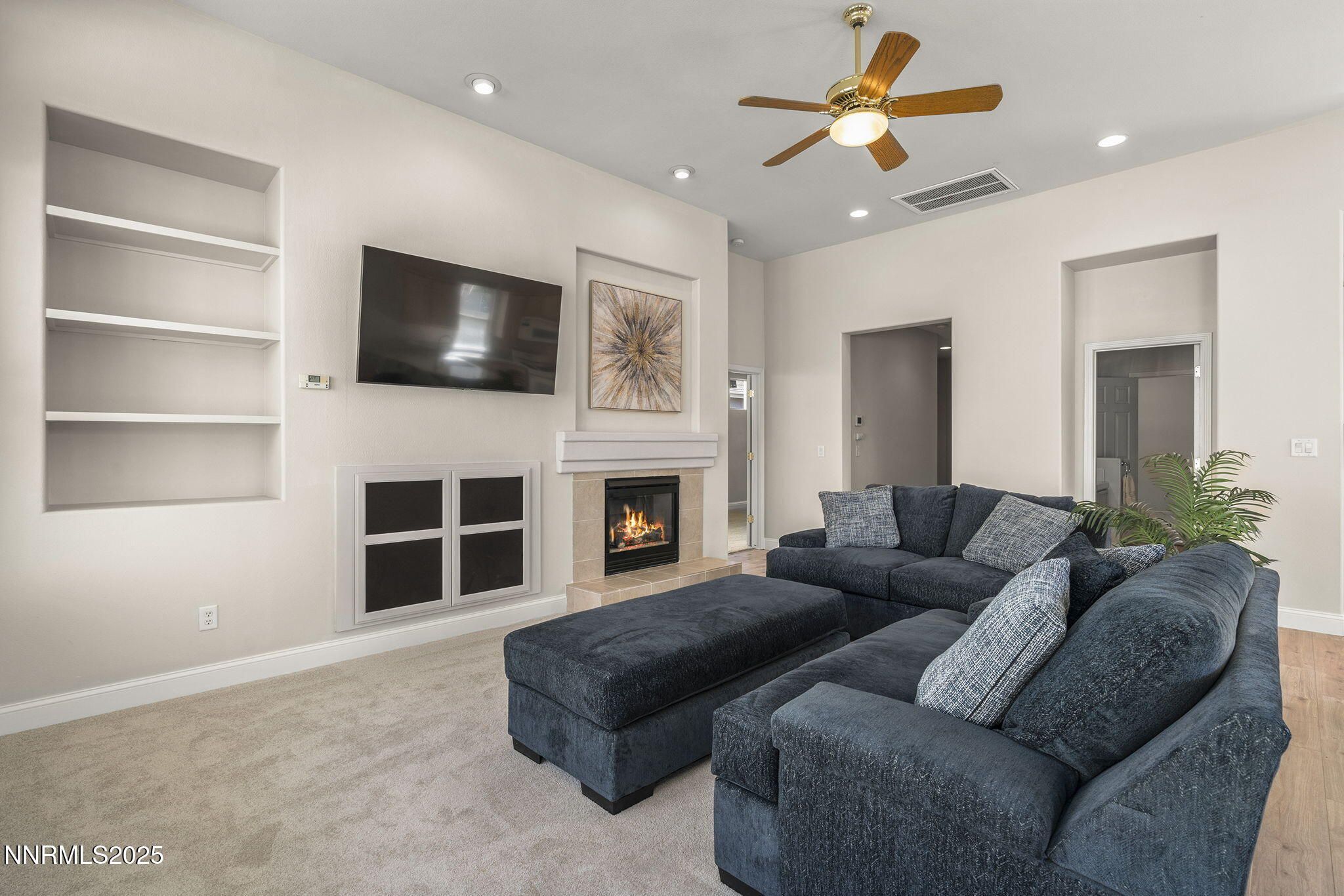 Welcome to effortless living in Miners Village, a sought-after 55+ gated community in Double Diamond. This charming single-level home offers privacy and comfort, perfectly positioned next to a walking path with no neighbors on one side. Enjoy a low-maintenance lifestyle with front yard care provided by the HOA. Beautifully maintained and thoughtfully upgraded, the home features solar flex rolling shutters on the west side, solar screens on the southwest side, and updated mechanicals — heater, A/C, and water heater all replaced in 2017. The stylish kitchen boasts quartzite countertops, GE Profile Performance appliances, generous cabinetry, and luxury vinyl plank flooring. The spacious primary suite includes a large walk-in closet, dual sinks, and a linen closet, while the secondary bedroom offers double doors and an attached bath with a walk-in shower—also accessible from the main living area. The inviting living room showcases built-in shelving and a cozy fireplace with a blower, creating the perfect gathering space. Step outside to a private, fully low-maintenance backyard with flower beds, concrete pavers, and a covered patio ideal for relaxing or entertaining. The garage provides ample built-in cabinets, a workbench area, and upper racks for storage. Enjoy access to the community clubhouse with a fitness center, pool, and hot tub. Conveniently located near walking trails, shopping, dining, freeway access, and medical services—this home is the perfect blend of comfort, convenience, and carefree living in South Reno. See private remarks: