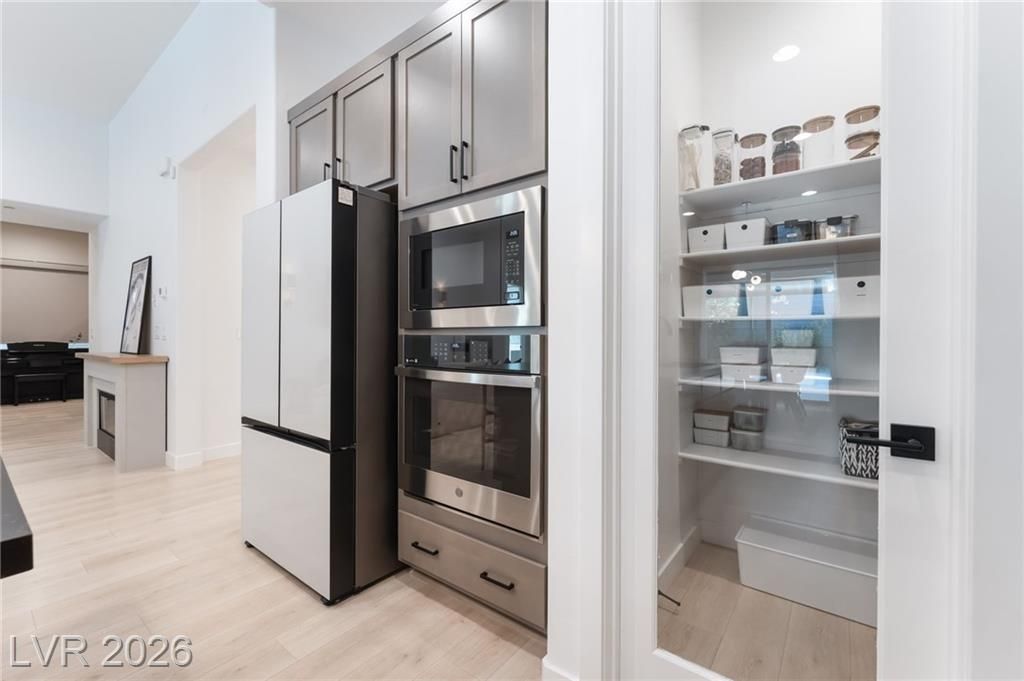 2024 built single story home with 12 ft ceilings. As you walk through the front entrance you are greeted by the open floor plan and direct sight line to the custom backyard. Premium upgraded flooring including carpet, tile, and hardwood. The chefs kitchen features premium extended kitchen island and cabinets. Built in gas oven. Built in microwave and gas cooktop. The living room has built in ceiling speakers. Custom blinds and curtains throughout the home let in plenty of natural light. Primary bedroom retreat with bath featuring curb less shower with rain shower head. Custom California Closet organizer system in primary closet. Upgraded ceiling lights in bedrooms. The exterior of the home has an extended driveway, and the block walls have 2 added rows for privacy. Backyard is truly spectacular w/ 1200Sqft. of top tier Travertine, covered patio, sunken gas fire pit, designer tiled entertainment wall with fireplace. Raised planter w/ river rock premium cactus and plants. Fruit trees.