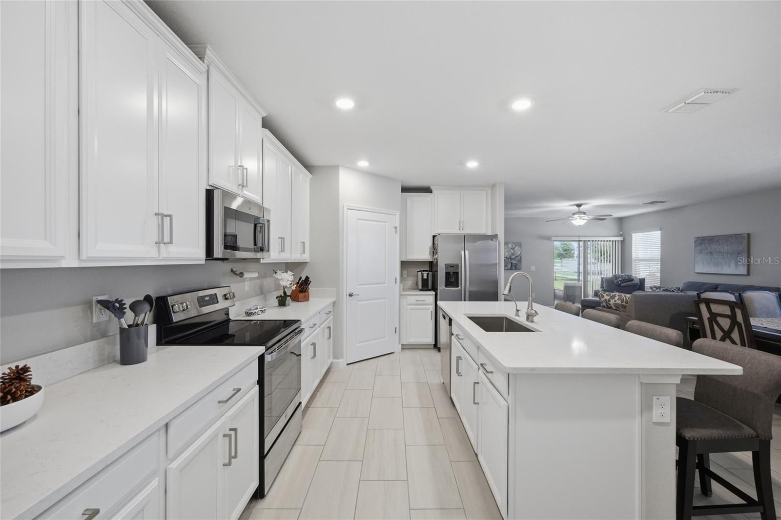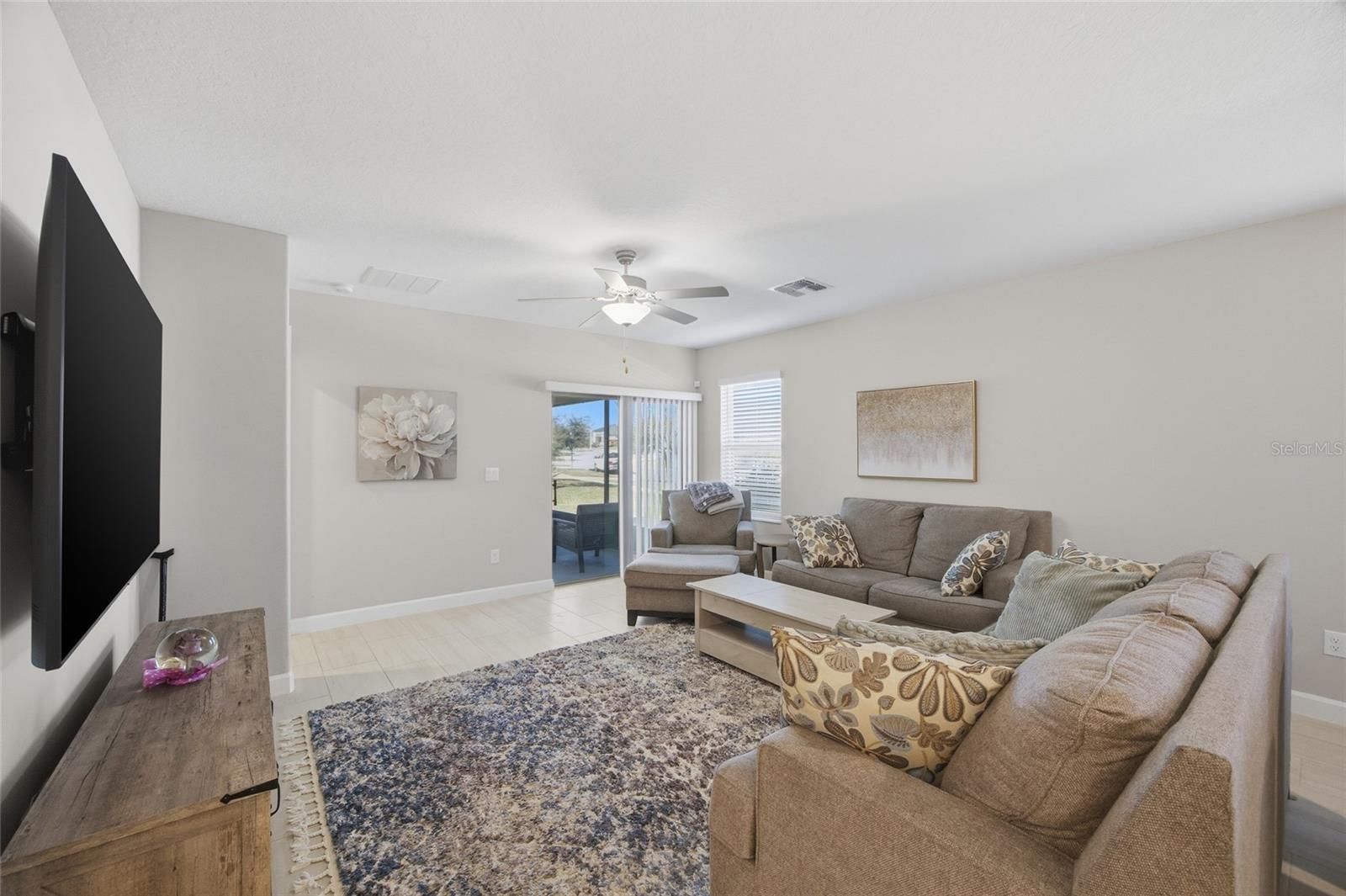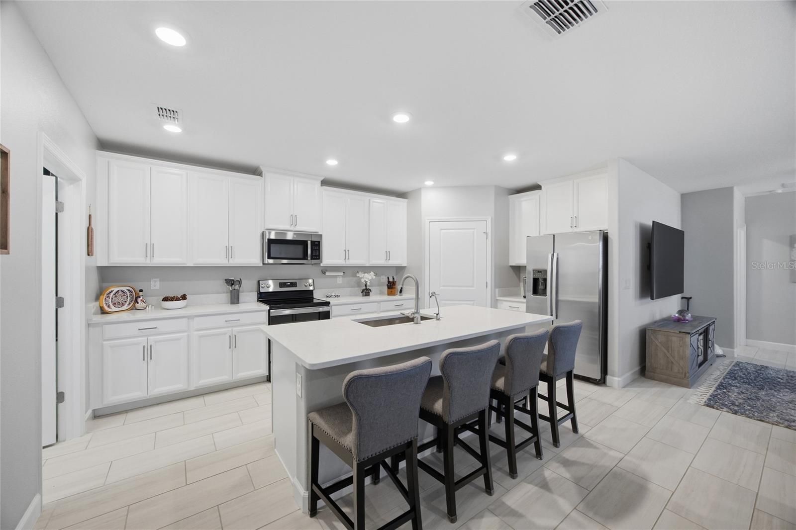 Welcome to this modern corner villa, built in 2022, offering 2 bedrooms, 2 bathrooms, plus a den/office designed for comfort and low-maintenance living. Inside, the open-concept layout features a spacious kitchen with a large center island, stone countertops, stainless steel appliances, white cabinets and a pantry—perfect for both everyday living and entertaining. The kitchen flows seamlessly into the dining area and living room, which opens to a covered outdoor seating area, ideal for relaxing or hosting guests. Additional highlights include a generous laundry room and an attached one-car garage providing convenience and extra storage. Located in Medley at Mirada, a gated 55+ community in San Antonio, residents enjoy a true resort-style lifestyle with minimal upkeep. Medley offers its own private amenity campus, featuring a beautifully appointed clubhouse, fitness center, social and event spaces, and inviting gathering areas designed to foster an active, connected community. On-site bar/lounge and dining options make it easy to socialize and enjoy events close to home. Residents also have access to Mirada’s iconic crystal lagoon, a stunning resort-style destination with beach-like shores and recreational activities that truly set this community apart. Conveniently located near shopping, dining, and I-75, with easy access to Tampa and surrounding areas, this home blends relaxation, lifestyle, and convenience in one exceptional 55+ neighborhood.