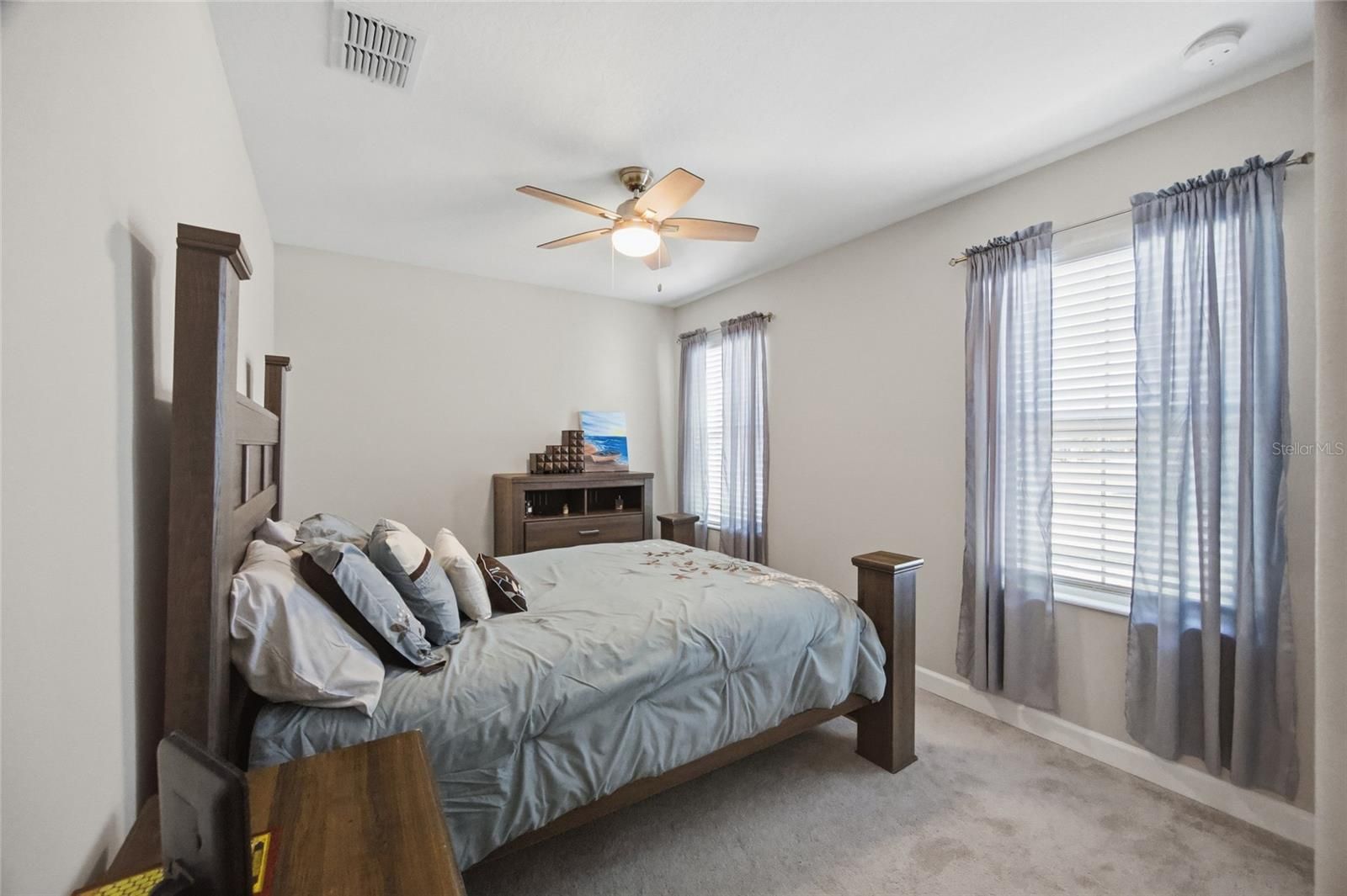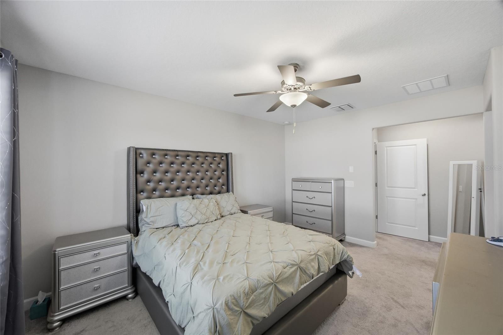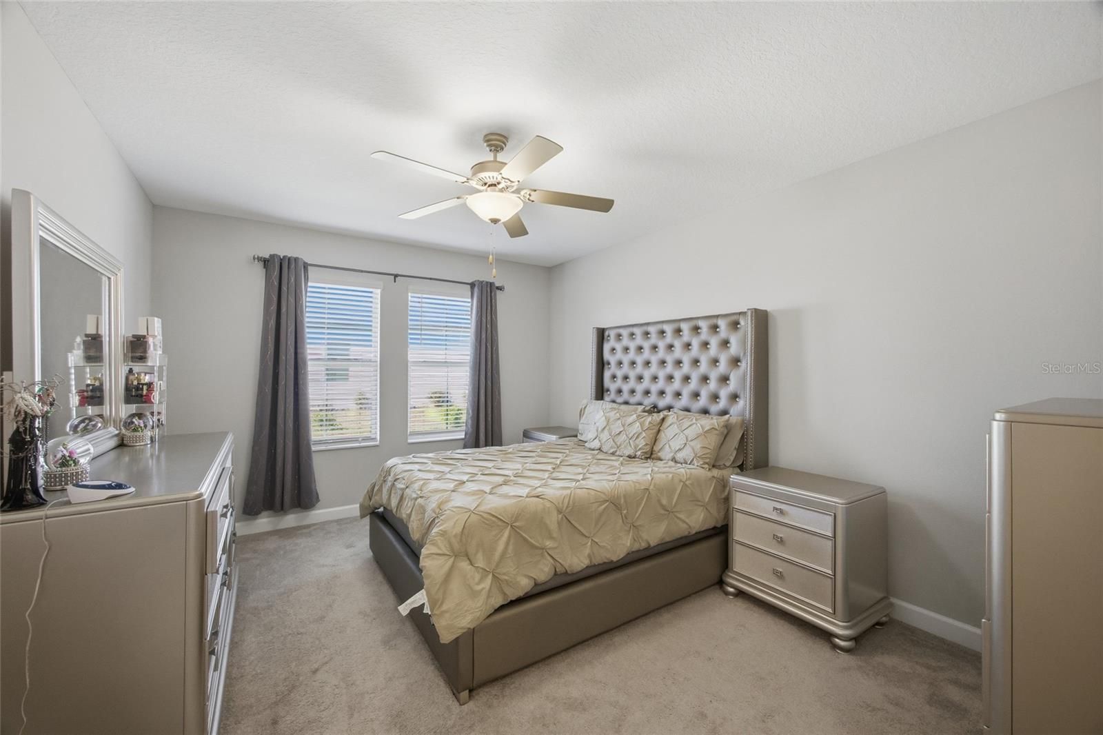 - Built-in Features, Ceiling Fan(s), Eat-in Kitchen, High Ceilings, Kitchen/Family Room Combo, Living/Dining Room, Open Floorplan, Main Level Primary, Solid Surface Counters, Split Bedrooms, Thermostat, Walk-In Closet(s)