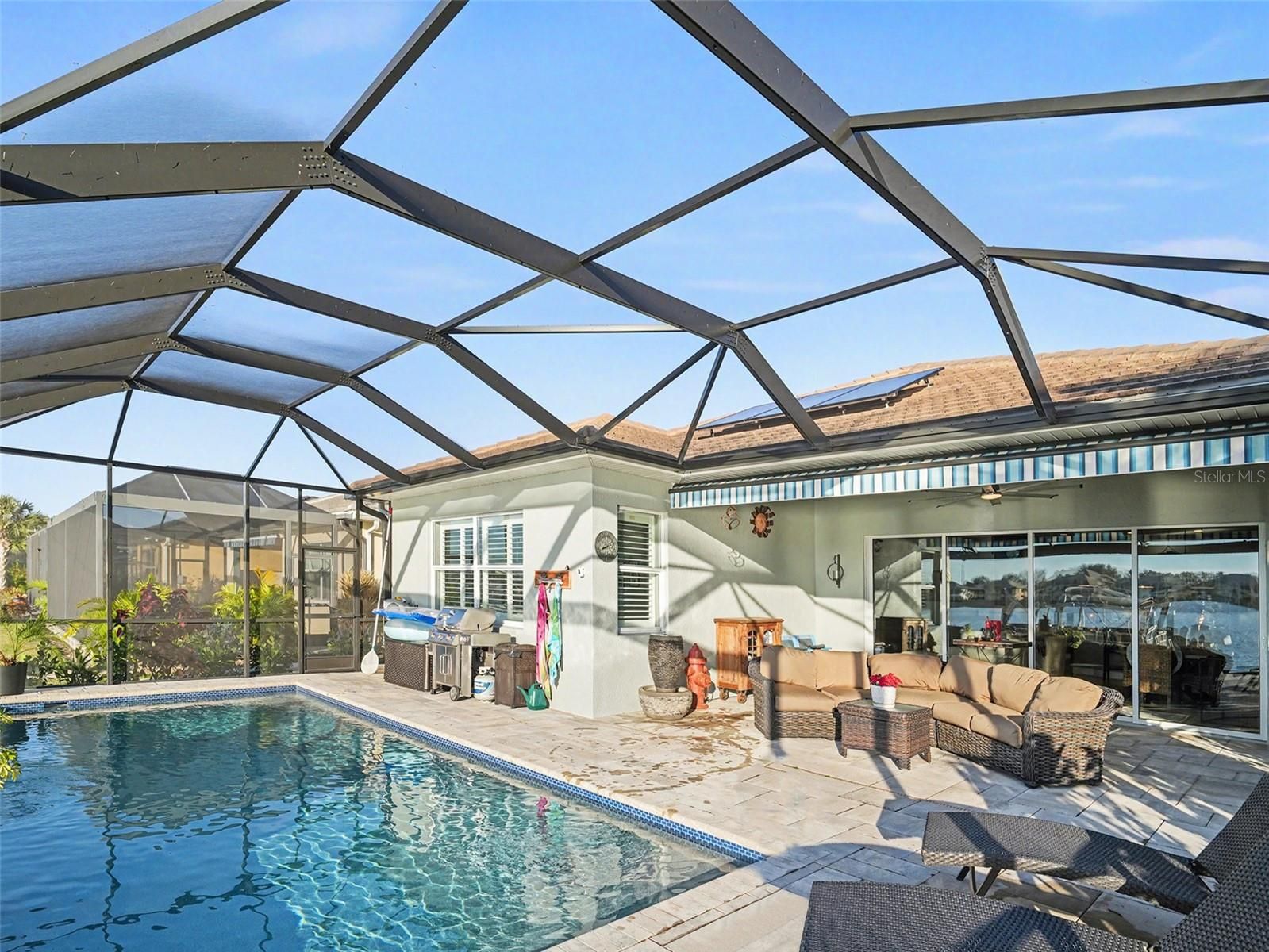 Experience luxurious waterfront living in this extensively updated residence, where nearly every detail has been thoughtfully upgraded. The curb appeal is immediate, featuring a freshly painted exterior, brand-new professionally designed landscaping with accent lighting, and a widened paver driveway leading to a garage finished with epoxy floors and built-in storage. Upon entering, you are greeted by a charming coastal tile accent in the entry niche, setting the tone for the sophisticated interior. Architectural details abound throughout the home, including tray ceilings, intricate crown molding, and updated custom light fixtures and fans. French doors open to a dedicated office space complete with a built-in closet. The heart of the home is the kitchen, which has been beautifully refreshed with updated cabinets and a new neutral tile backsplash. It is fully equipped with granite countertops, a gas range, pantry storage, and a reverse osmosis water system. The living room is highlighted by striking wood beams on the ceiling, while the dining area features a custom wood accent wall and custom plantation shutters. The guest wing is equally impressive, featuring a convenient Jack and Jill bathroom between the second and third bedrooms, updated with new cabinets and granite surfaces. The private primary suite is a true retreat, designed with a focus on relaxation and coastal elegance. The bedroom is defined by a beautiful tray ceiling with shiplap wood detailing and a contemporary ceiling fan, while large windows with plantation shutters offer serene waterfront views. This leads into the spa-like ensuite, which boasts a sprawling double vanity with new granite, grey-washed cabinetry, and custom-framed mirrors centered around a decorative tile niche. The space is completed by a deep soaking tub and a separate glass-enclosed walk-in shower featuring decorative tile accents. The true magic happens outdoors. An extended wall-to-wall slider door opens the living area completely to the expansive lanai, which is protected by upgraded "noseeum" screening and features motorized screens for ultimate comfort. Enjoy the ambiance of an optional water fountain before taking a dip in the brand-new, heated and cooled saltwater swimming pool with a cascading waterfall feature. A new paver walkway leads down to your private waterfront dock, fully equipped with power, water, a fish cleaning station, and a 12000lb lift. For the complete package, the current pontoon boat is negotiable at a $15,000 value. Practical upgrades throughout the property include a whole-home water softener, a utility sink in the laundry room, and an existing connection for a generator (generator negotiable).