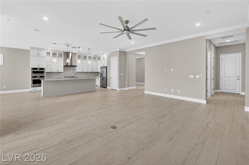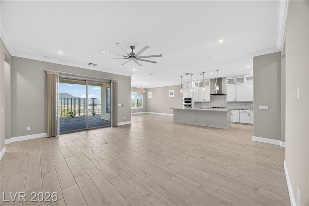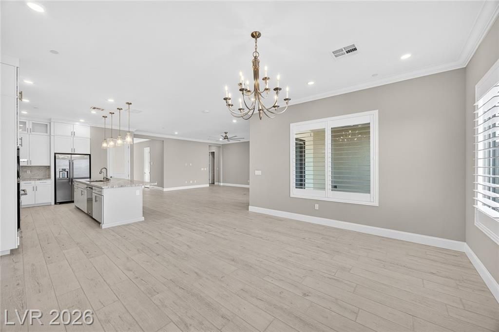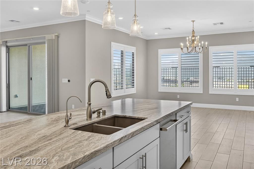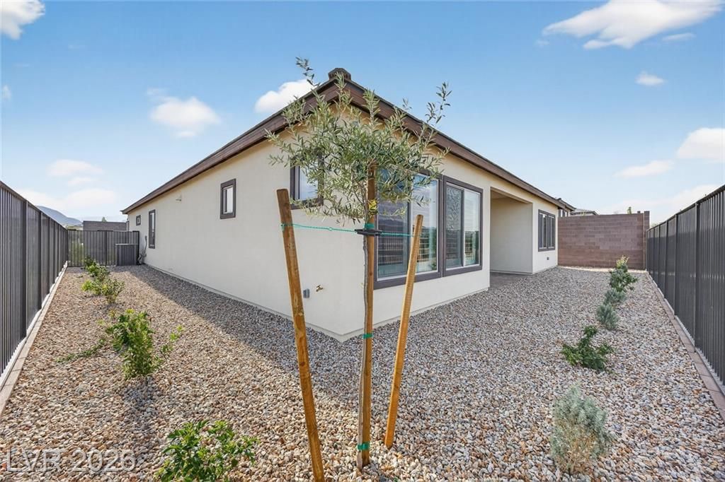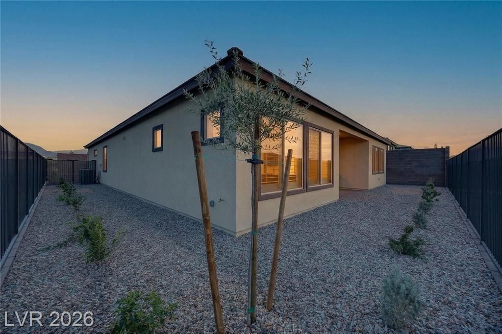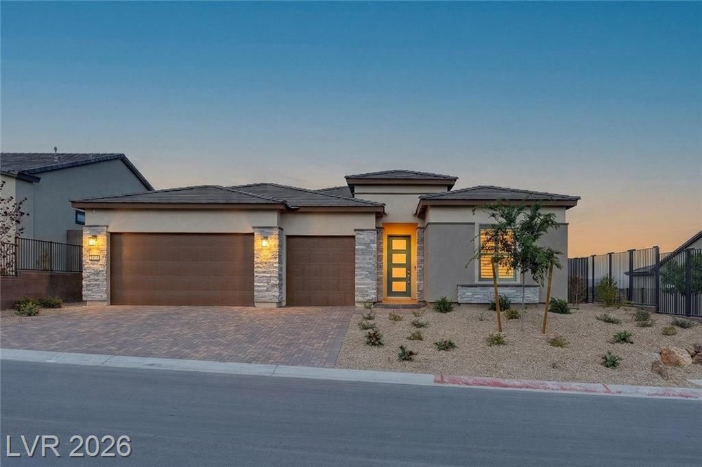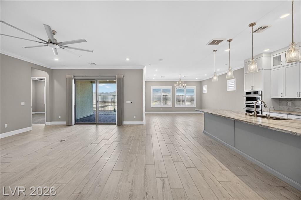 This is it—the largest model with a 3-car garage on a premium lot with fully paid-off solar in guard-gated Trilogy Sunstone, one of Las Vegas’s premier 55+ communities. Built in 2025, this 3-bedroom plus den home features an open-concept kitchen, dining, and living area designed for how it lives over time. Upgrades include tile flooring, quartz countertops, upgraded cabinetry, plantation shutters, electric blinds, ceiling fans, and a laundry room with cabinets and sink. After-market upgrades include designer lighting, crown molding, water softener, reverse osmosis, and completed backyard landscaping. Not builder-basic—fully finished and move-in ready. Trilogy Sunstone offers a clubhouse, pool and spa, fitness center, pickleball courts, fire pits, and an active lifestyle in Northwest Las Vegas.
