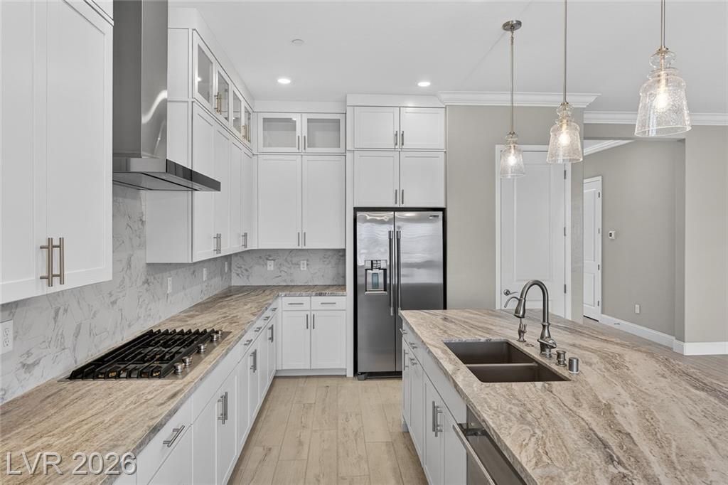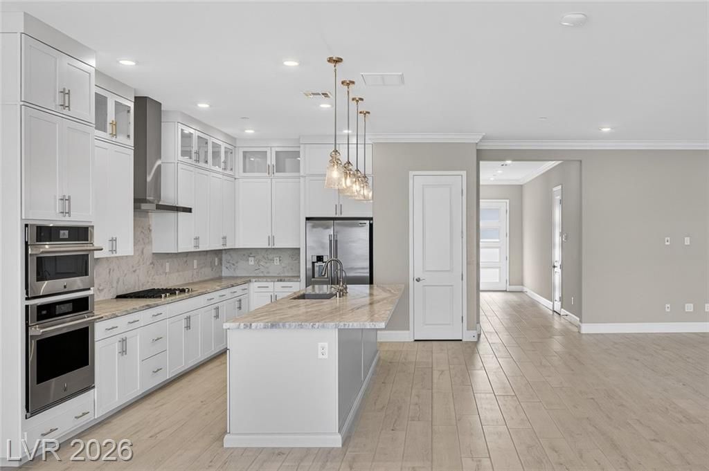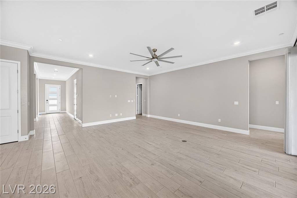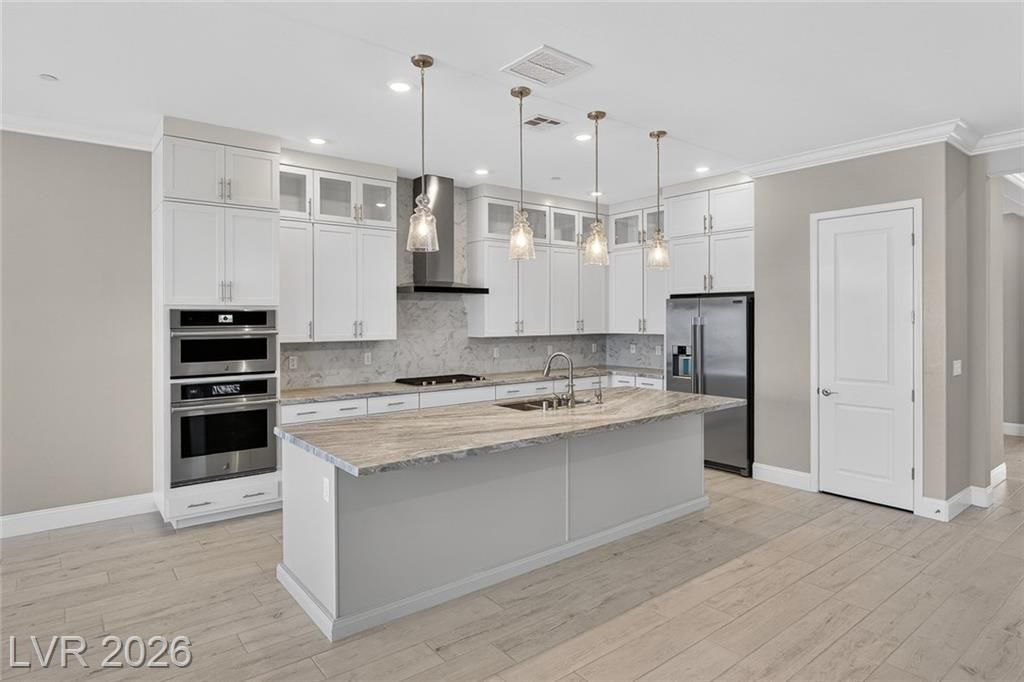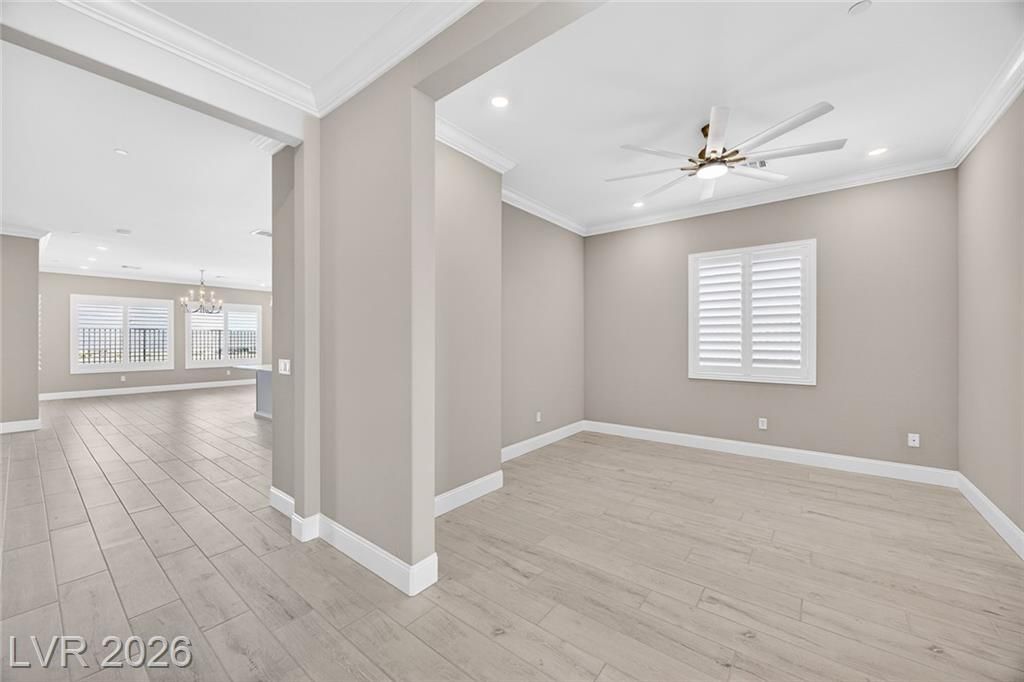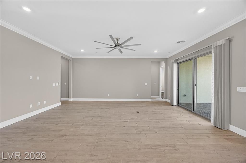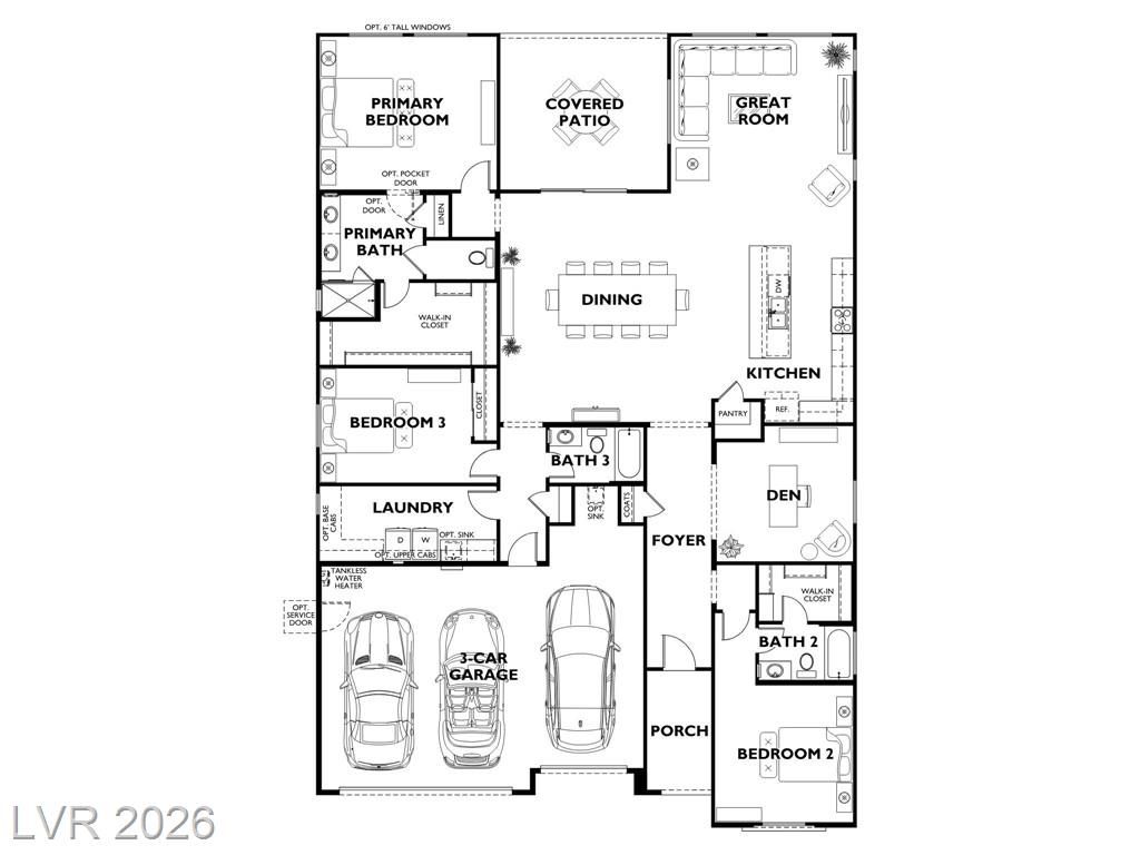 This is it—the largest model with a 3-car garage on a premium lot with fully paid-off solar in guard-gated Trilogy Sunstone, one of Las Vegas’s premier 55+ communities. Built in 2025, this 3-bedroom plus den home features an open-concept kitchen, dining, and living area designed for how it lives over time. Upgrades include tile flooring, quartz countertops, upgraded cabinetry, plantation shutters, electric blinds, ceiling fans, and a laundry room with cabinets and sink. After-market upgrades include designer lighting, crown molding, water softener, reverse osmosis, and completed backyard landscaping. Not builder-basic—fully finished and move-in ready. Trilogy Sunstone offers a clubhouse, pool and spa, fitness center, pickleball courts, fire pits, and an active lifestyle in Northwest Las Vegas.
