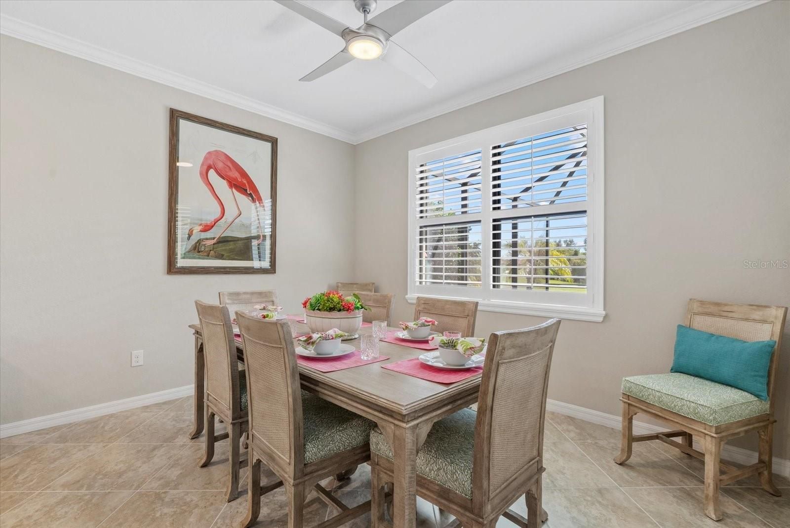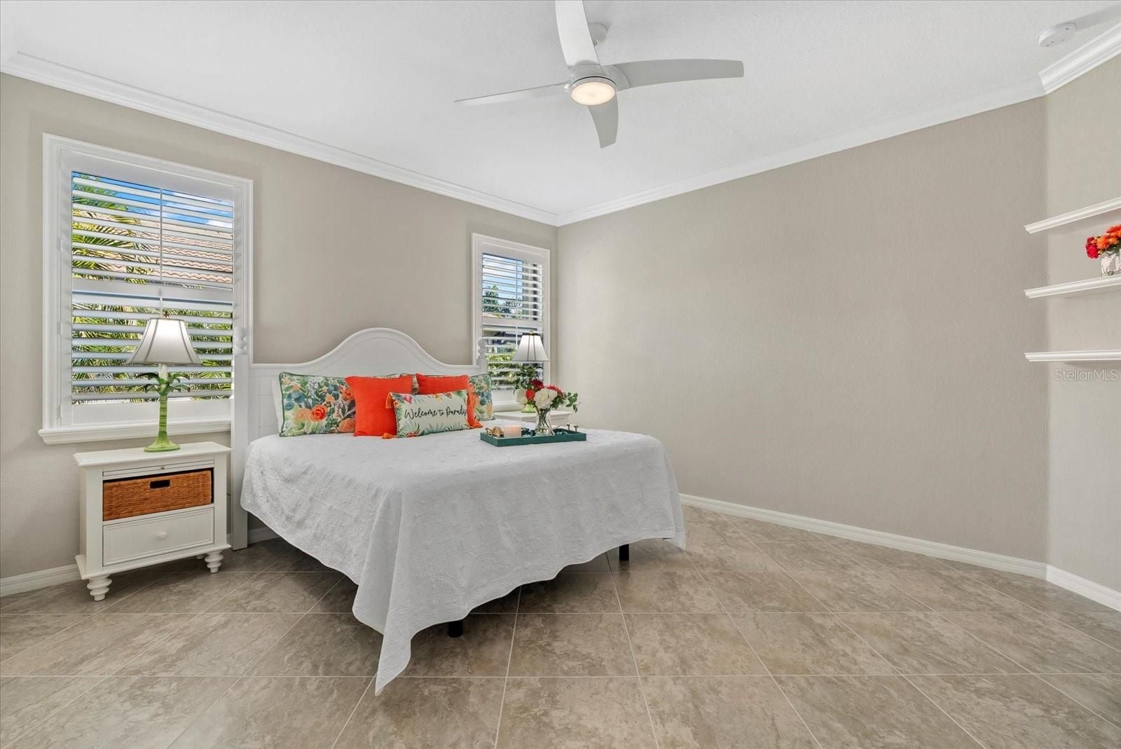 - Ceiling Fan(s), Crown Molding, Eat-in Kitchen, Kitchen/Family Room Combo, Living/Dining Room, Open Floorplan, Main Level Primary, Solid Surface Counters, Thermostat, Walk-In Closet(s), Window Treatments