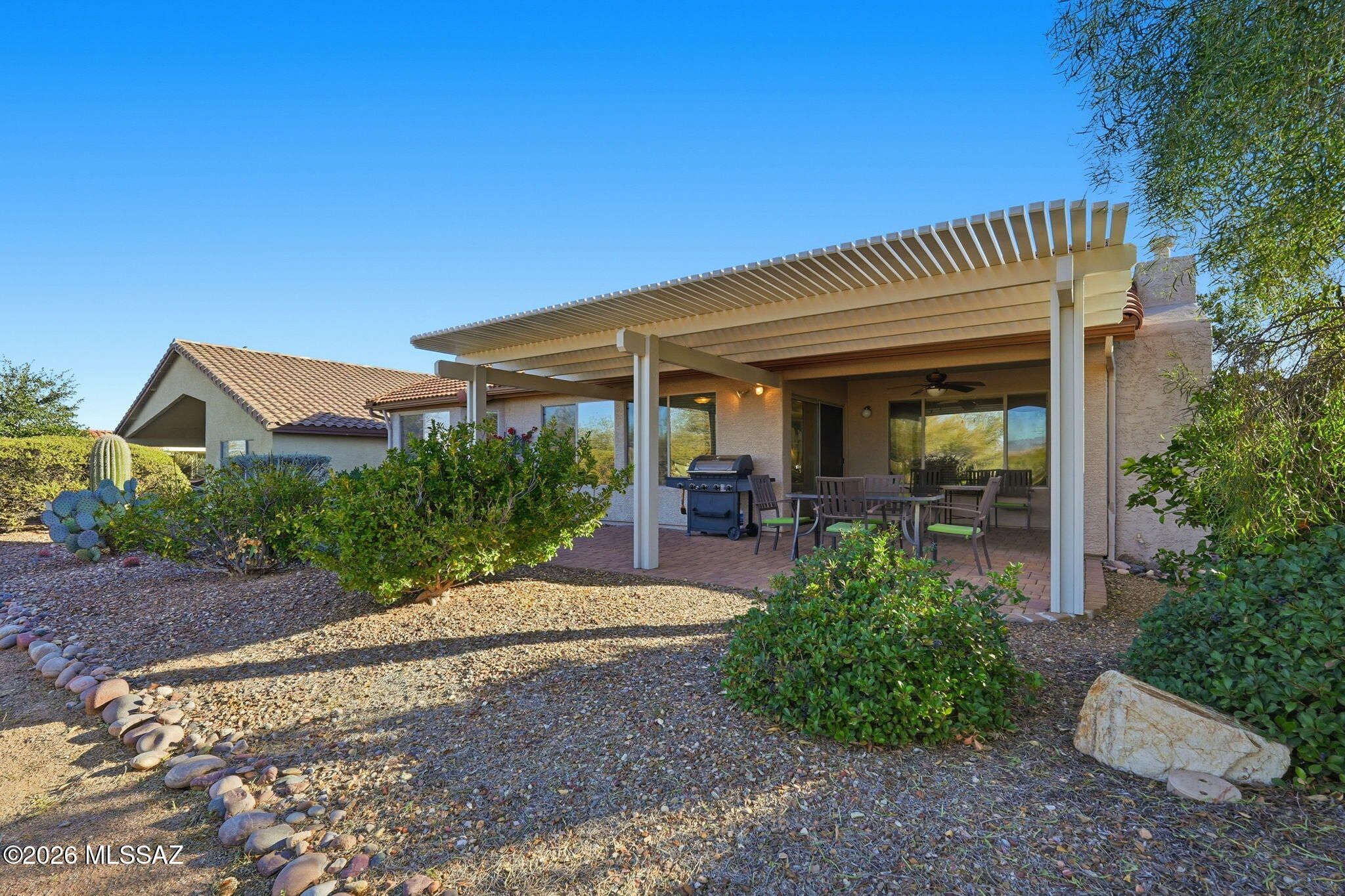 Breathtaking Golf Course Views!!! Here is the perfect winter retreat or full-time home located on the golf course in the gated, Active Adult Community of Quail Creek. Enjoy this fabulous, move-in ready 1569 sq. ft. Oakmont model. This home features 2 bedrooms, 2 baths, a den, and a 2-car garage. It's located along the 5th hole of the Coyote course and very close to all the Quail Creek amenities. The extended primary suite has a dual vanity, walk-in closet and a great view of the golf course. Features include tile floors, and matching stainless steel appliances. Stay warm and cozy while enjoying the sunset over the mountains with the custom, built-in outdoor fireplace from the west-facing rear patio. Furniture available on separate bill of sale.
