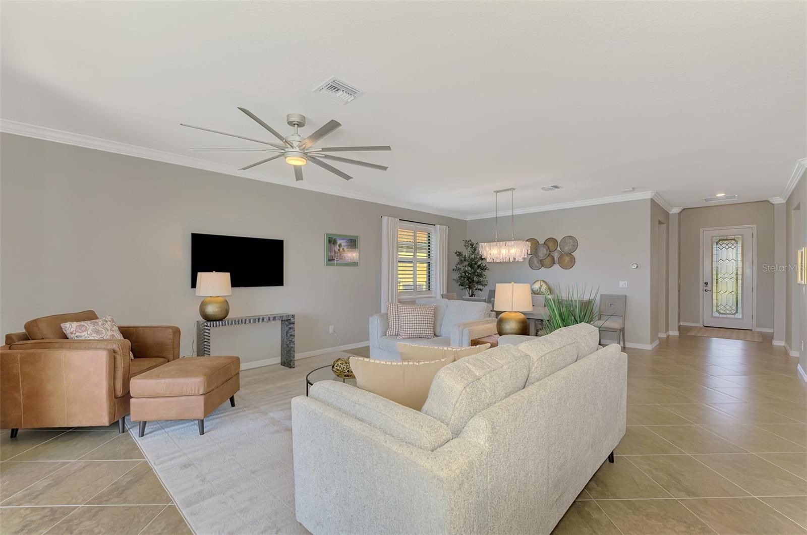 - Ceiling Fan(s), Crown Molding, High Ceilings, In-Wall Pest Control, Kitchen/Family Room Combo, Living/Dining Room, Open Floorplan, Main Level Primary, Solid Surface Counters, Stone Counters, Tray Ceiling(s), Walk-In Closet(s), Window Treatments