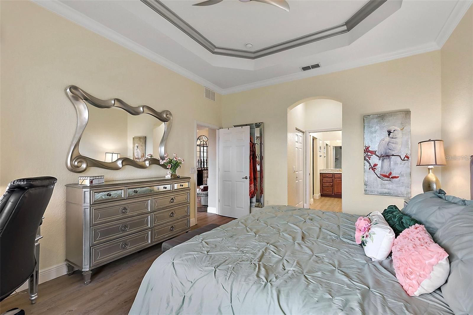 - Built-in Features, Ceiling Fan(s), Coffered Ceiling(s), Crown Molding, Eat-in Kitchen, High Ceilings, Living/Dining Room, Main Level Primary