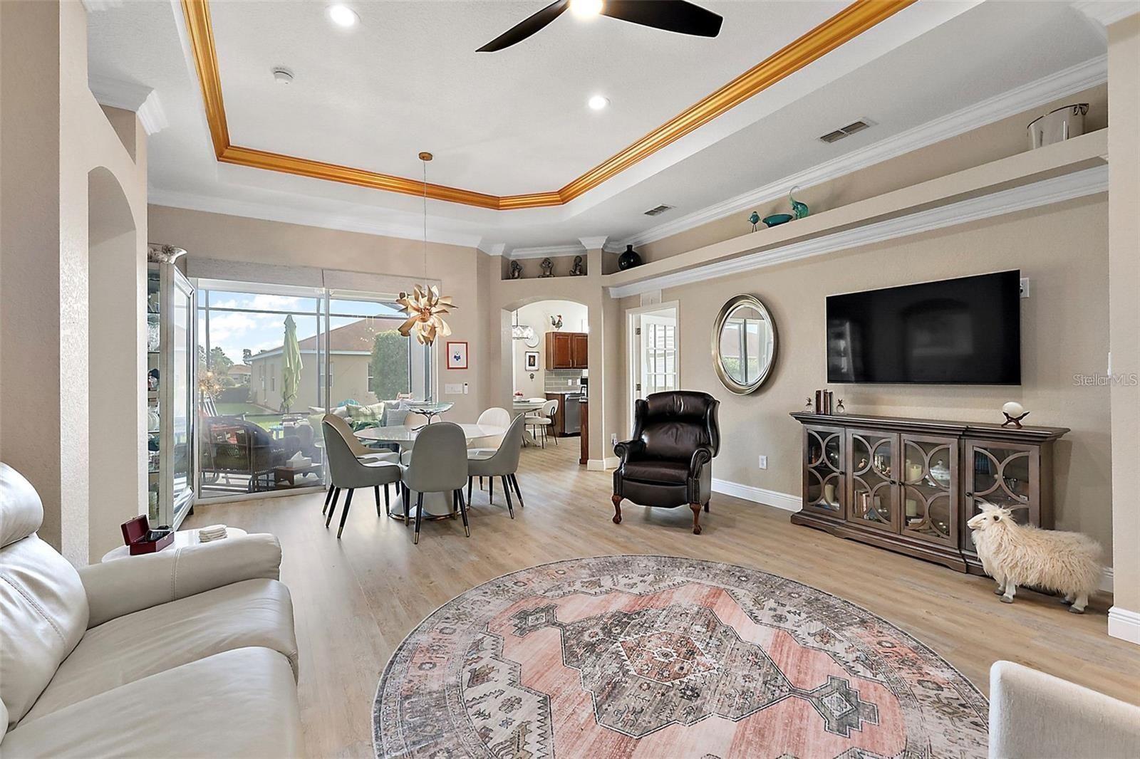 UNBELIEVABLE PRICE FOR THIS STUNNING VILLA LOADED WITH UPGRADES. Take advantage of this amazing price QUICK. Welcome to a one-of-a-kind home in Lakeside Landings, where luxury upgrades and meticulous attention to detail make this villa truly stand out. From the moment you arrive, you’ll notice the extra-wide paver driveway, elegant walkway, and screened entry with double leaded glass doors setting the tone for what’s inside. And with exterior maintenance and landscaping handled by the HOA, you can enjoy the beauty without the work! Step inside and prepare to be WOWED. Soaring volume ceilings, 5.5” baseboards, designer light fixtures, upgraded ceiling fans, exquisite crown moldings (including double gold and champagne metallic accents), and luxury vinyl plank flooring throughout create a sense of elegance in every room. Plantation shutters and power shades add both beauty and convenience. The living room is a showpiece, featuring custom architectural wood moldings and a tray ceiling, flowing seamlessly into the dining space. Off the living room, French doors open to a versatile office/den/bedroom (without a closet). The kitchen is a chef’s dream – complete with wood cabinetry, custom pantry shelving, granite countertops, subway tile backsplash, stainless steel appliances, a farmhouse sink, and sparkling crystal lighting. Retreat to the primary suite, where double walk-in closets maximize space and a luxurious en-suite offers marble shower, granite counters, dual vanities, and gorgeous upgraded fixtures. The guest bedroom and bath are equally impressive with matching upscale finishes. Outdoor living shines with an expanded 10’x26’ lanai and birdcage, featuring molded epoxy flooring, electrical, irrigation, hose bib, power shades rated for 80mph winds, and even a dedicated dog area. The laundry room includes cabinetry, granite, and a bar sink, while the garage boasts epoxy floors, built-in cabinets, shelving, and overhead storage. Peace of mind comes included with a NEW ROOF and an A/C that’s only 3 years old. This villa is practically brand new! All this is in the sought-after 55+ section of Lakeside Landings, just outside The Villages and minutes from Lake Sumter Landing. Enjoy a gated, resort-style community with a stunning clubhouse, waterfall pool with beach entry, additional neighborhood pool, pickleball, tennis, basketball, fitness center, billiards, library, ballroom, and more. Don’t wait – call today to see this exceptional villa before it’s gone.