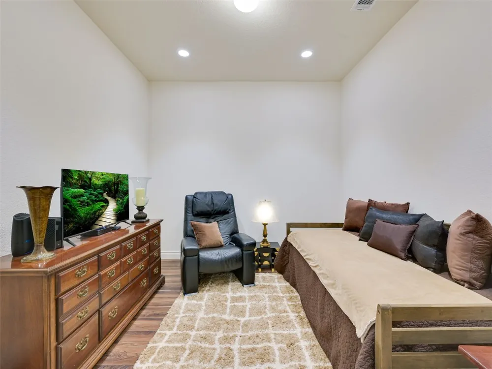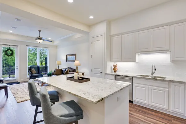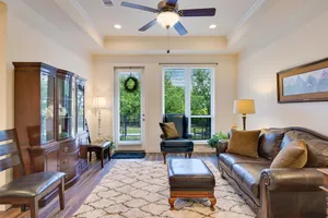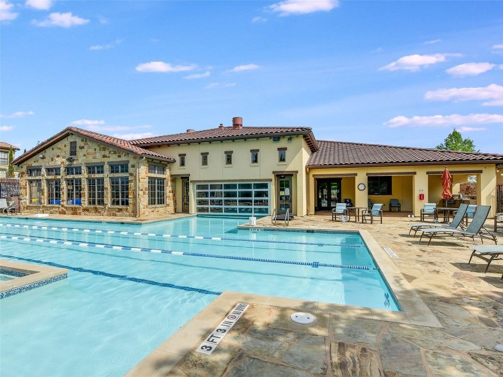 Comfortable, convenient, relaxing, luxurious and elegant but still casual define this lock and leave the sellers affectionately nicknamed "The Ritz." This rare first floor condo is nestled in the heart of Lakeway's Tuscan Village, a 55+ community. Located just inside the building's secured entrance and close to the elevator to other floors, this extraordinary unit is uniquely convenient, open, light and bright. Upon entering one is greeted with a well-designed open floor plan... beautiful kitchen with granite countertops and island, stainless appliances, significant storage, opening to living area which draws the eye to the peaceful, private fenced patio beyond... bringing the outside in. The inviting owner's suite has an abundance of natural light, a spacious bath with double vanity, walk-in shower and walk-in closet. The bonus room is perfect as TV room or guest accommodations. The location is unbeatable, close to the community library, police station, shopping, restaurants, and golf courses, as well as full-service hospital complex with broad network of medical expertise and resources. This condo has it all, including reserved parking in underground garage with personal mailbox. Community center includes large meeting/dining room, yoga studio, gym, billiards room, indoor/outdoor heated lap pool. Only a short walk to the beautiful and serene park with picnic area, pickleball court, bocce ball court, and putting green. Each of the three condo buildings has its own community space for friendship and fun gatherings. This condo is truly remarkable... a must see!