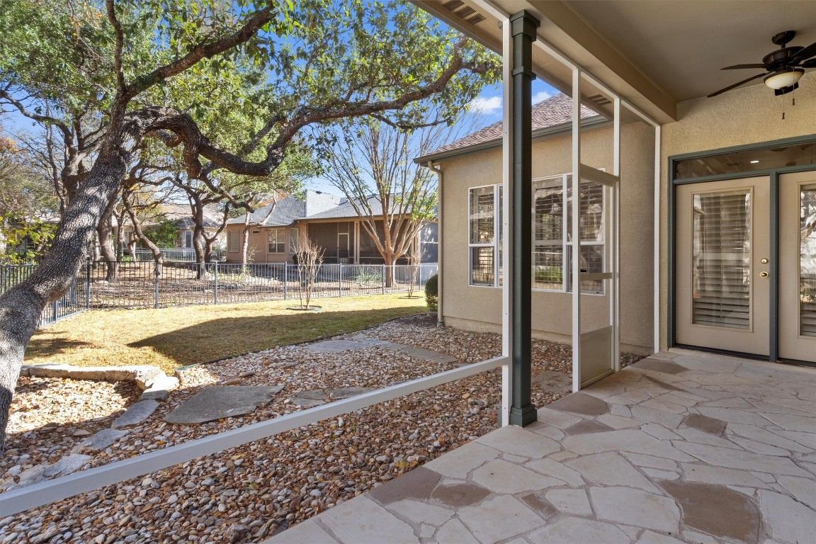 Smack dab in the heart of this active-adult Mecca, Sun City Texas, this Travis plan welcomes you with great bones and a first-class location. Immediately, you will notice the Golf Cart Garage adjacent to the Extended Two-Car Garage, practically de rigueur in a neighborhood boasting Three 18-Hole Courses! After greetings from a Front Sitting Porch, a Foyer welcomes you inside, where double doors open into the Study/Computer Room, an ideal office-at-Home. There, twin windows view the woodsy, landscaped front yard and streetscape. Ahead, tile floors form the Dining, where ten-foot ceilings (a major upgrade) add airy delight. Nearby the outsized Great Room wrapped with shuttered windows hosts a corner gas-log Fireplace, granting excess wall space for furniture placement. Shuttered French doors open to the Screened Porch, a breezy retreat viewing the wooded and fenced back yard offset from neighboring homes. Granite counter tops circle the Open Kitchen, where classic white cabinets and matching appliances add timeless good looks. A glassed-front cabinet makes an ideal Coffee Bar, while a double-door Pantry Closet will stow the goodies. Nearby, a well-placed Powder Room deems this plan ideal for Texas-sized entertaining. Off the Foyer, the king-sized Primary Bedroom touts a bay-windowed seating area, while the en suite Primary Bath hosts dual vanities, a soothing tub, separate shower and a generous Walk-In Closet. Across the home, a rear Guest Bedroom offers a bay-windowed view of the back yard, while the adjacent full Guest Bath touts a high transom window granting natural lighting. A second Guest Bedroom is also convenient to the Guest Bath. Don't miss the Laundry, where the washer & dryer are joined with a laundry sink, while plentiful storage completes the space. More wonderful storage resides in the before-mentioned jumbo Garage, where dust-proof storage will have you organized in no time! Perfectly-located, this home should make your short list.