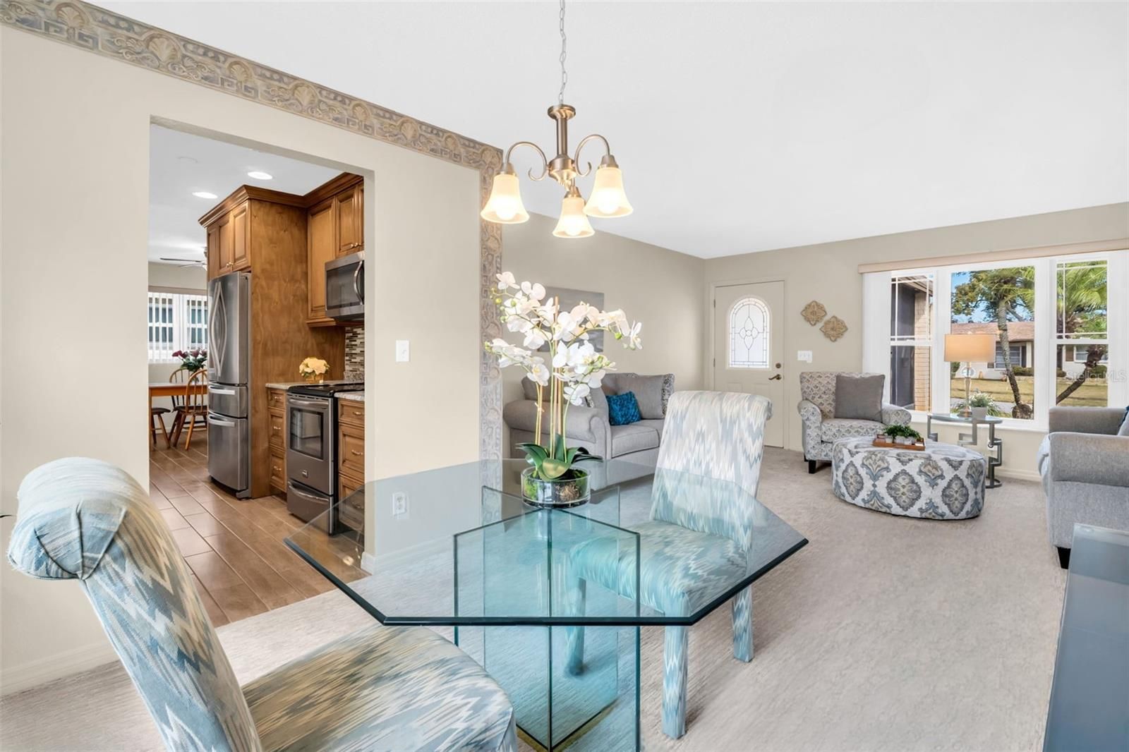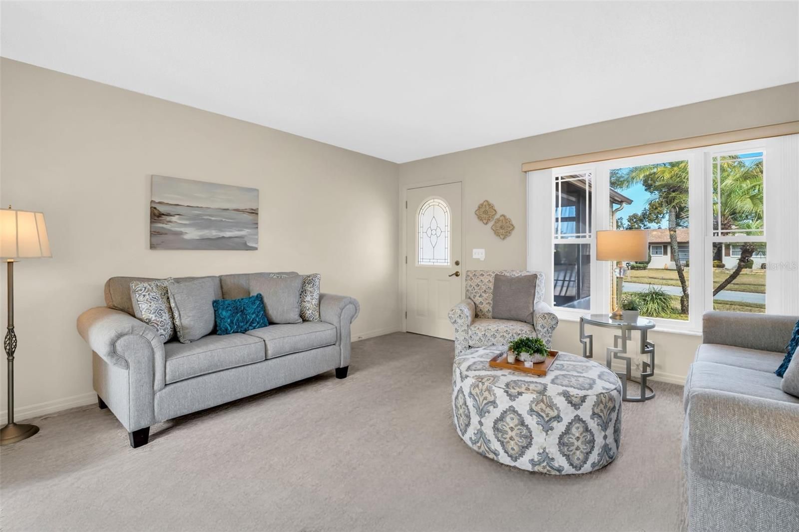 Welcome to your beautifully updated 2-bedroom, 2-bath, 2-car garage home with a sunny Florida room, perfectly positioned on a large corner lot in Palm Harbor’s premier 55+ golf community, Highland Lakes! From the moment you arrive, you’re greeted by a screened-in front lanai—ideal for enjoying Florida’s year-round sunshine—and a stunning leaded glass front door set against a freshly painted exterior. Inside, the home is light, bright, and open with updated windows that fill the space with natural light. The heart of the home is the beautifully renovated kitchen, showcasing granite countertops, solid wood soft-close cabinetry with pull-out drawers, a stylish glass tile backsplash, newer sleek stainless appliances, recessed lighting, and a convenient pass-through to the Florida room for effortless entertaining. Wood-look tile flooring flows seamlessly into the dining nook, creating the perfect space for everyday gatherings. Just beyond, the spacious Florida room is drenched in sunshine through wall-to-wall windows and features modern tile flooring, making it an inviting retreat for relaxing or hosting guests. The thoughtfully designed layout offers privacy and convenience, with a tastefully updated guest bathroom featuring a walk-in shower with glass door, granite-topped vanity, and updated lighting. The second updated hall bath with a tub/shower combo is ideally situated between both bedrooms and the main living area. Step outside to your private back patio—perfectly sized for outdoor furniture and a grill—surrounded by lush landscaping for added tranquility. Furniture is negotiable, making this home truly turn-key and move-in ready! Rest easy knowing this property sits high and dry above the flood plain in a non-evacuation zone. Major updates include an electrical panel (2019), 3-ton HVAC (2017), dual-pane windows with hurricane shutters, and more. Residents of Highland Lakes enjoy an exceptional country club lifestyle with a remarkably low HOA fee of just $164/month, including unlimited and FREE golf on three private executive courses, tennis, pickleball, bocce, and shuffleboard courts, plus a vibrant clubhouse offering entertainment, fitness classes, and social events. The lakeside lodge on Lake Tarpon features a private boat ramp, fishing pier, and community pontoon boats. Additional amenities include free RV and boat storage and a golf cart-friendly community design. Ideally located near world-class Gulf beaches, upscale dining and shopping, top-rated healthcare, major sports venues, two international airports, and a cruise port, this exceptional property offers the perfect blend of elegance, comfort, and active Florida living. Don’t miss this rare opportunity—schedule your private showing today!