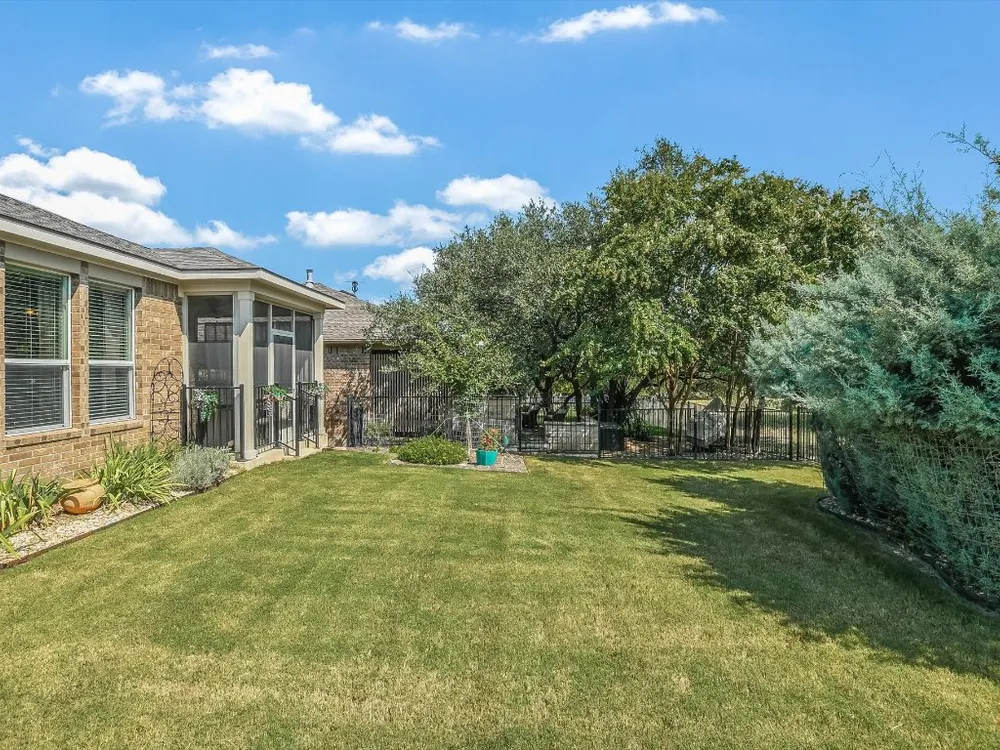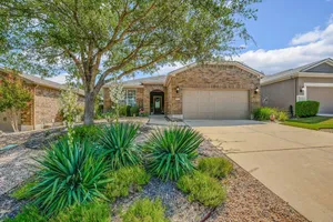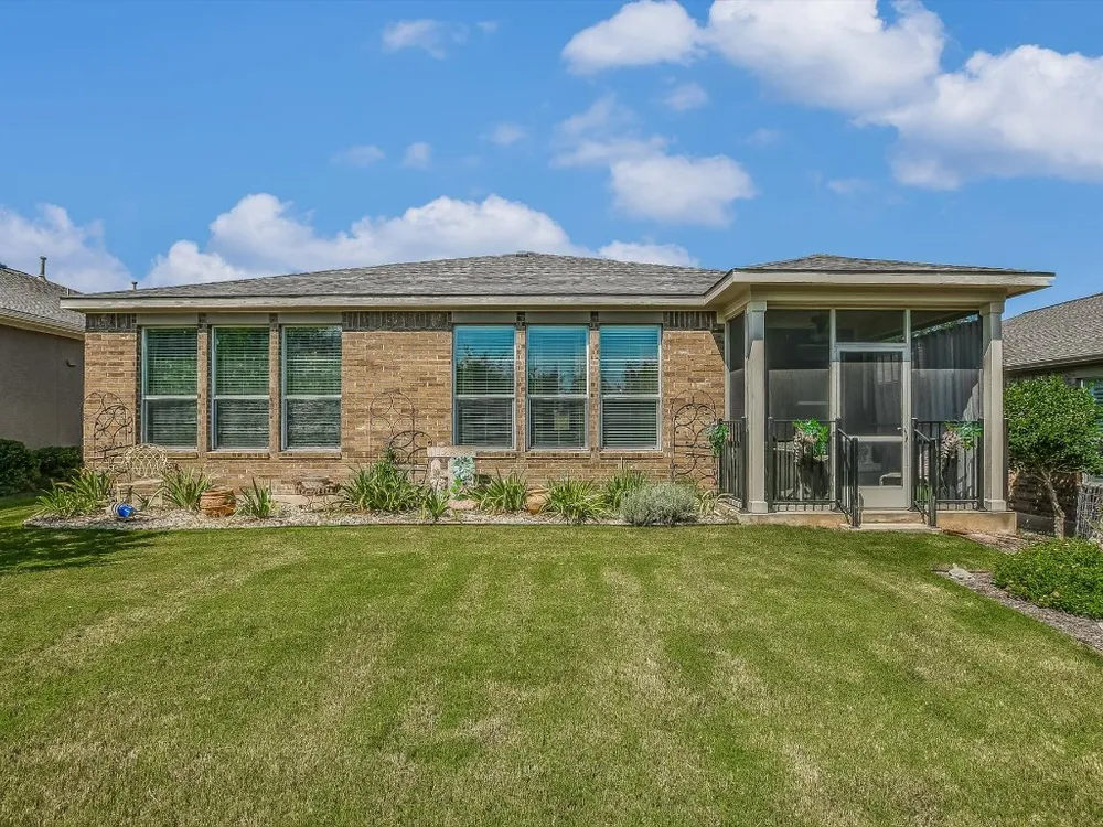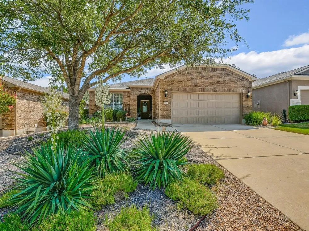 Beautiful Copper Ridge model in Sun City, TX Over 55 Community. Rare all brick exterior makes this home stand out along with the xeriscape front yard to reduce water cost and grass rear yard for pets or play. Rear is fenced on 3 sides so adding gates to finish fence is easy. This two bedroom (plus a den/office/flex room), 2 bath home with 2 car garage has an open floor plan with engineered laminate floors and crown molding for a rich interior appearance. Lovely kitchen has granite counters, newer stainless appliances, raised staggard cabinets and tear drop lighting. It also features an Upgraded Bosch Dishwasher for extra QUIET operation. The kitchen has a view to the outside through a screened, covered patio which gets welcome afternoon shade year round. The master bedroom opens to a bath with dual vanity, walk in shower and huge walk in closet. The large laundry room includes a work space/counter and a large storage closet. All this plus 2020 roof, drop down steps in garage for easy attic access and a water softener. This home has never had smokers or animals and it is value priced. Come and take a look!