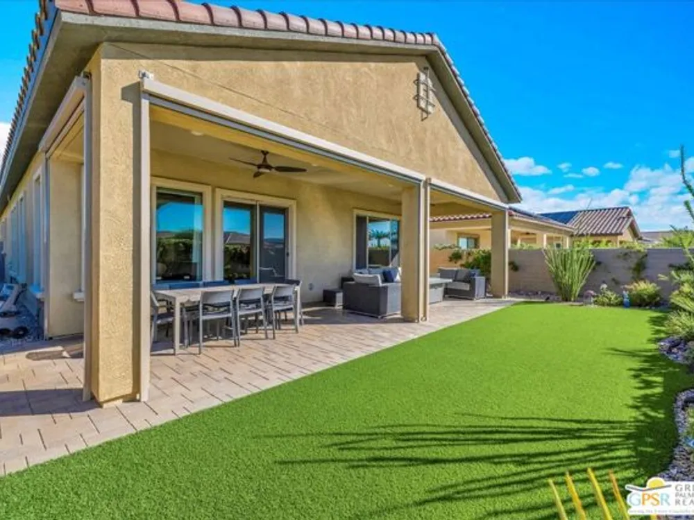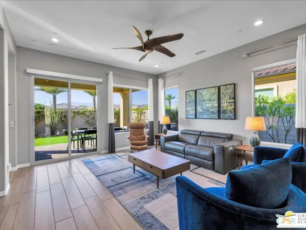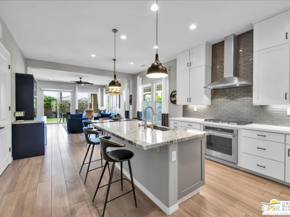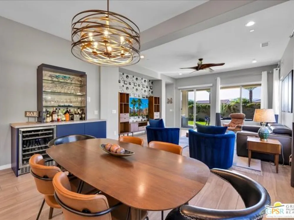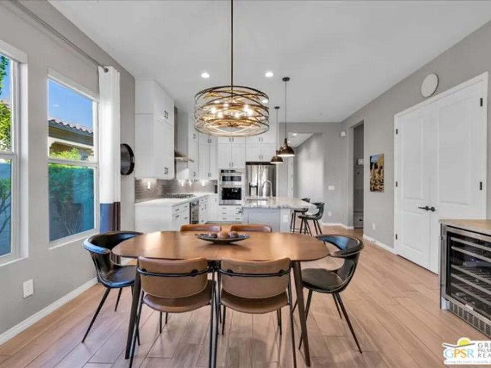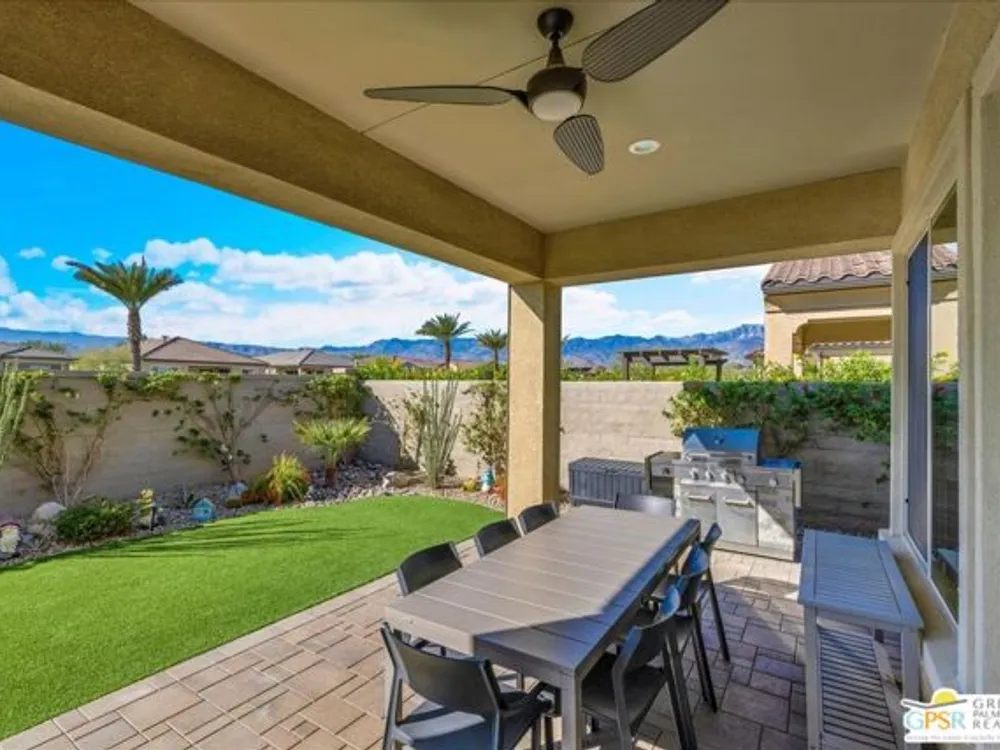 Sophisticated Living in Del Webb Rancho Mirage - Discover refined desert living in this Phase 6 Solitude floorplan with Owned Solar, offering 2 bedrooms, 2 baths, plus a versatile den/flex space - all designed with luxury and comfort in mind. Set against a backdrop of mountain views, this home features a spacious covered patio with remote zipper shades and a fully landscaped yard for effortless indoor-outdoor living. Step inside and be greeted by elegant upgrades throughout, including wood-look plank tile flooring, high-end Minka ceiling fans, upgraded LED lighting, and custom window treatments. The open-concept kitchen is a chef's dream with a professional appliance package including dual ovens, upgraded soft-close cabinetry with dovetail joints, 42" upper cabinets AND Jewel cabinets with crown molding, a full glass tile backsplash, and a large granite island with space for seating accented by hand-selected pendant lighting. The adjoining dining and living spaces are elevated with a designer chandelier and a custom built-in bar with wine fridge - perfect for entertaining. The expansive primary suite offers a serene retreat with upgraded LED lighting, a spa-inspired ensuite featuring dual sinks, a low-threshold walk-in shower with bench seating, designer mirrors with sconce light