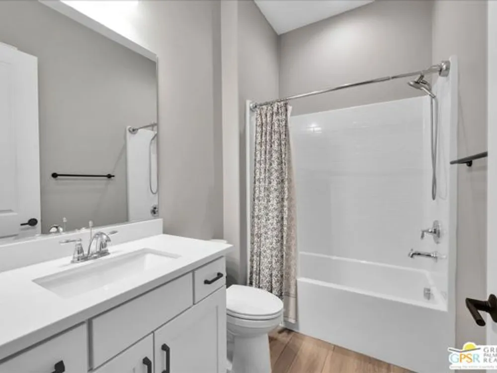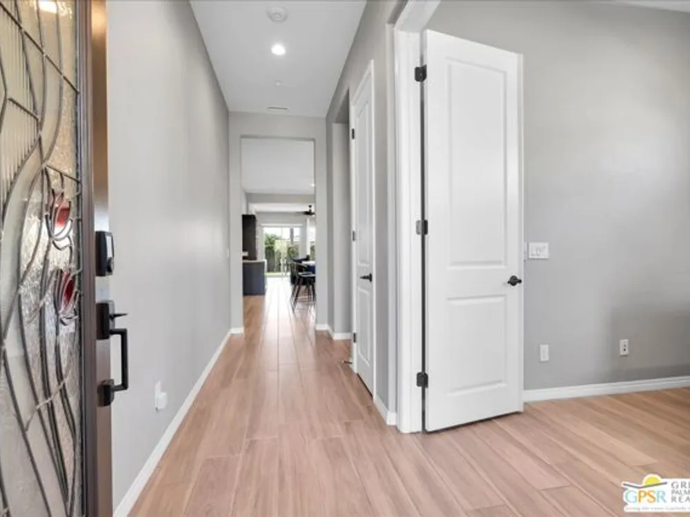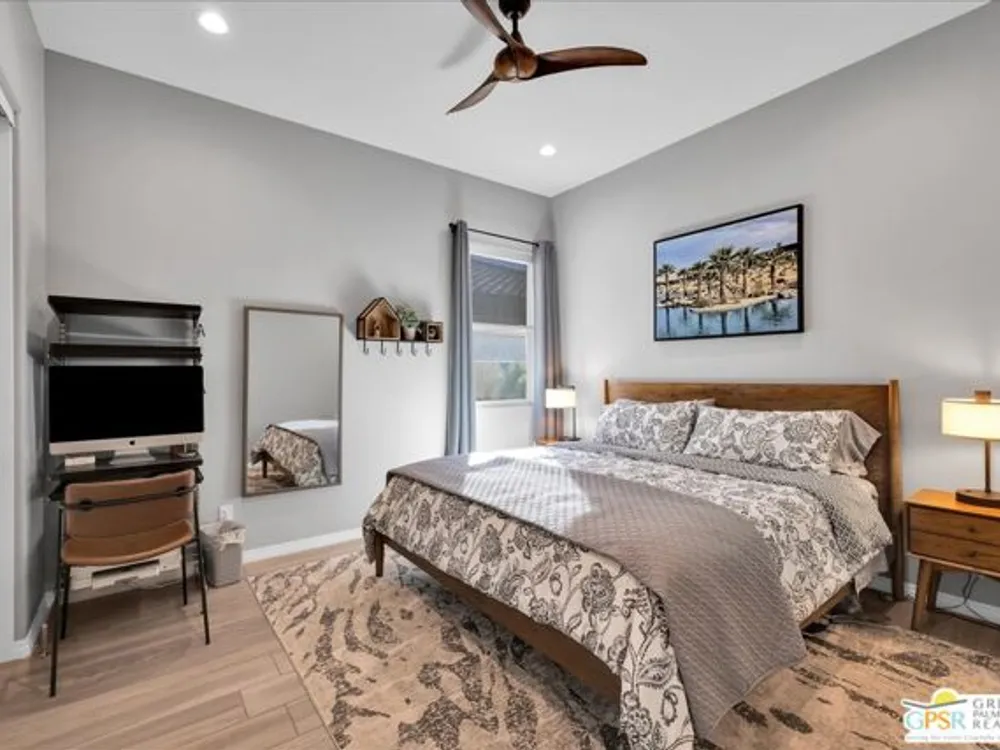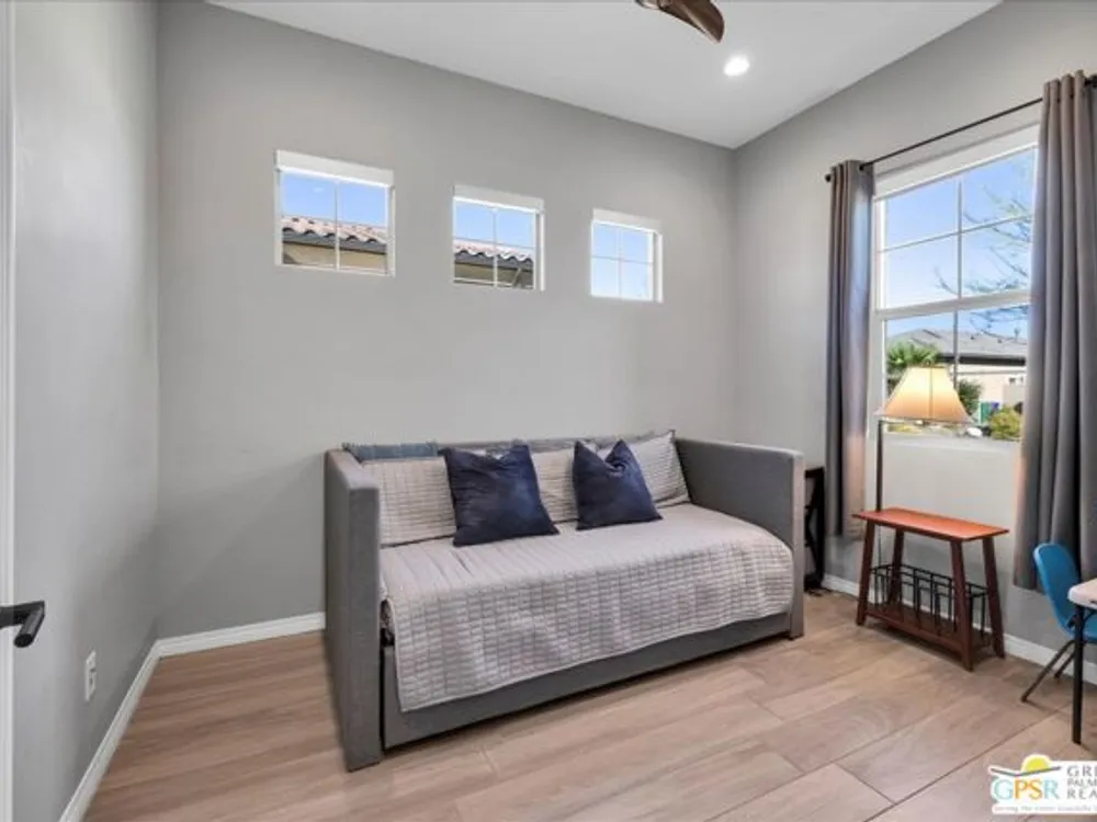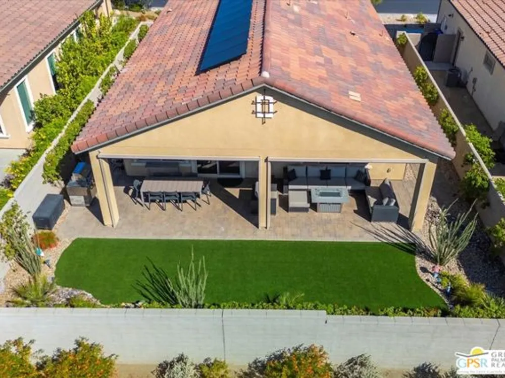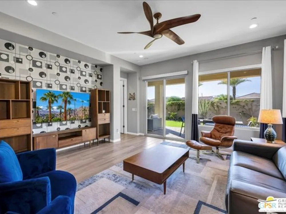 Sophisticated Living in Del Webb Rancho Mirage - Discover refined desert living in this Phase 6 Solitude floorplan with Owned Solar, offering 2 bedrooms, 2 baths, plus a versatile den/flex space - all designed with luxury and comfort in mind. Set against a backdrop of mountain views, this home features a spacious covered patio with remote zipper shades and a fully landscaped yard for effortless indoor-outdoor living. Step inside and be greeted by elegant upgrades throughout, including wood-look plank tile flooring, high-end Minka ceiling fans, upgraded LED lighting, and custom window treatments. The open-concept kitchen is a chef's dream with a professional appliance package including dual ovens, upgraded soft-close cabinetry with dovetail joints, 42" upper cabinets AND Jewel cabinets with crown molding, a full glass tile backsplash, and a large granite island with space for seating accented by hand-selected pendant lighting. The adjoining dining and living spaces are elevated with a designer chandelier and a custom built-in bar with wine fridge - perfect for entertaining. The expansive primary suite offers a serene retreat with upgraded LED lighting, a spa-inspired ensuite featuring dual sinks, a low-threshold walk-in shower with bench seating, designer mirrors with sconce light