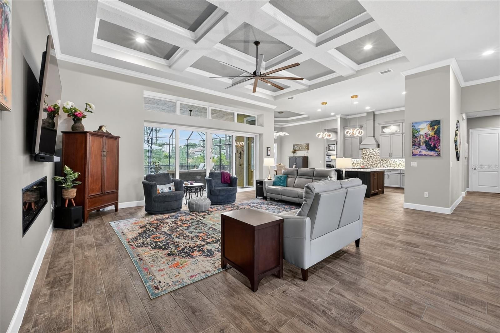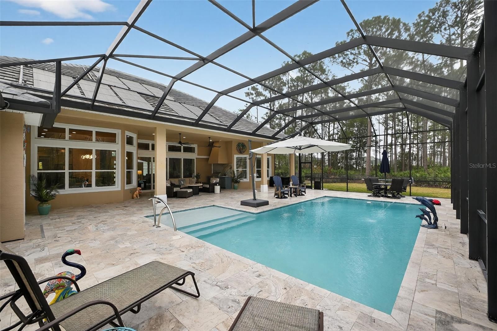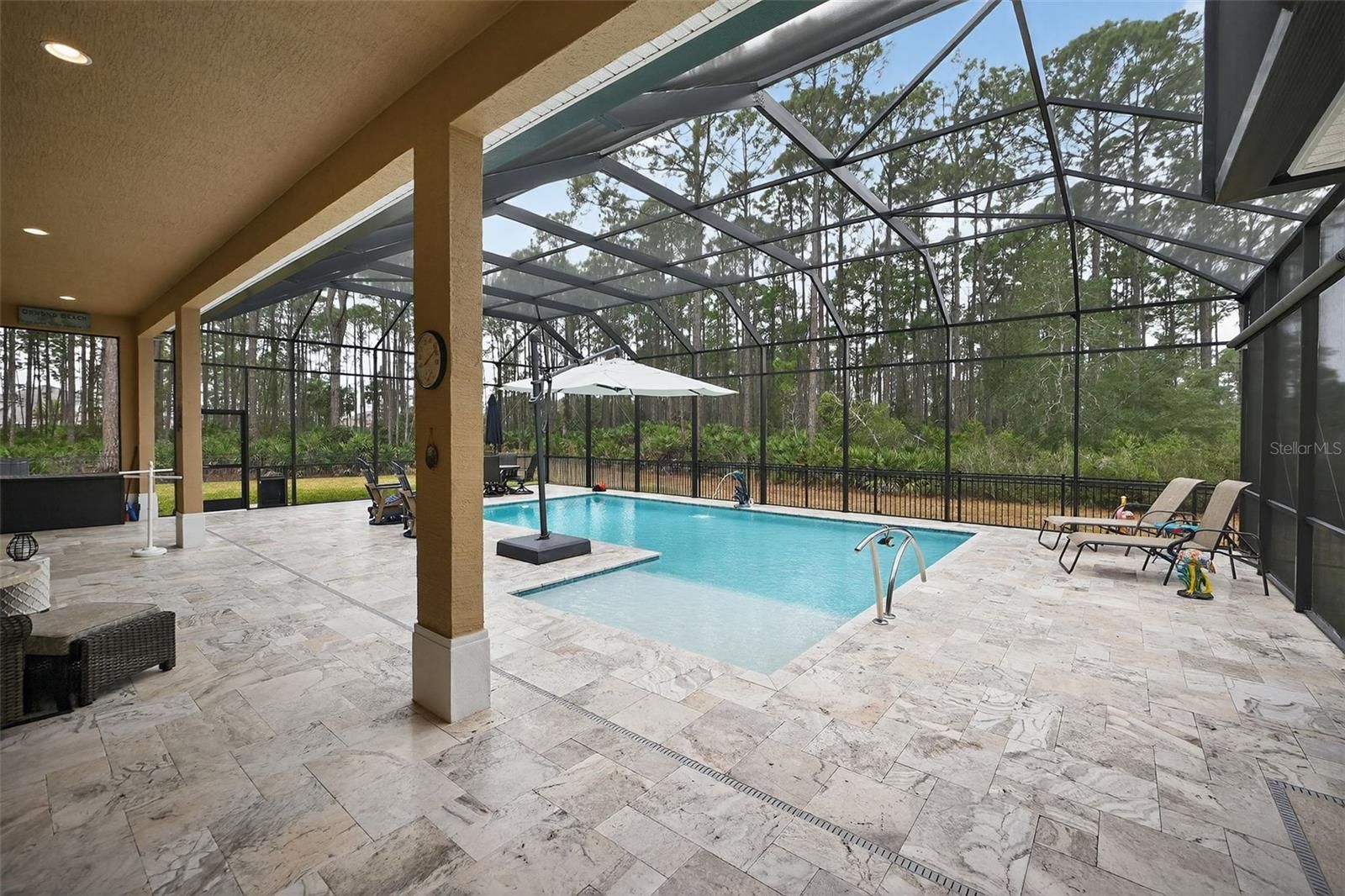 Remarks: Exquisite Luxury & Modern Resilience in Ormond Beach. Welcome to 1020 Sudbury Lane, a stunning architectural masterpiece completed in 2022. Spanning 3,359 square feet on an expansive .78-acre lot, this 4-bedroom, 3.5-bathroom estate (plus a large office or 5th bedroom) perfectly blends sophisticated design with unparalleled functionality and peace of mind. Grand Entrances & Ample Space: From the moment you arrive, the scale of this property is evident. The home features an extended three-car side-load garage and a massive, oversized driveway capable of hosting guests with ease. Step through the double front doors into a grand interior defined by 10-12' ceilings and sleek porcelain tile that flows seamlessly throughout the entire residence. The Heart of the Home: ?Gourmet Kitchen: A massive custom island with integrated cabinetry on all sides, a dedicated coffee station, and premium finishes. Elegant Details: Coffered ceilings in the living room and tray ceilings in the dining area, primary suite, and breakfast nook. Ambiance: A cozy, remote-controlled electric fireplace serves as the centerpiece for the main living area, complemented by a functional "stop and drop" station in the laundry room. Your Private Screened Oasis: The outdoor living space is a true resort-style retreat, fully screened-in for year-round comfort and featuring high-end travertine decking and a fenced-in yard: The Pool: A massive, shimmering pool featuring a tranquil fountain, a sun deck, and integrated underwater barstools. Privacy & Comfort: A large umbrella provides shade over the water, while the pool cage is equipped with an automatic privacy screen. The outdoor kitchen makes poolside entertaining effortless. Primary Suite & Guest Comfort Primary Sanctuary: Includes his and hers custom closets and a spa-like bathroom with a zero-entry shower and a free-standing soaking tub. High-End Finishes: Every bathroom features shower tile to the ceiling. Every room is equipped with ceiling fans and custom blinds (with remote-controlled shades in the primary suite). Unmatched Infrastructure This home was built for total peace of mind: Power Security: A whole-house generator supported by a 500-gallon buried propane tank (fully owned). Modern Utility: A large dedicated office provides the perfect workspace or can easily serve as a 5th bedroom.