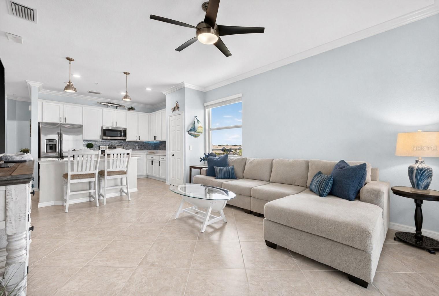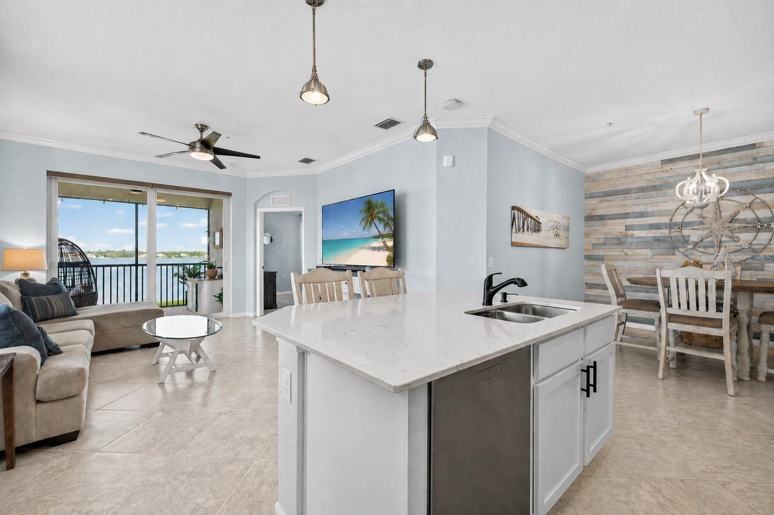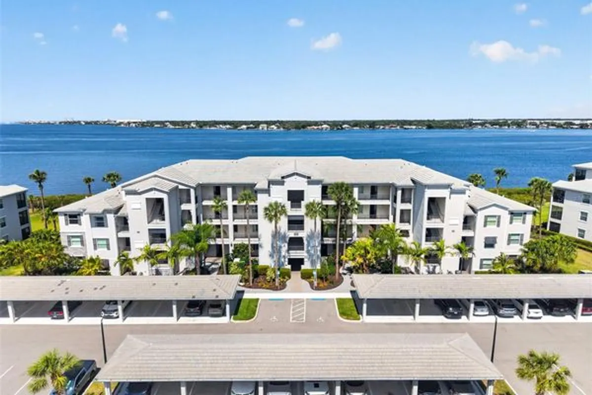 Wake up to sweeping panoramic views of the Manatee River from this rarely available top-floor, westerly-facing end-unit in the exclusive gated community of Tidewater Preserve. This top-floor residence has the highly sought-after Carolina floor plan with a private elevator in the building. It offers three bedrooms, two baths, and an open-concept design that allows for breathtaking water views from most of the unit. With no neighbors above, soaring ceilings, and an abundance of natural light, this unit delivers the rare sense of space and serenity that defines Florida living at its finest. As the sun sets, the residence transforms: the sparkling downtown Bradenton skyline glimmers on the horizon, dolphins glide through the water below, boaters cruise along the river, and there are front-row views of Fourth of July fireworks over the river every year. Expansive sliding glass doors open to a screened balcony — equipped with no-see-um screens and a roll-down shade — offering a private outdoor space to savor the vibrant sunsets. Inside, thoughtful upgrades reflect a refined coastal aesthetic: new lighting, upgraded hardware, upgraded ceiling fans, a striking coastal wood accent wall, and a soft, cohesive color palette throughout. Plush neutral carpeting anchors the primary and secondary bedrooms, while the third bedroom features durable vinyl wood plank flooring. The kitchen has shaker cabinets with quartz countertops, stainless steel appliances, and a sleek glass backsplash. Smart home features include an integrated door lock system, Ring doorbell, and smart thermostat. The primary bedroom has striking views out to the Manatee River as well as two closets and a generously-sized primary bathroom. The hurricane-rated windows throughout provide both storm protection and energy efficiency, while biannual HVAC servicing since 2020 ensures the home has been meticulously maintained. Residents can enjoy Tidewater Preserve's resort-caliber amenities: a private marina with direct access to the Manatee River and the Gulf beyond via a covered boat lift, two clubhouses, three pools, two fitness centers, outdoor grill stations, a playground, a dedicated dog park, tennis courts, a kayak/canoe/SUP launch with storage, a scenic riverfront nature trail, and an on-site lifestyle director. Maintenance-free living is truly effortless here, with HOA fees covering lawn care, landscaping, water, sewer, trash, flood insurance, internet, and an expanded cable package. This unit comes with an assigned covered carport parking spot just outside the building. This location is hard to beat and you can also hop in the car and head to some of the top-rated beaches in the country. Come see this beautiful unit today with some rarely seen views out to the Manatee River.