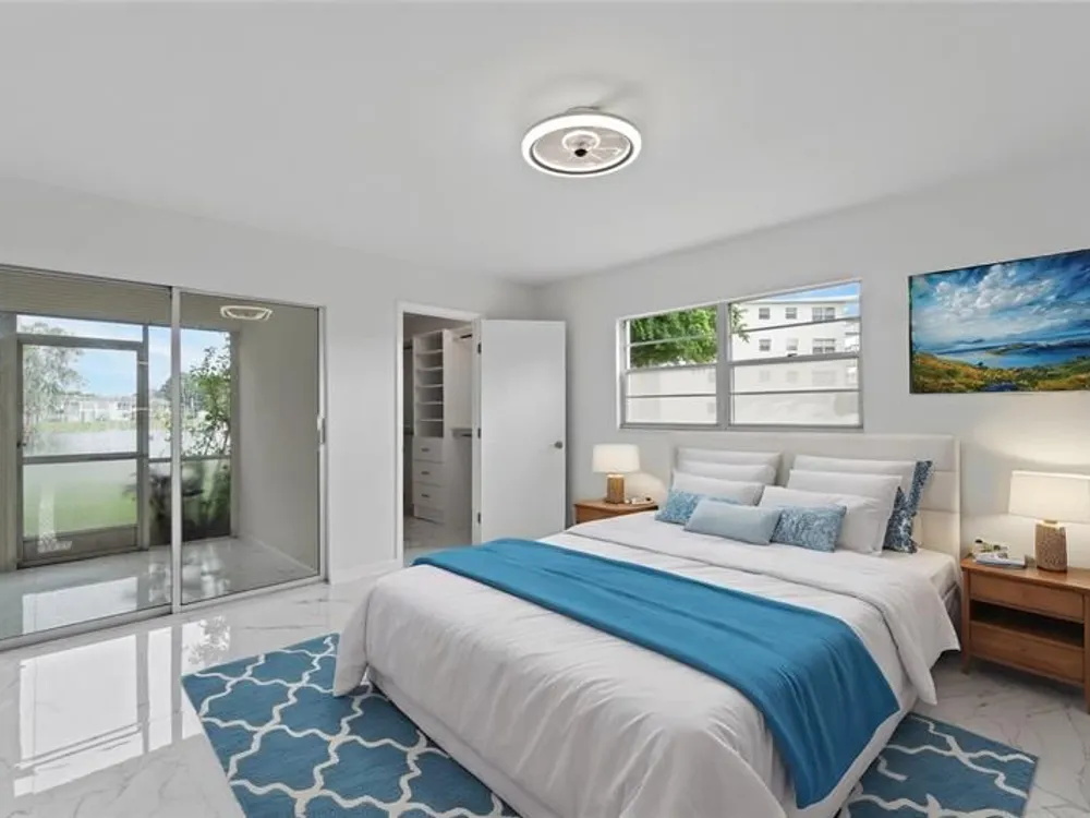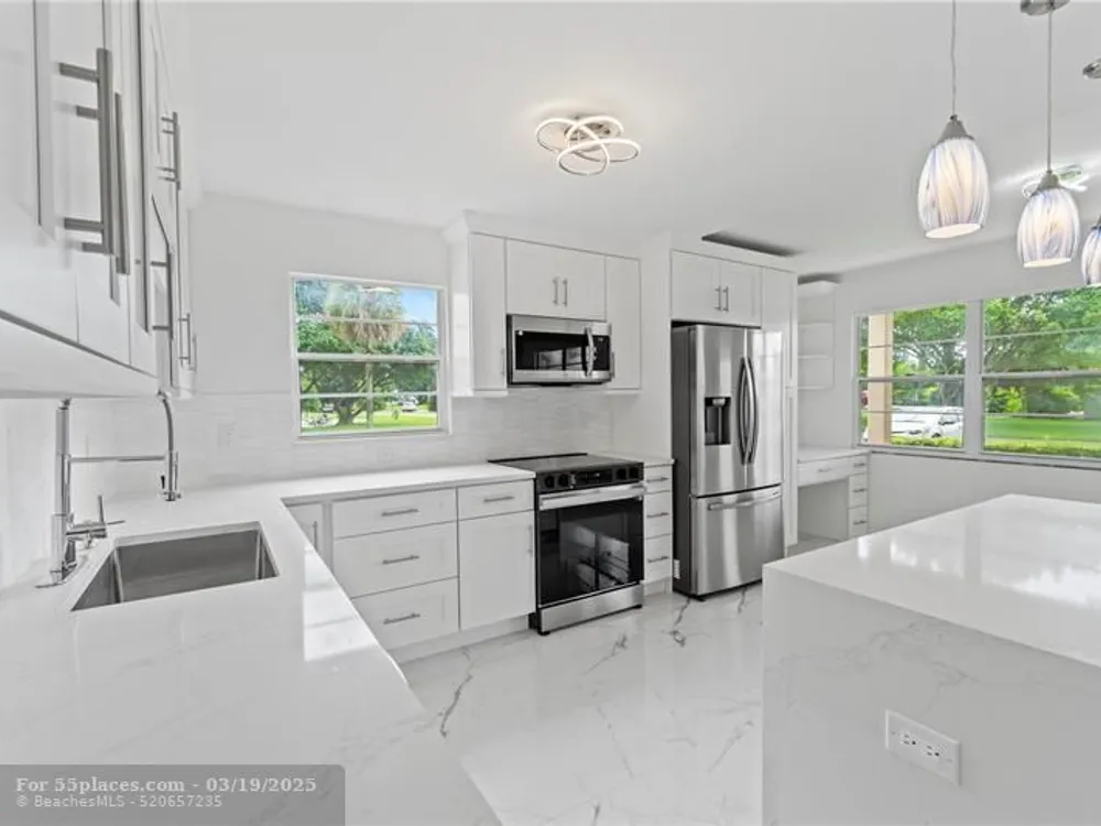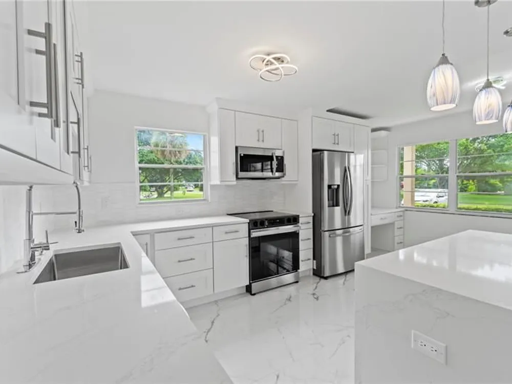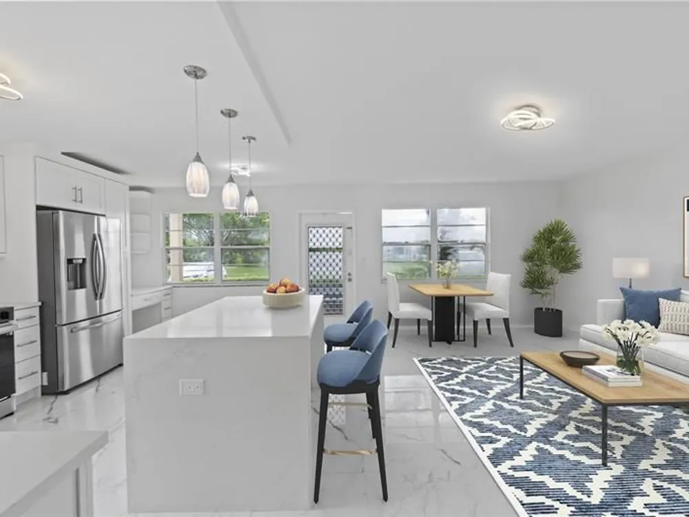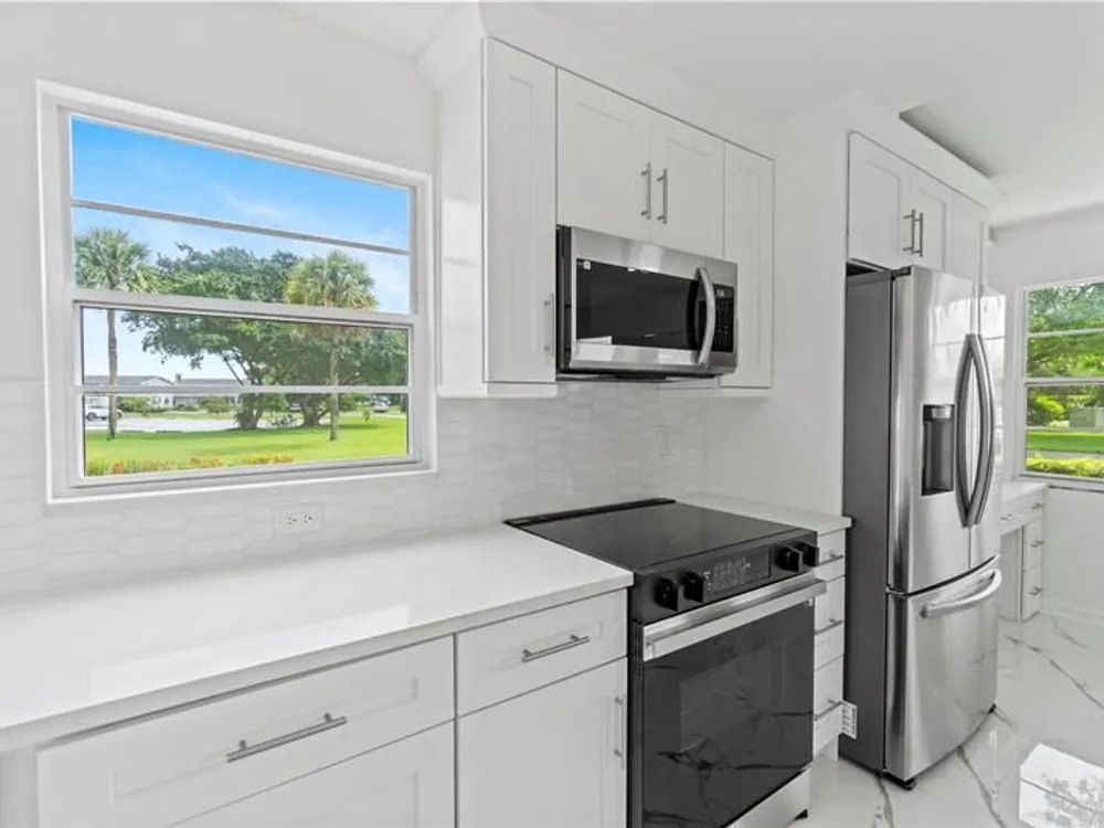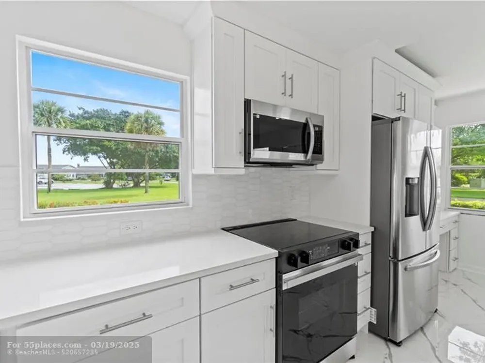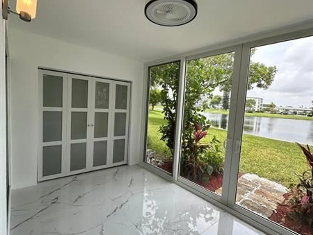 BRAND-NEW IMPACT SLIDING GLASS DOOR INSTALLED, Expanding the Bright Porch Room with a Custom Garden Backyard, Ideal for Outdoor Enthusiasts. Enjoy The Serene Lake View for Relaxing or Entertaining. This Stunning, Fully Renovated 2-Bed, 2-Bath Corner Unit On The First Floor With Lake View Features Tile Flooring Throughout, Custom Closets, Central Air In Both Bathrooms With Extra Fans, Drop Ceiling In Open-Concept Kitchen With Desk Area, Top-Tier Appliances, Waterfall Countertop, Lazy Susan, And Custom Lighting. Premium Fixtures In Kitchen And Baths. Located In A 55+ Resort-Style Community Just 10 Minutes From The Beach—Fitness Center, Sauna, Theater, Pickleball, Pools & More. All Cash