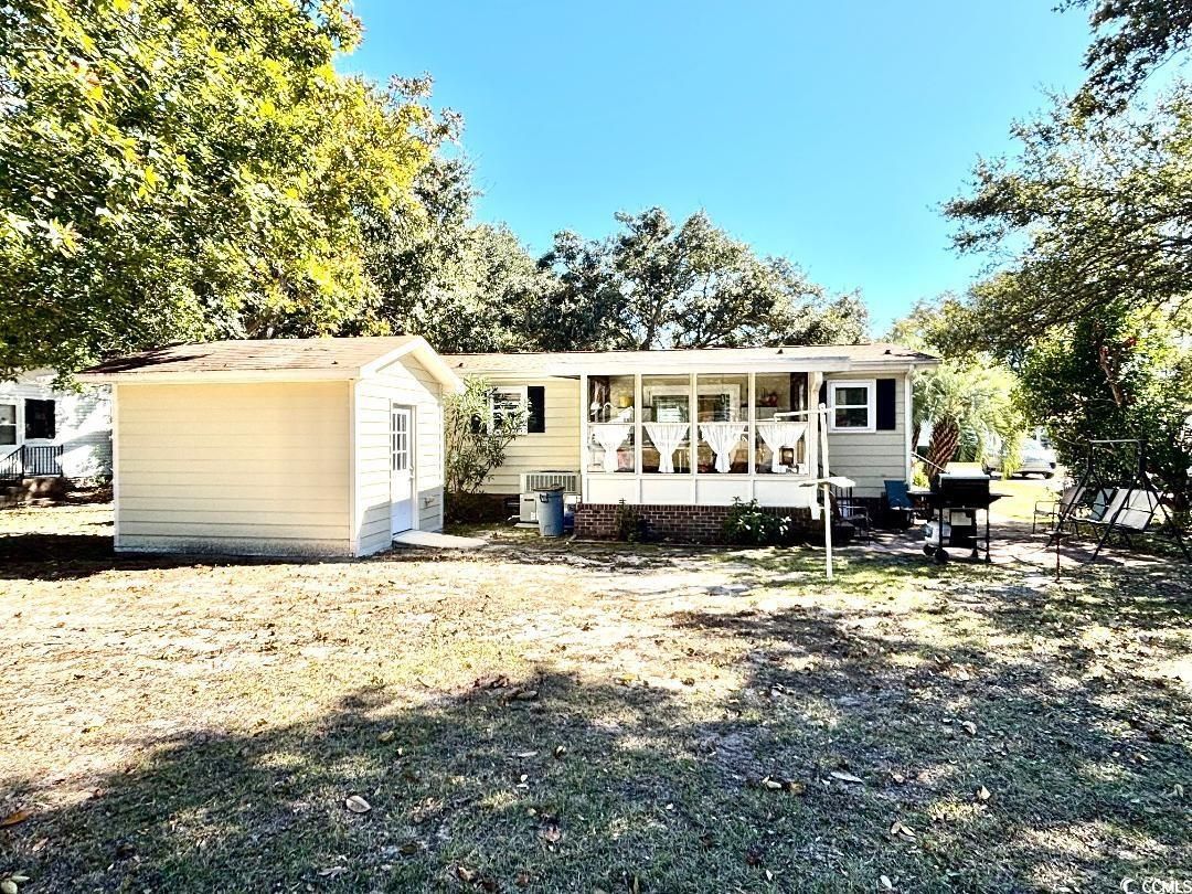 Charming and well-maintained 2BR/2BA home featuring an open, light-filled floorplan. Spacious living area flows seamlessly into the dining area and updated kitchen, creating a perfect space for everyday living or hosting guests. Kitchen features crisp white cabinetry, solid-surface counters, a center island, and plenty of storage. Both bedrooms are spacious and cozy, offering comfortable retreats for rest and relaxation. The primary bath includes a large walk-in shower with glass doors and updated finishes. A dedicated laundry area, well-kept flooring throughout, and thoughtful touches like neutral paint tones and classic trim make the home feel clean, fresh, and truly move-in ready. Bright, enclosed sunroom with heating and cooling, and a spacious brick patio are perfect for relaxing or outdoor entertaining. Detached 10X12 storage shed/workshop with power. Short walk to pool and clubhouse. Primary residence, vacation home, or investment property, this home is the perfect blend of charm, comfort, and convenience.
