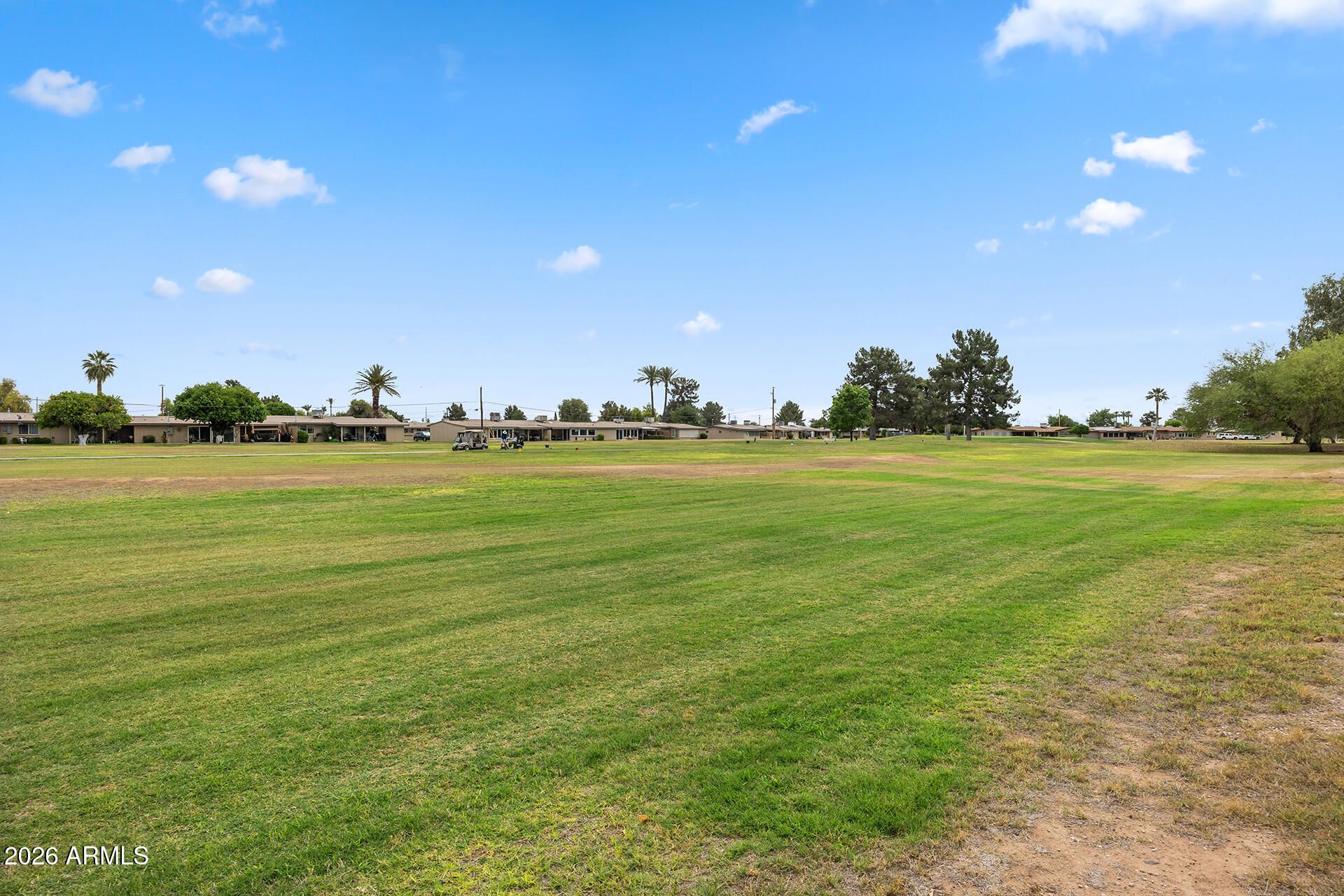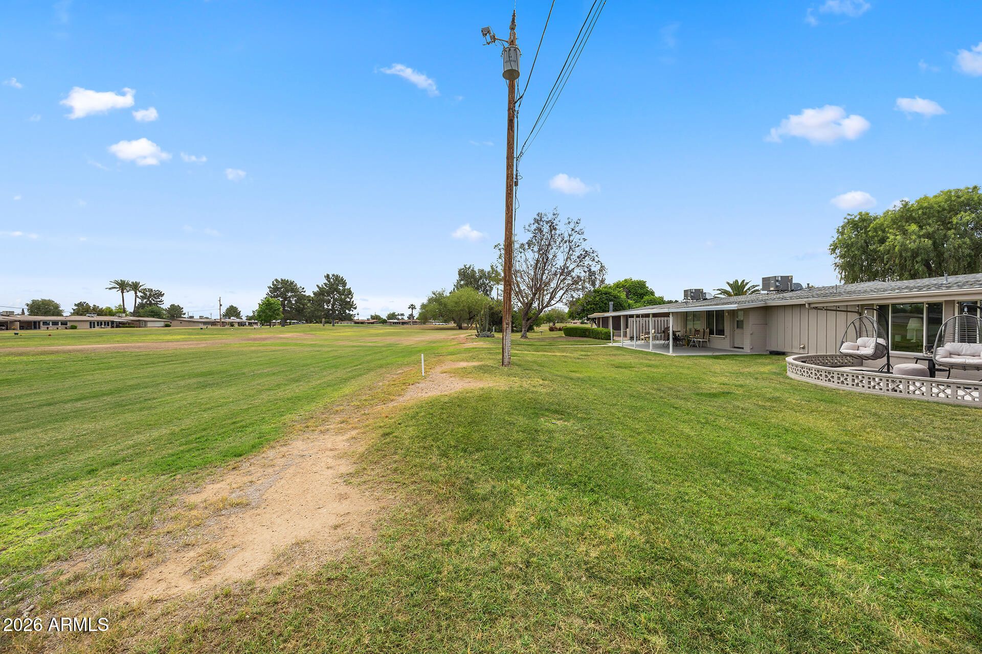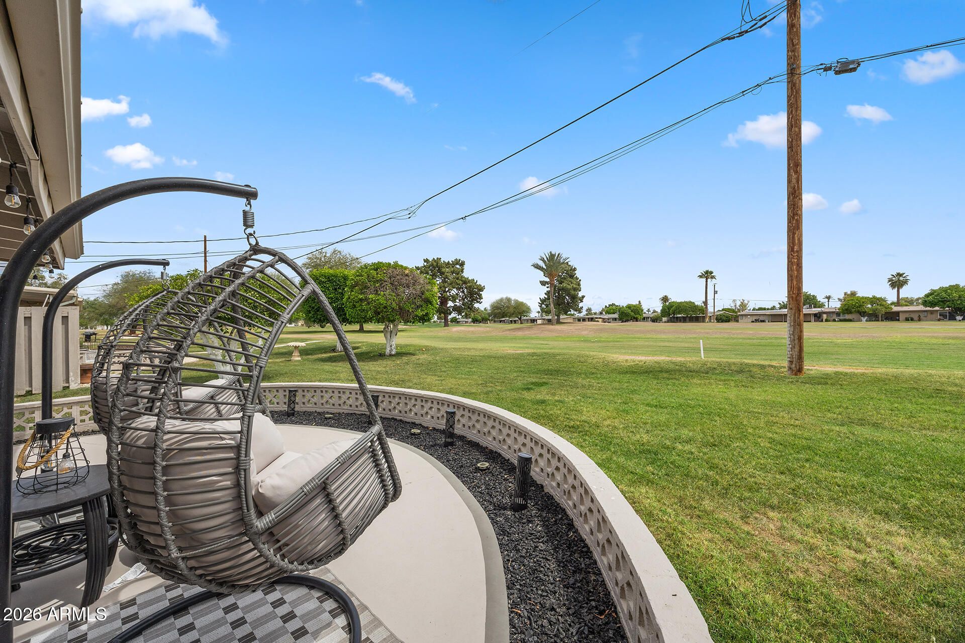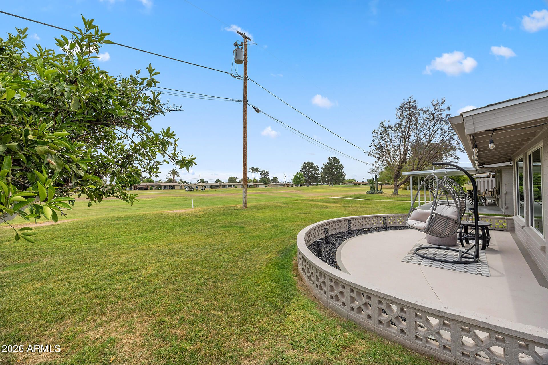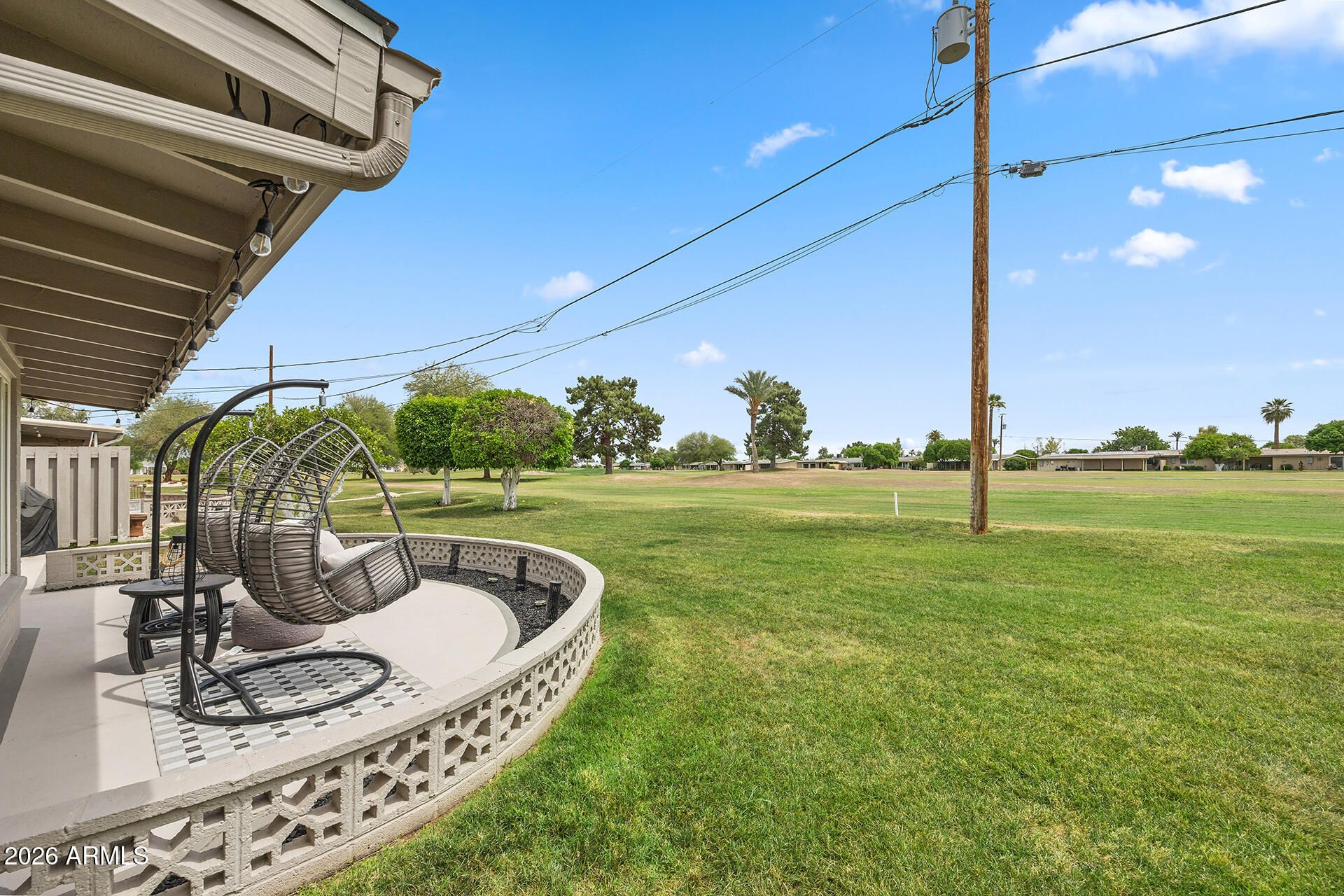 Backyard East-facing sitting directly on the golf course - the kind of lot position that's hard to find in this neighborhood and impossible to manufacture. Morning light floods the main living areas, and the view from the patio is open fairway. The home has been comprehensively updated. Kitchen is all-new - cabinets, countertops, and appliances. New carpet and pad throughout the living areas, double-pane vinyl windows, new slider, new front door with security door, fresh interior paint and outside, and an epoxy garage floor. This isn't a cosmetic refresh; it was done right. Mechanicals are current: HVAC replaced in 2020, and the HOA just completed a full roof replacement in April 2026 - so the buyer walks in with zero deferred maintenance on the two items that matter most. HOA also covers exterior paint and ongoing maintenance, keeping long-term ownership costs predictable. Sun City amenities include 8 recreation centers, multiple pools, pickleball, tennis, bowling, and 8 public golf courses. Convenient to Banner Boswell Medical, shopping, and the 101. 55+ community. One designated parking space. Pets per HOA rules.